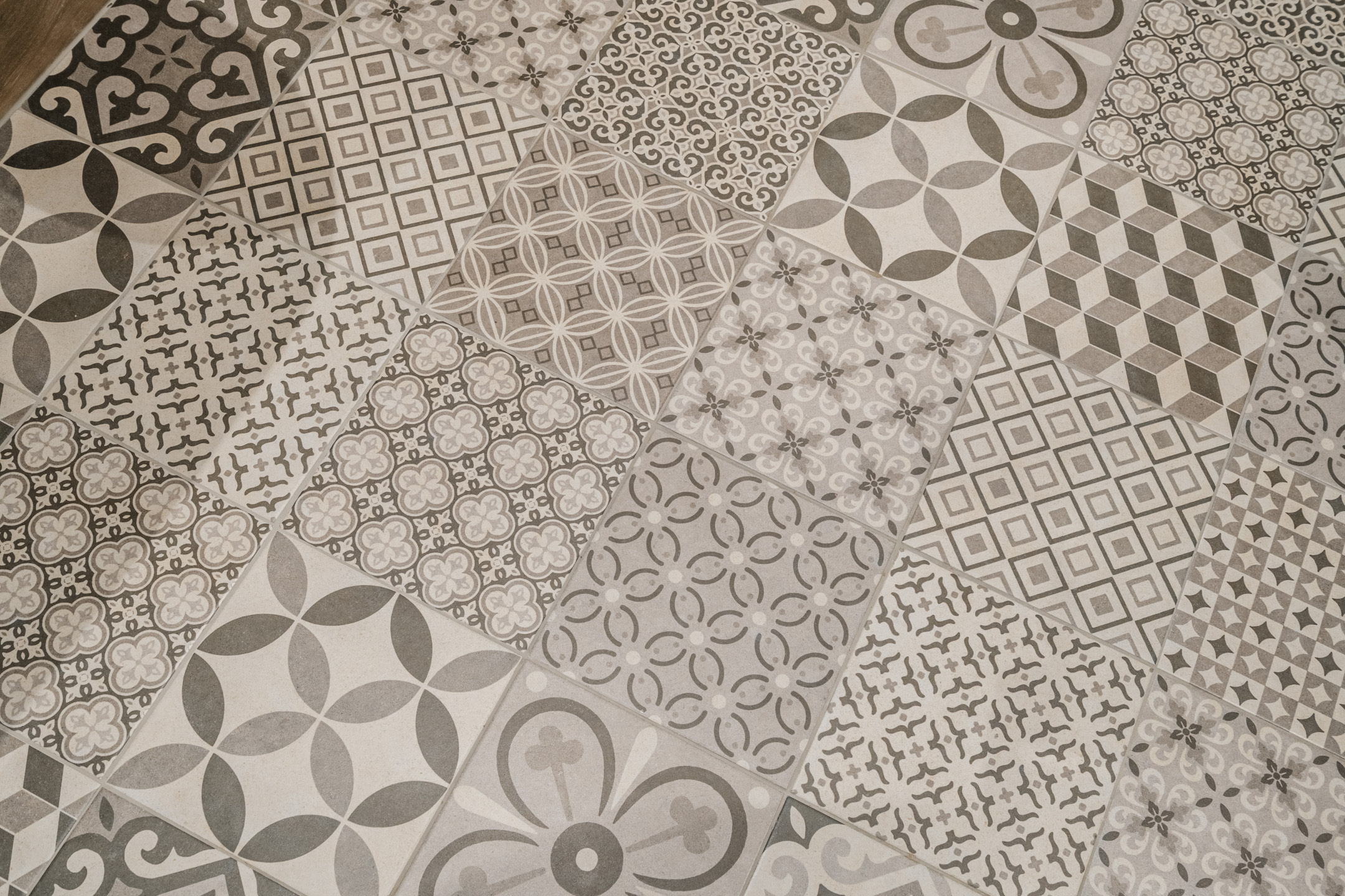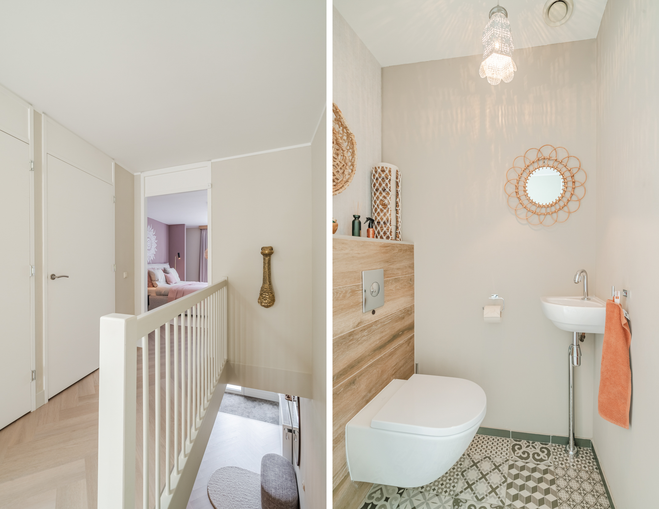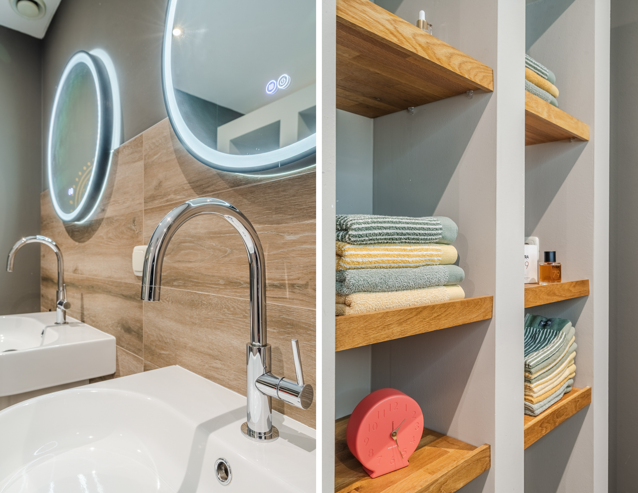 De stijlvolle badkamer (ca. 3,29 x 2,66) is afgewerkt met een combinatie van houtlook tegels, witte wandtegels en karaktervolle Portugese vloertegels. De ruimte beschikt over een royale inloopdouche, twee hangende wastafels, verwarmde spiegels met verlichting, mechanische ventilatie, een elektrisch verwarmingspaneel en een praktische inbouwkast voor handdoeken.