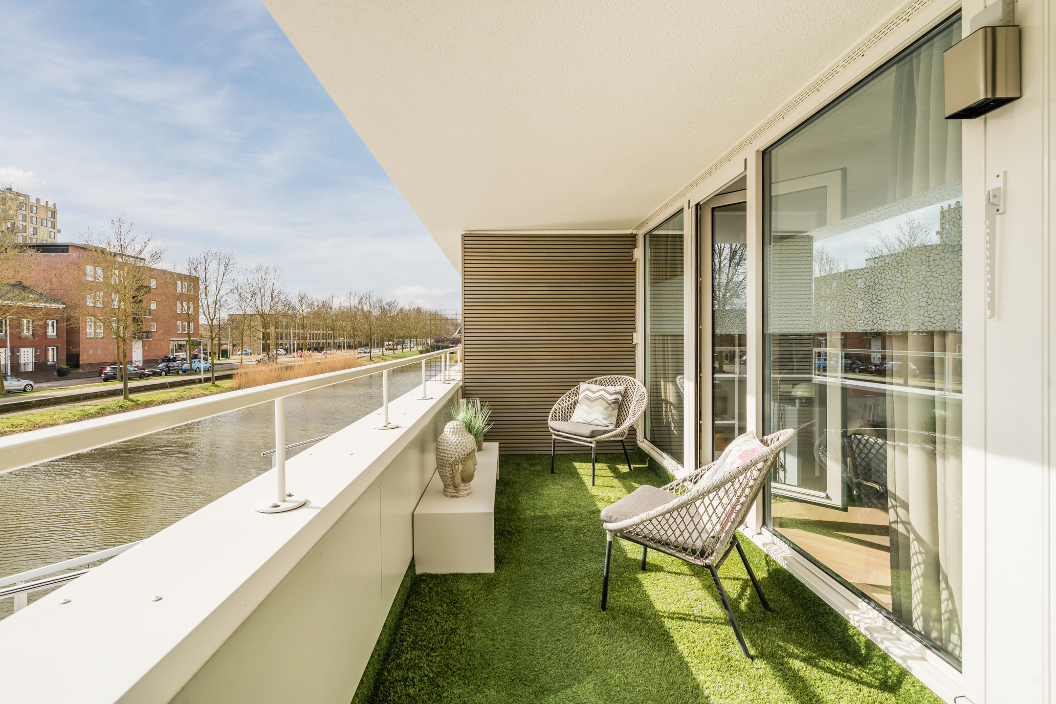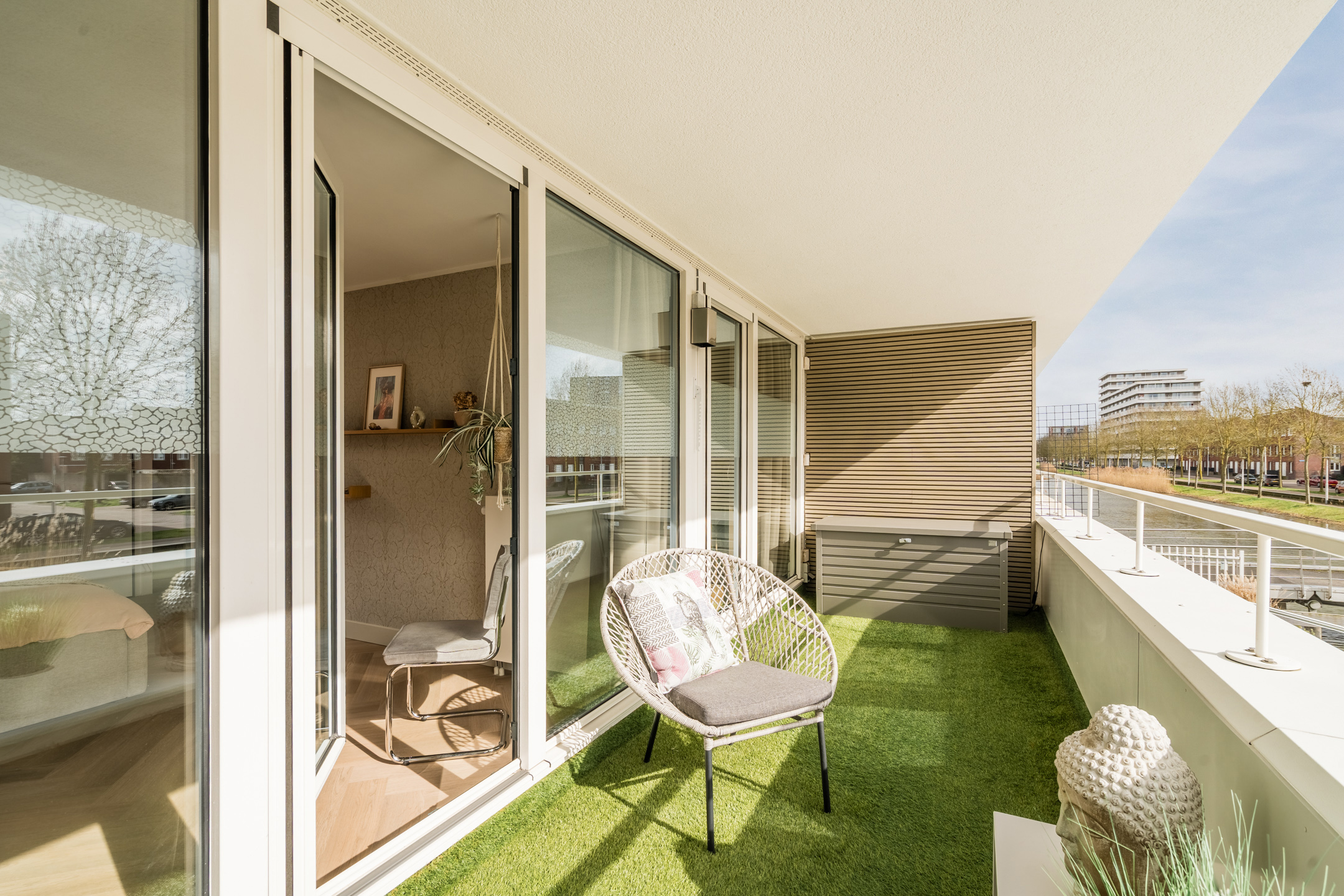 Aan de achterzijde bevinden zich twee slaapkamers (ca. 20 m² en 10 m²), waarvan één met een fraaie lichtkoepel. Beide kamers hebben toegang tot het overdekte balkon over de volledige breedte van de woning. De grote ramen zorgen overal voor veel daglicht en een prettig uitzicht.