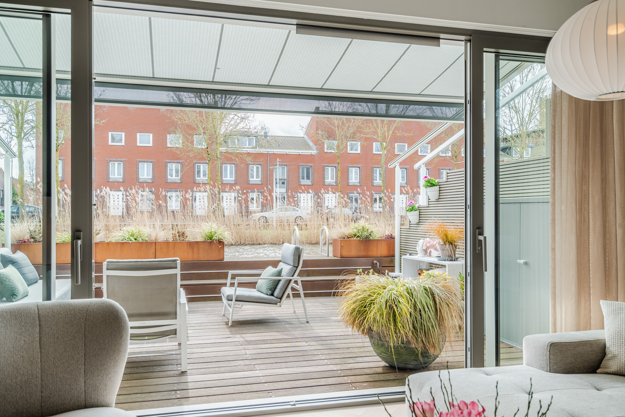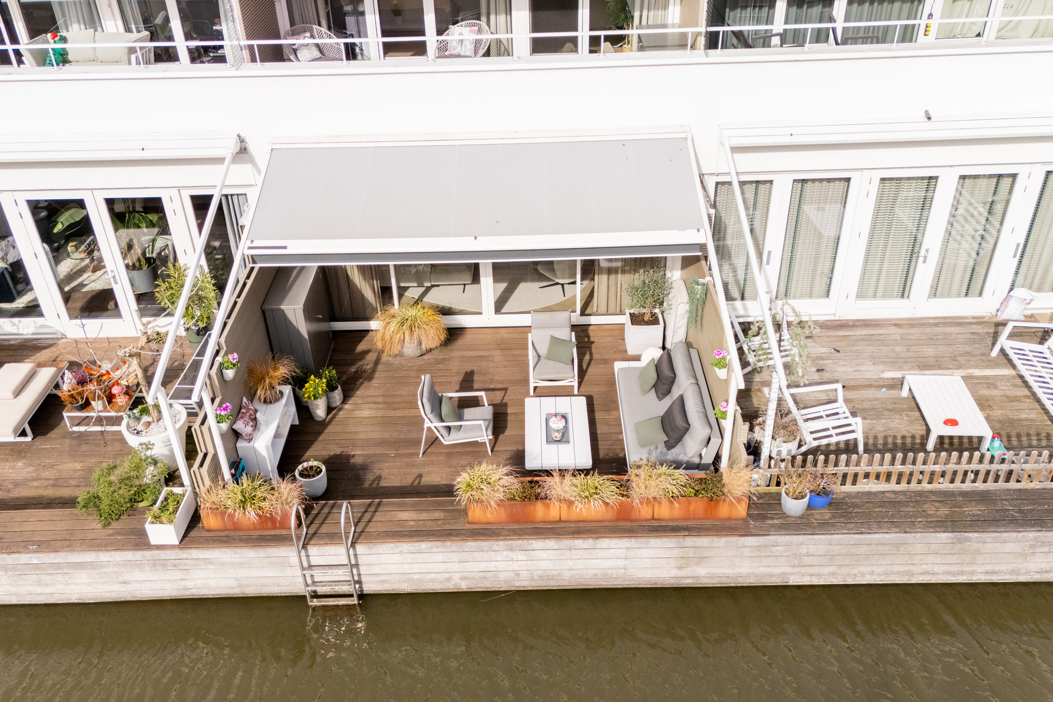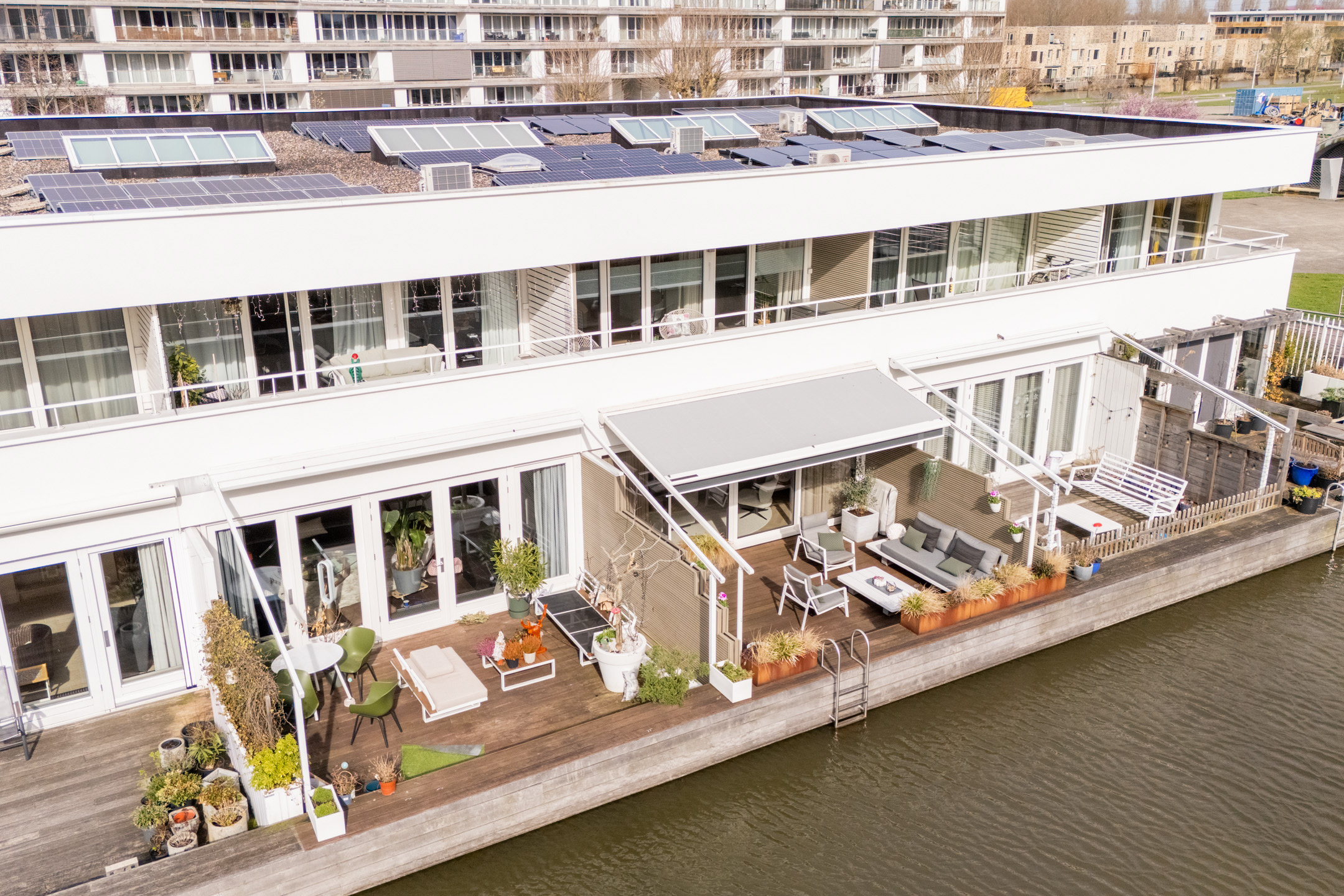 Via de brede, vierdelige schuifpui loopt de woonruimte naadloos over in het zonnige terras (ca. 5,19 x 5,86), gelegen op het zuidwesten. Het terras grenst direct aan het water van het waterwingebied Terwijde, waardoor je hier het gevoel hebt op een luxe woonboot te verblijven. De volautomatische pergola met zowel horizontale als verticale zonwering zorgt voor optimaal comfort. In de zomer neem je een verfrissende duik of vaar je zo weg met een bootje; in de winter geniet je van het uitzicht of schaats je misschien zelfs voor de deur.