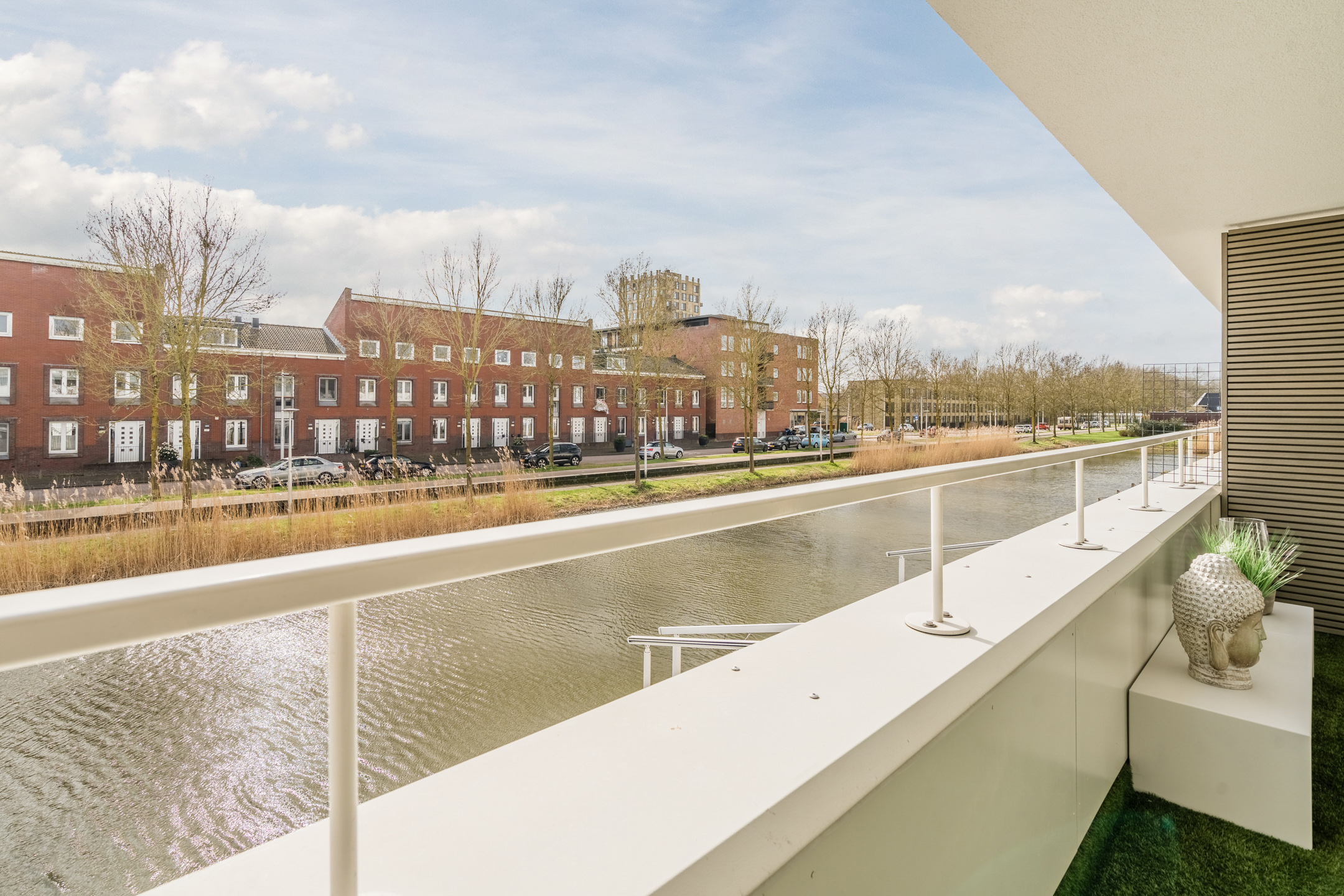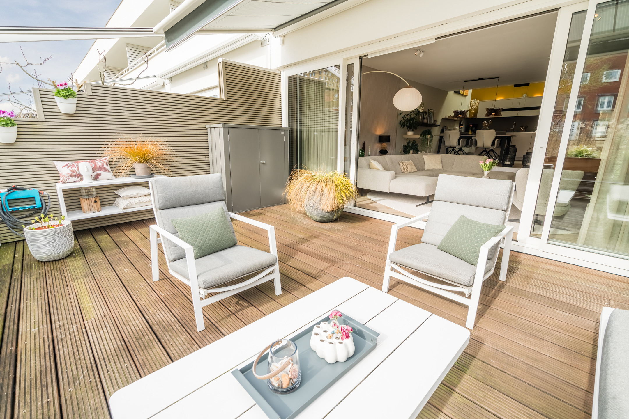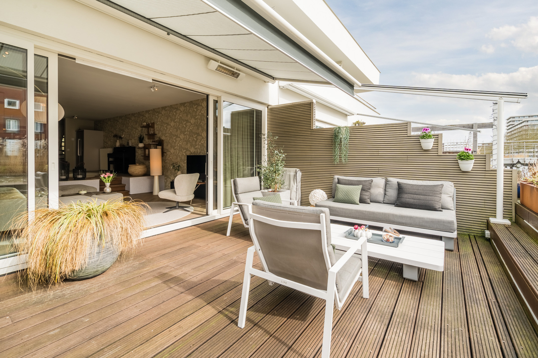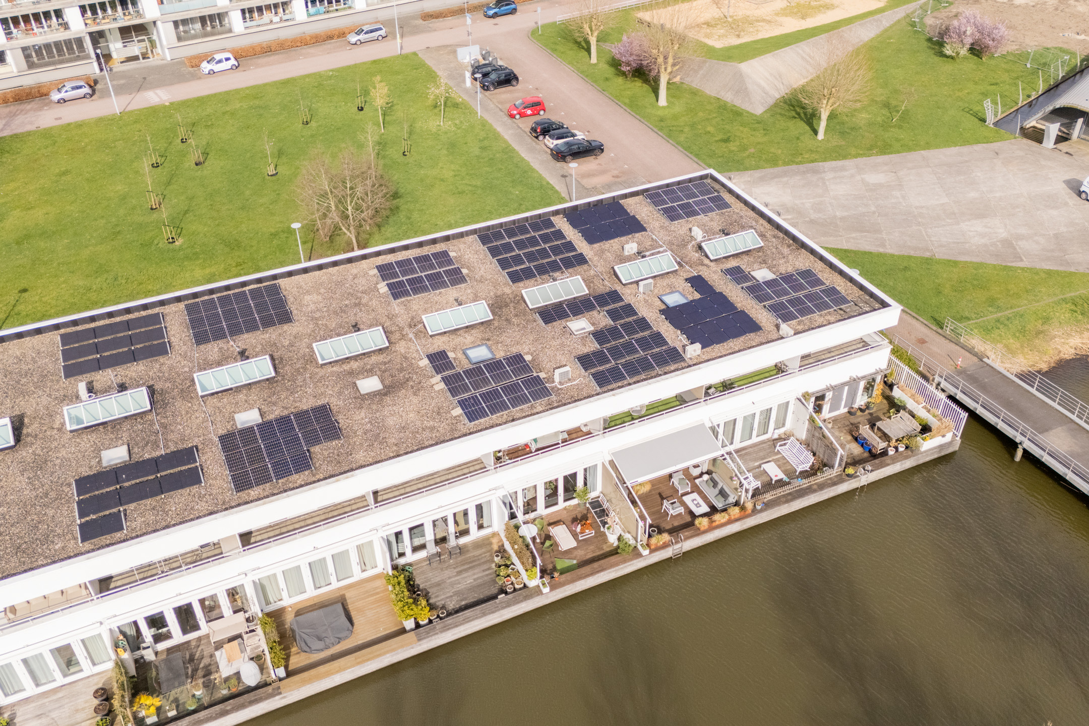 Via de brede, vierdelige schuifpui loopt de woonruimte naadloos over in het zonnige terras (ca. 5,19 x 5,86), gelegen op het zuidwesten. Het terras grenst direct aan het water van het waterwingebied Terwijde, waardoor je hier het gevoel hebt op een luxe woonboot te verblijven. De volautomatische pergola met zowel horizontale als verticale zonwering zorgt voor optimaal comfort. In de zomer neem je een verfrissende duik of vaar je zo weg met een bootje; in de winter geniet je van het uitzicht of schaats je misschien zelfs voor de deur.