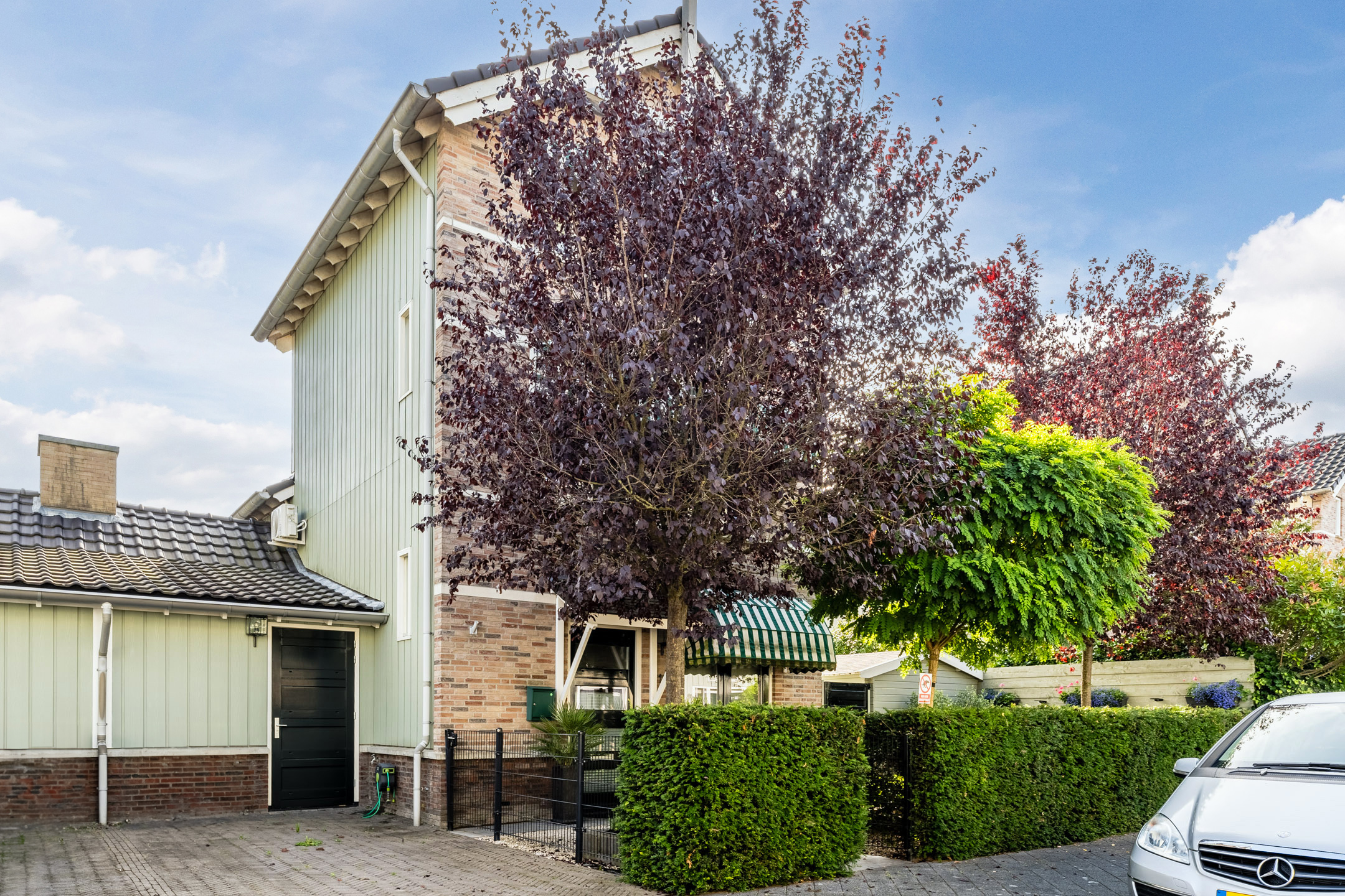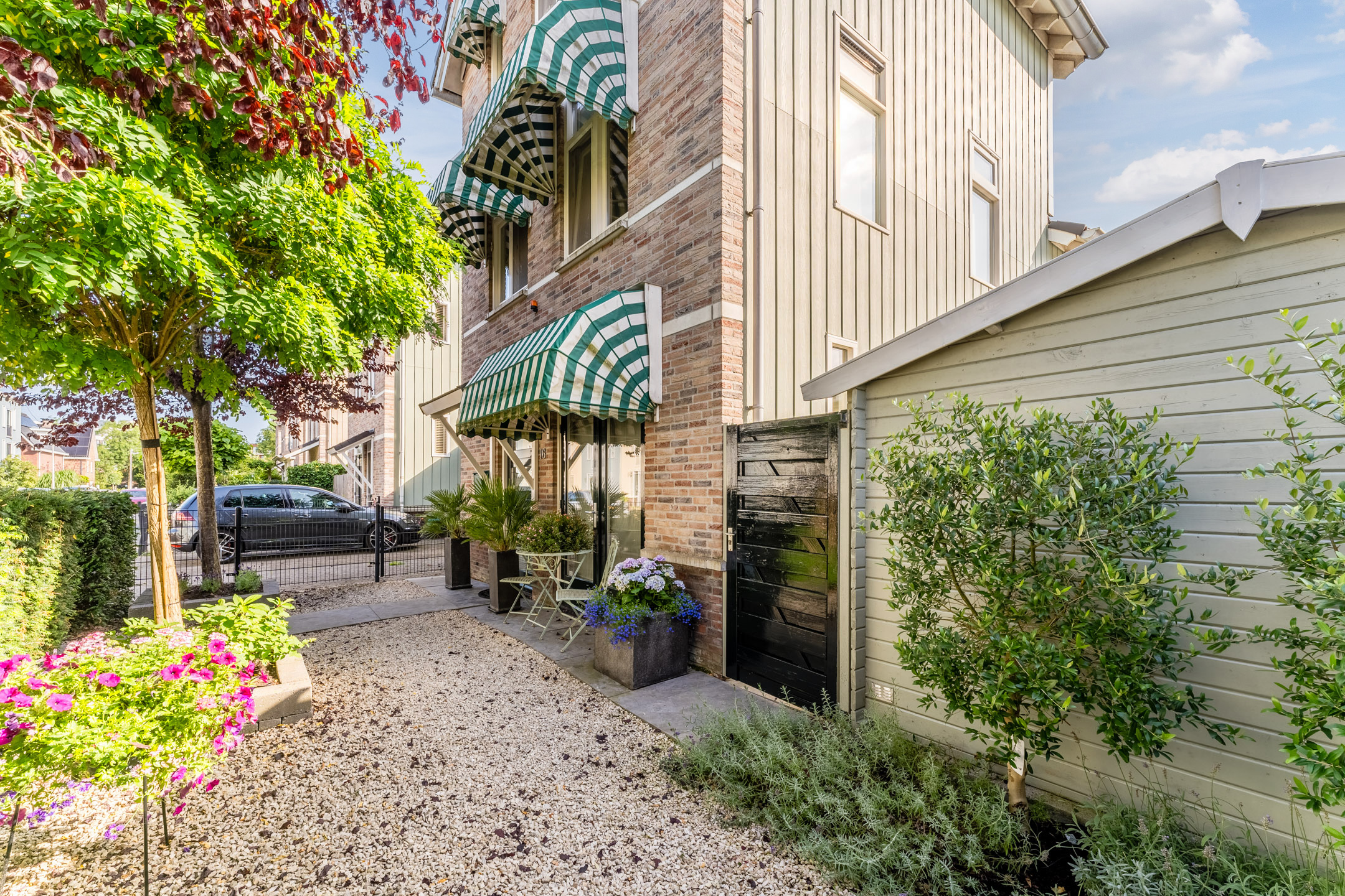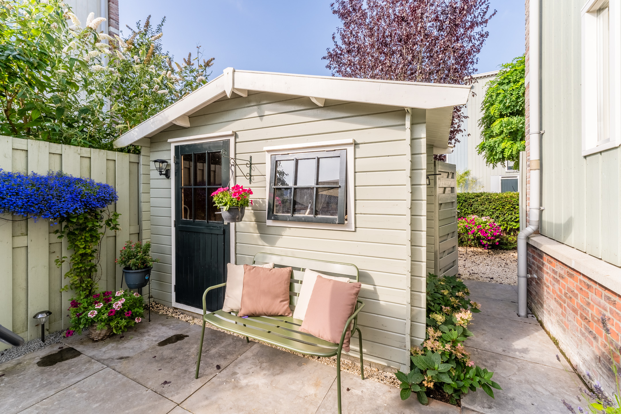 De voortuin is ruim opgezet, lekker “groen” en zonnig en voorzien van sierbestrating en beplanting. Daarbij biedt de voortuin toegang tot een riante berging, waar je de fietsen gemakkelijk kunt stallen. Ook bevindt zich een extra berging (houten chalet) in de zijtuin voor allerhande tuinspullen.