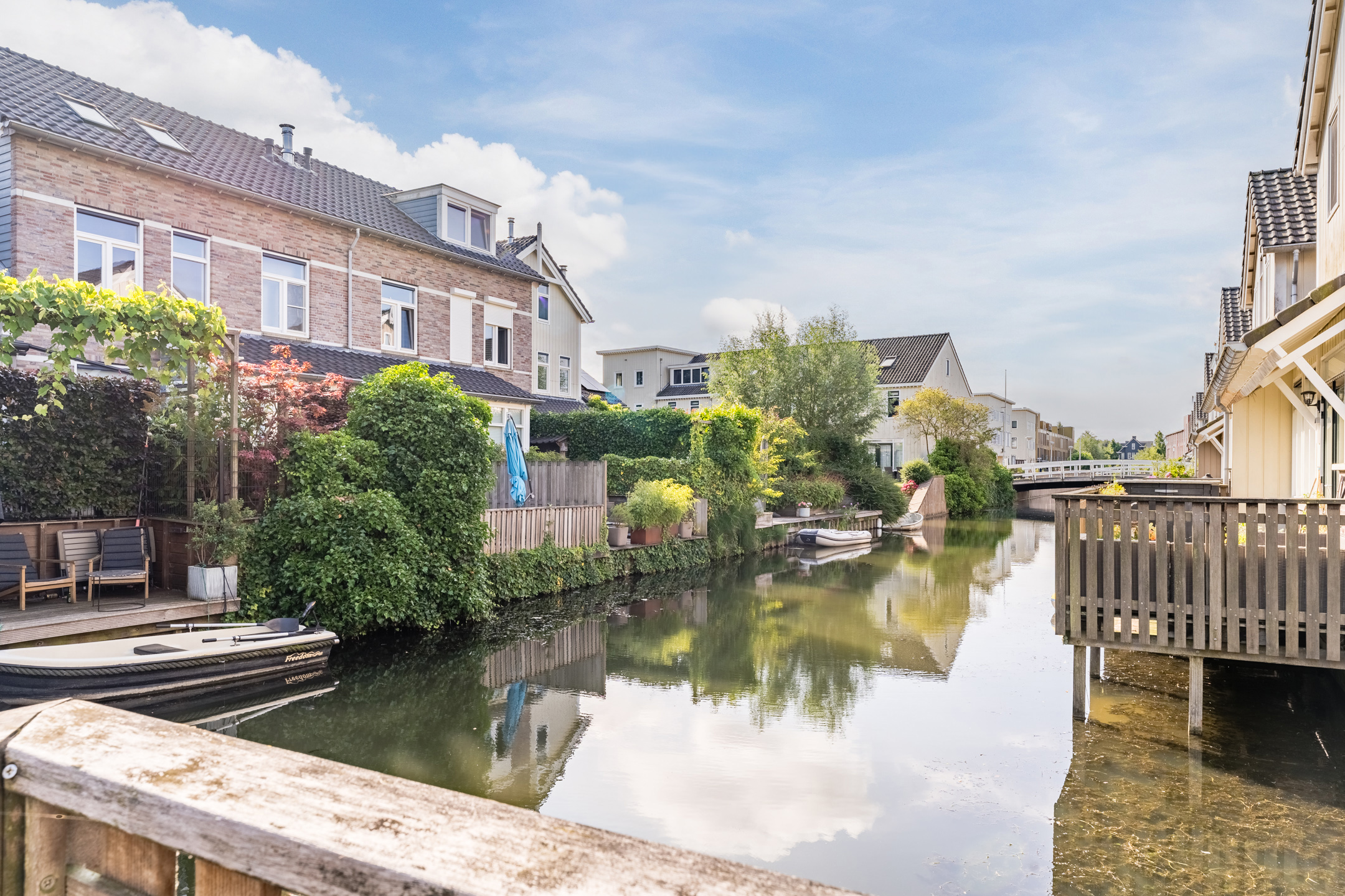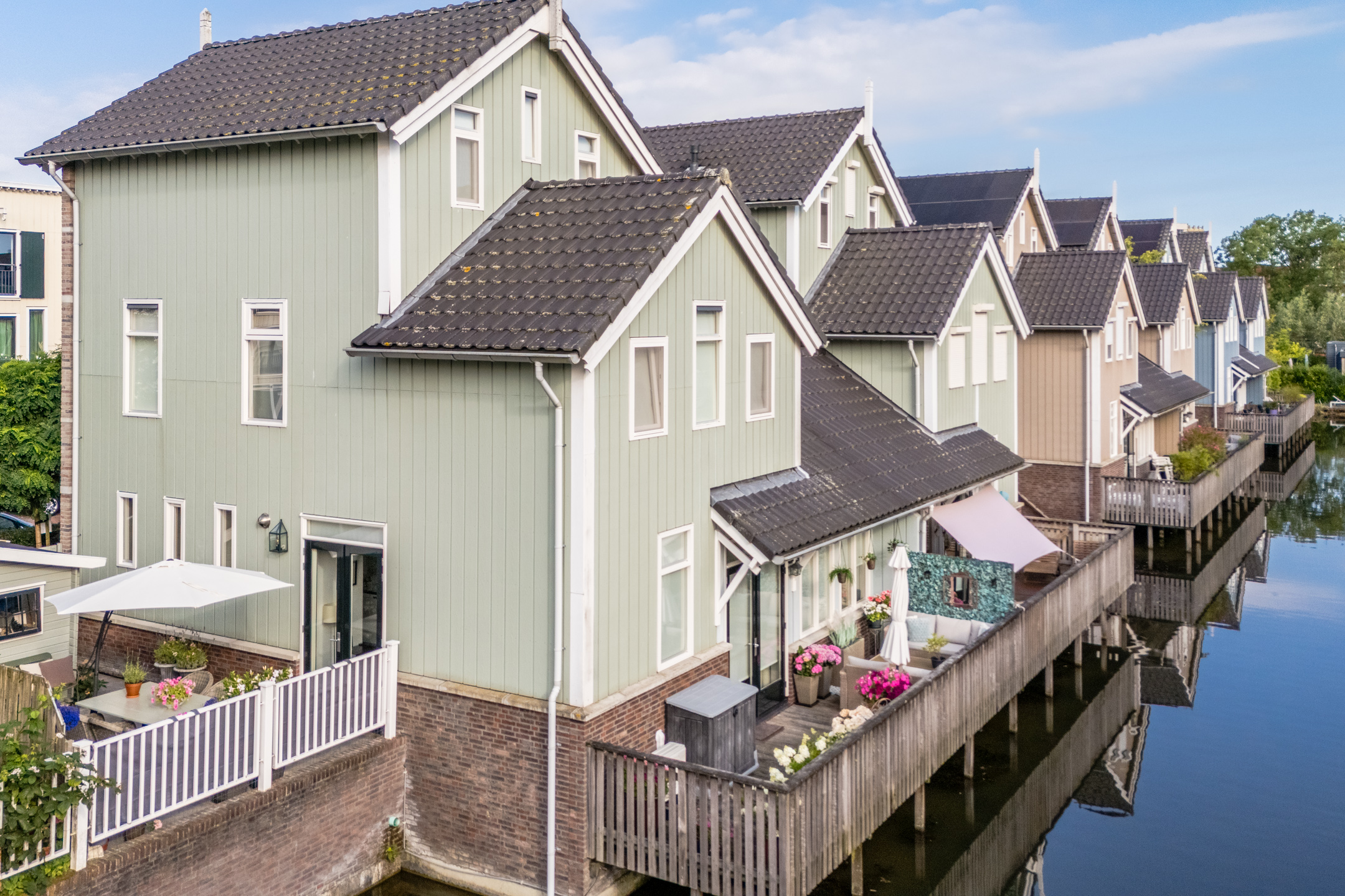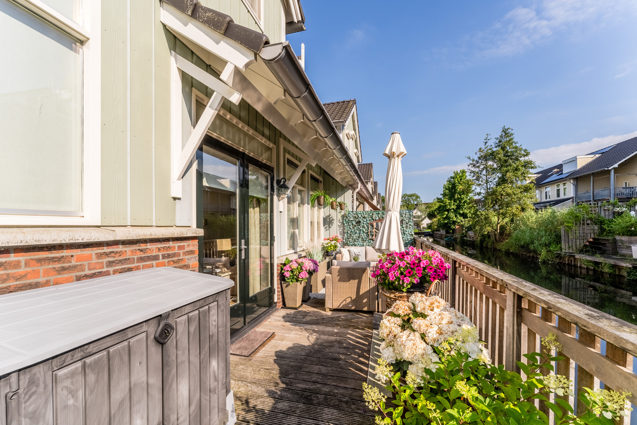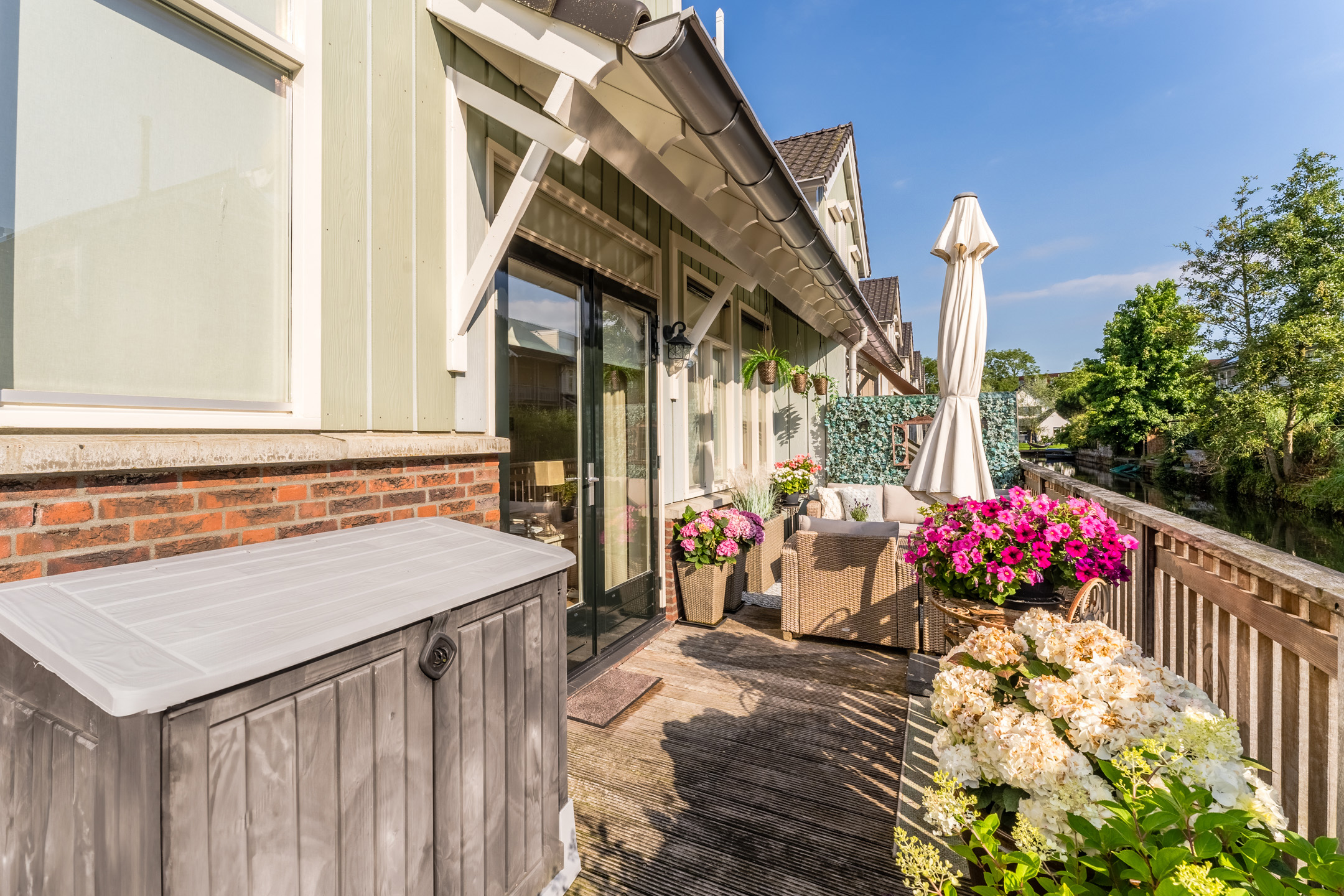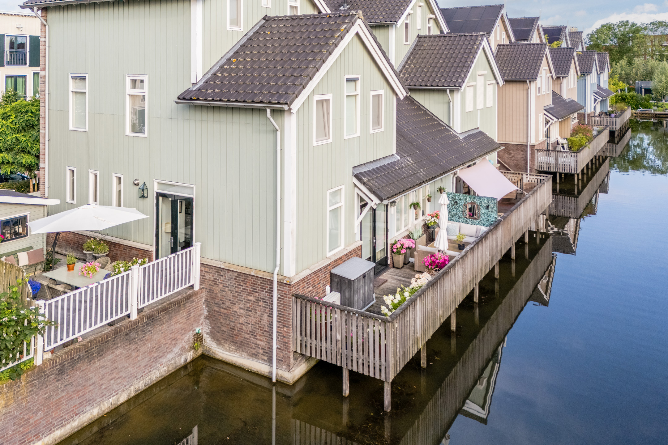 Aan de achterzijde van de woning bevindt zich de houten vlonder met balustrade en uitzicht op het water. De twee ruime terrassen aan de voor- en zijkant van de woning zijn voorzien van sierbestrating en een groene beplanting. Kortom, in deze tuin is meer dan genoeg ruimte om heerlijk te dineren met vrienden of familie.