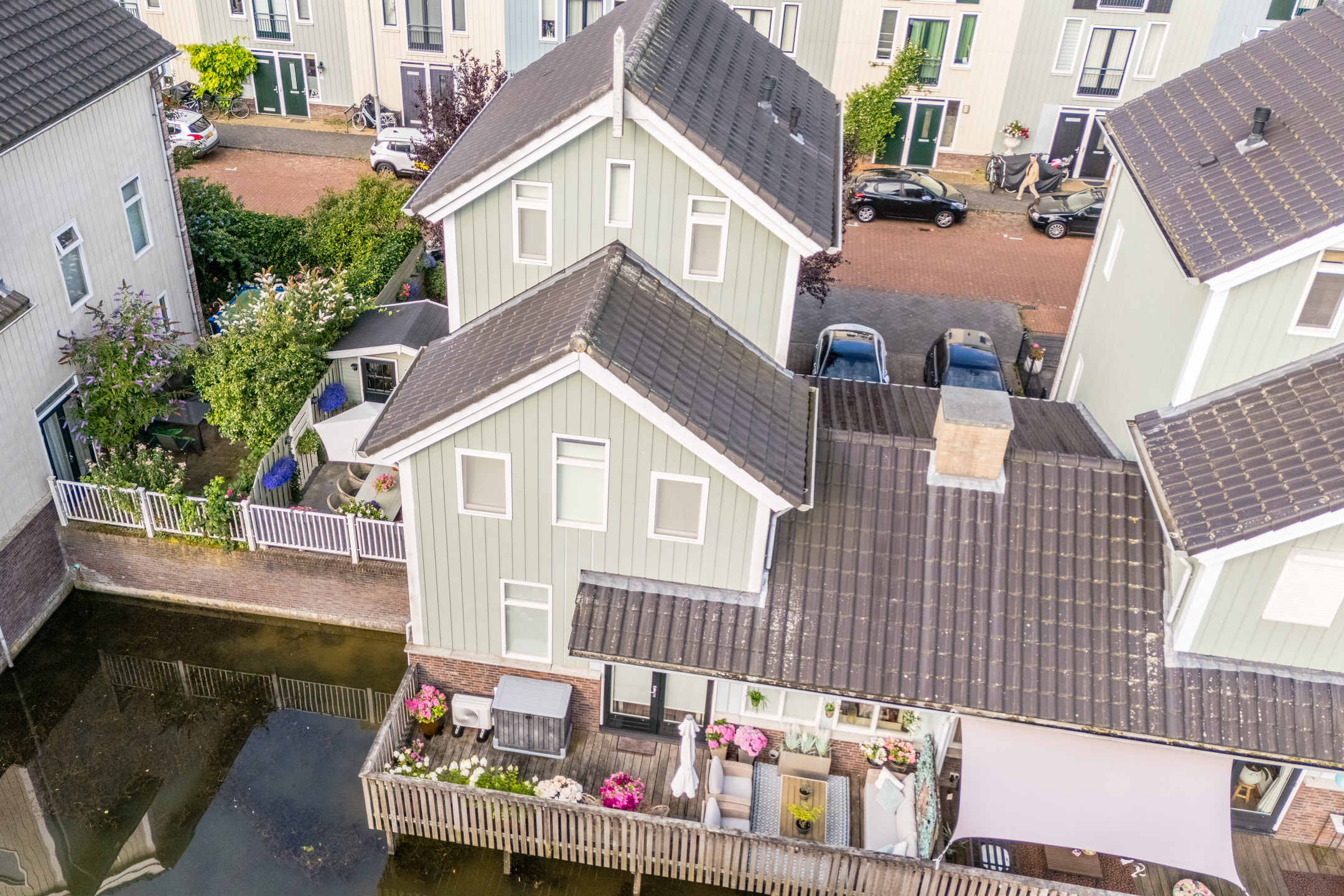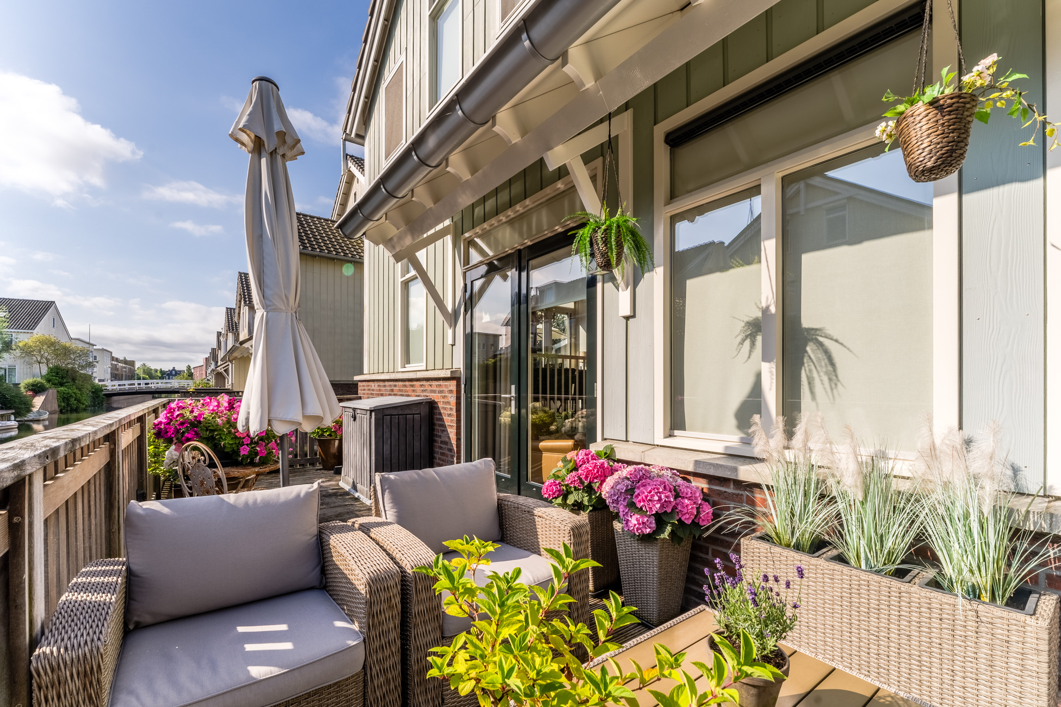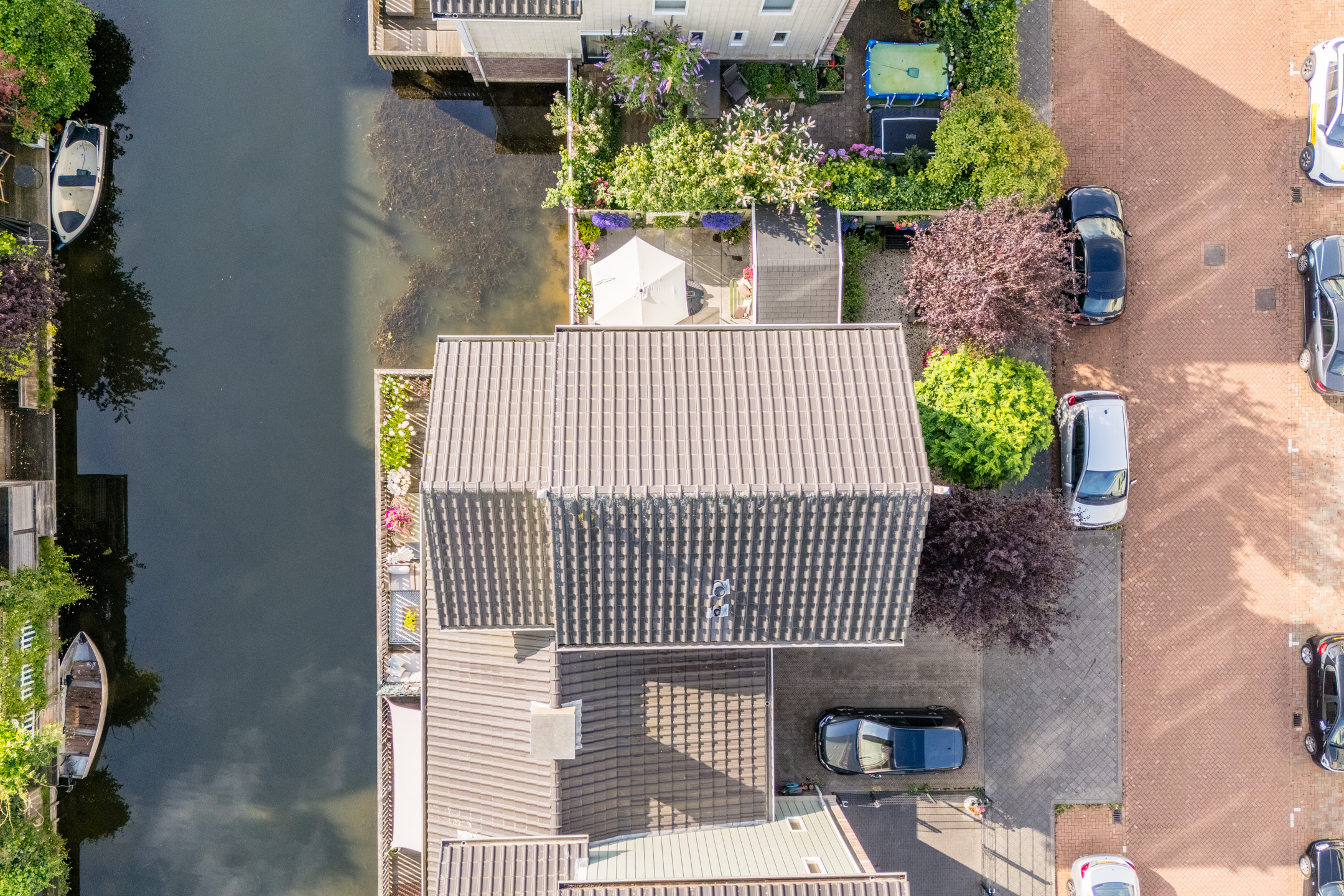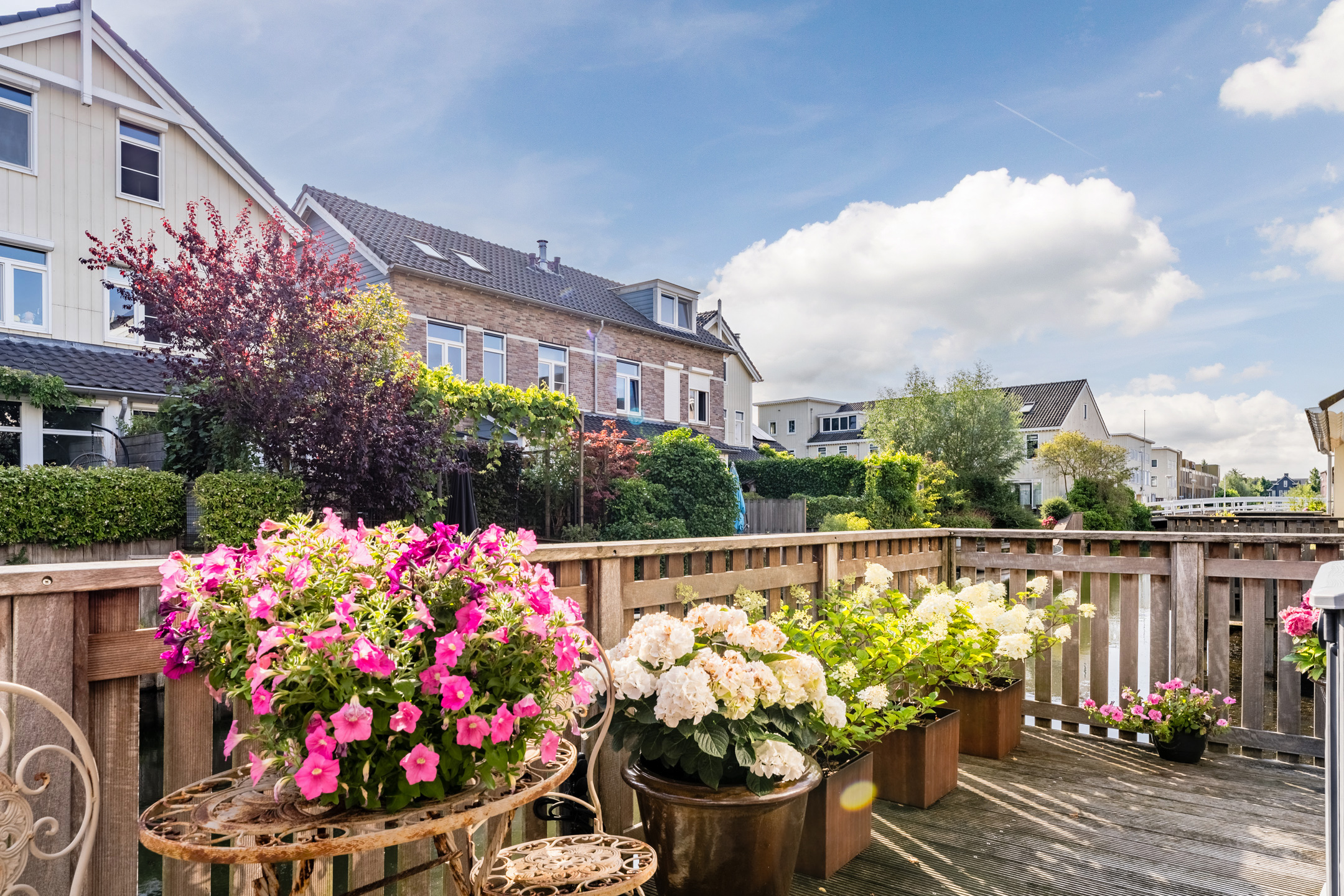 Aan de achterzijde van de woning bevindt zich de houten vlonder met balustrade en uitzicht op het water. De twee ruime terrassen aan de voor- en zijkant van de woning zijn voorzien van sierbestrating en een groene beplanting. Kortom, in deze tuin is meer dan genoeg ruimte om heerlijk te dineren met vrienden of familie.