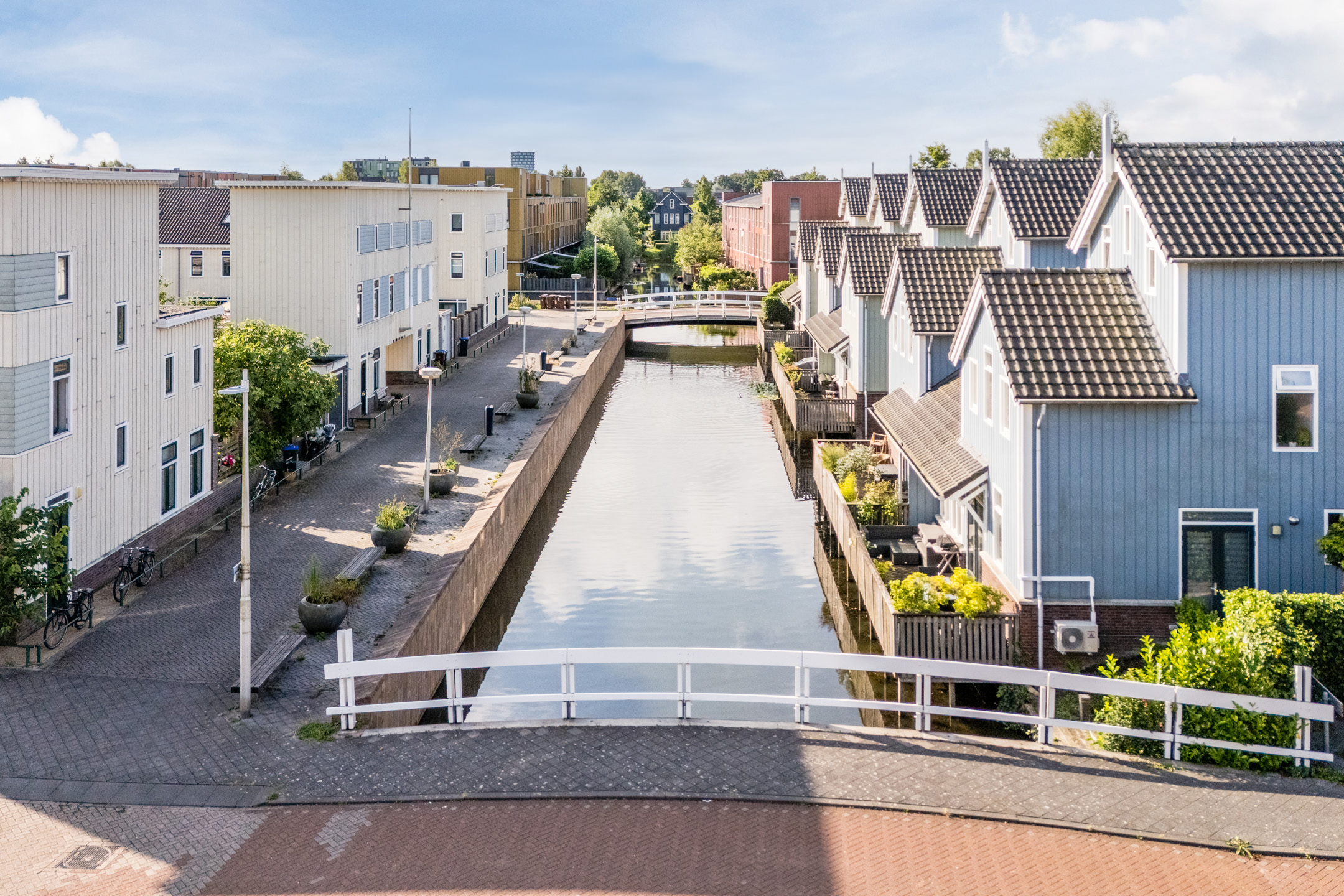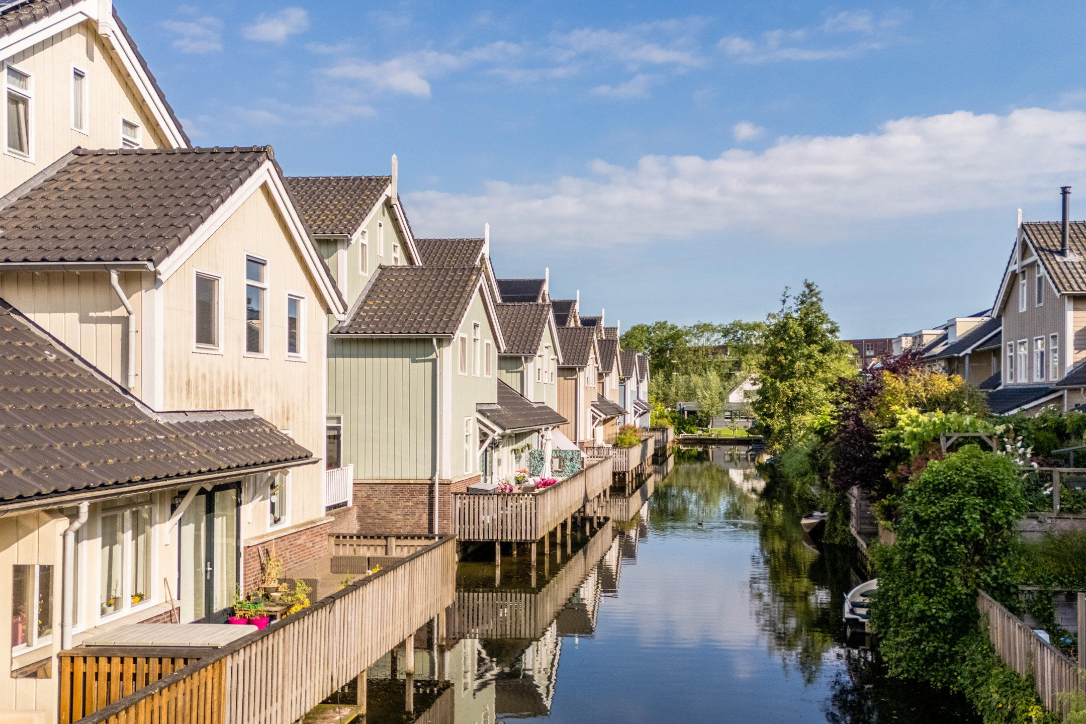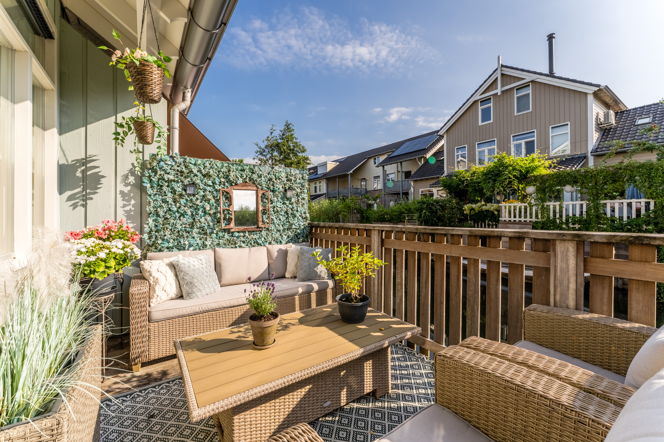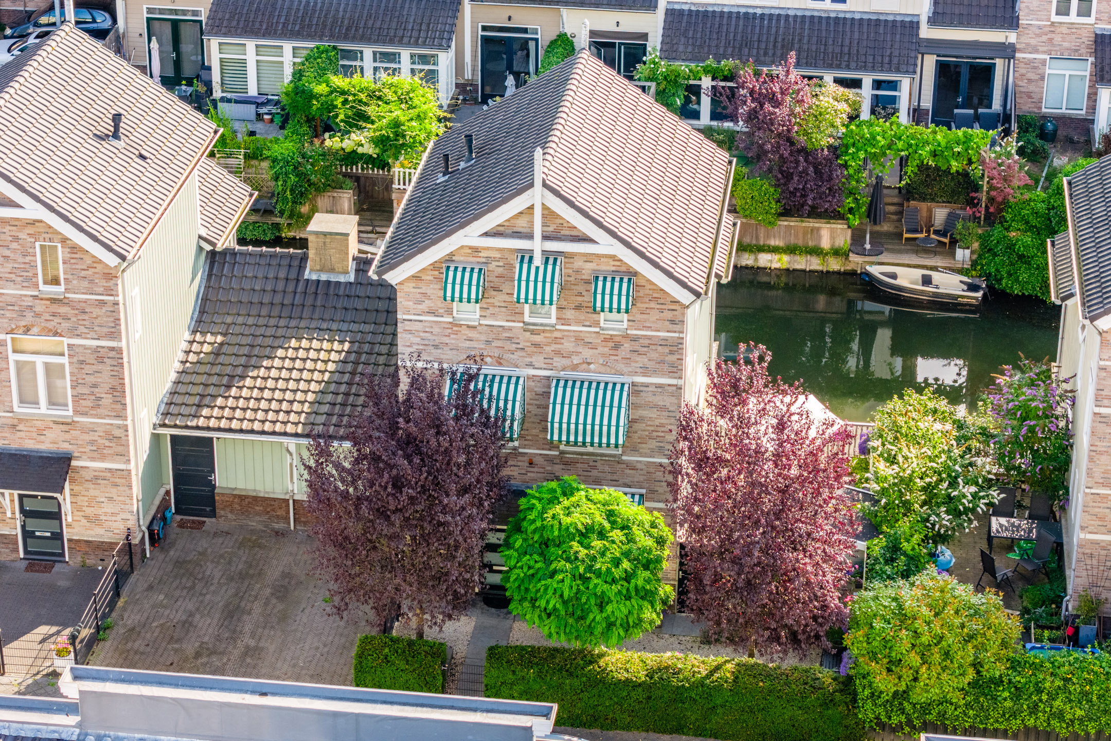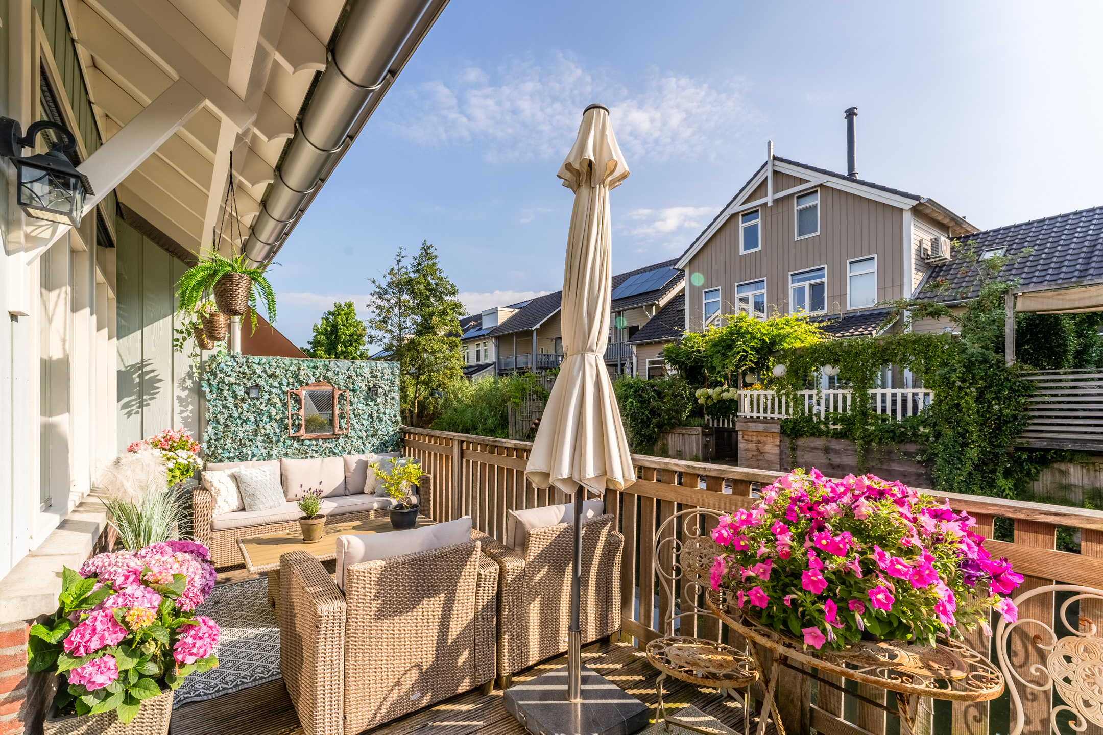 Aan de achterzijde van de woning bevindt zich de houten vlonder met balustrade en uitzicht op het water. De twee ruime terrassen aan de voor- en zijkant van de woning zijn voorzien van sierbestrating en een groene beplanting. Kortom, in deze tuin is meer dan genoeg ruimte om heerlijk te dineren met vrienden of familie.