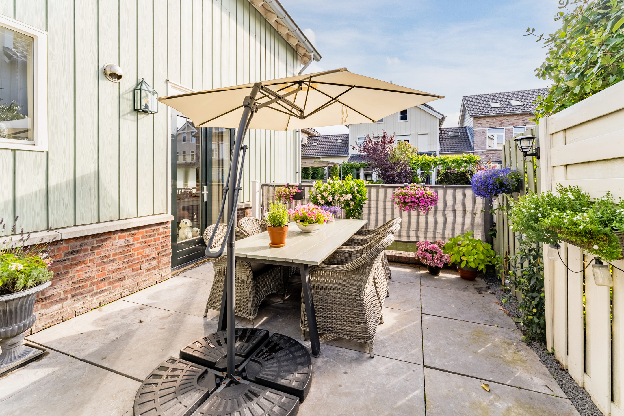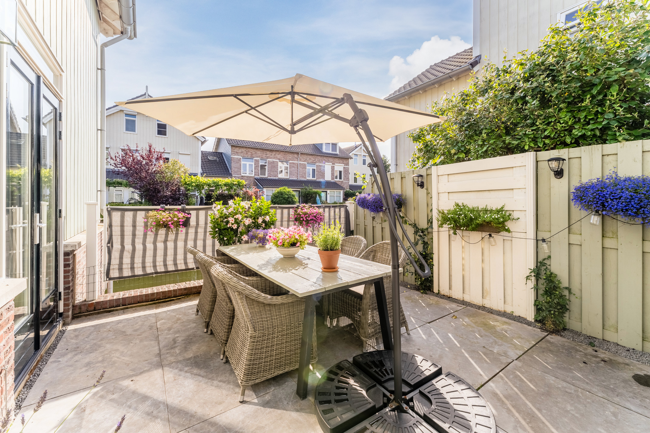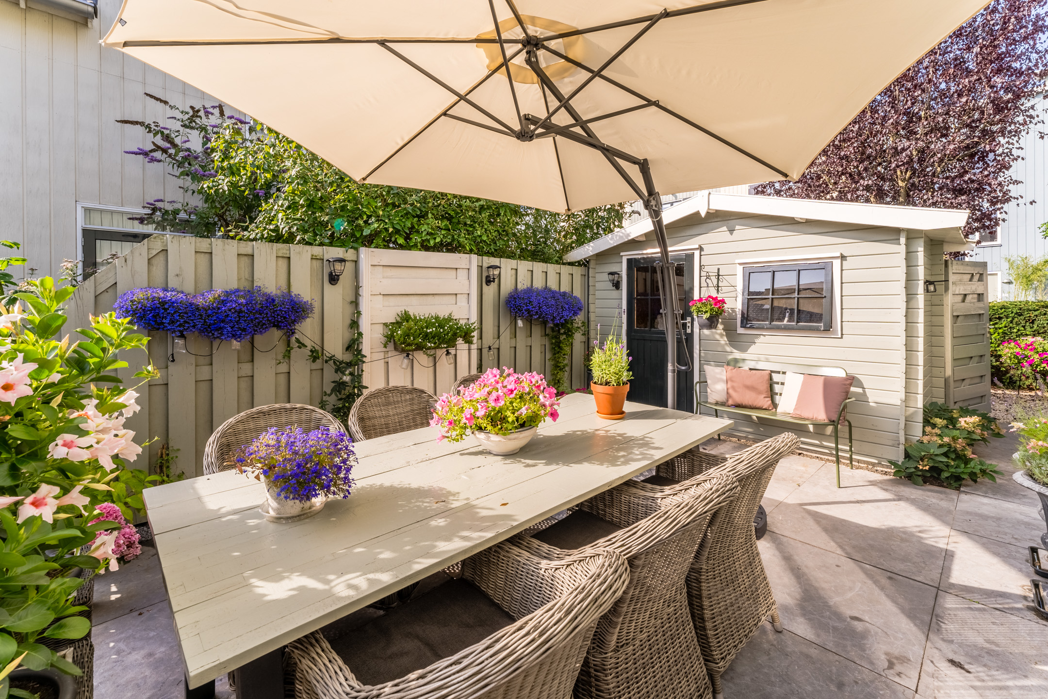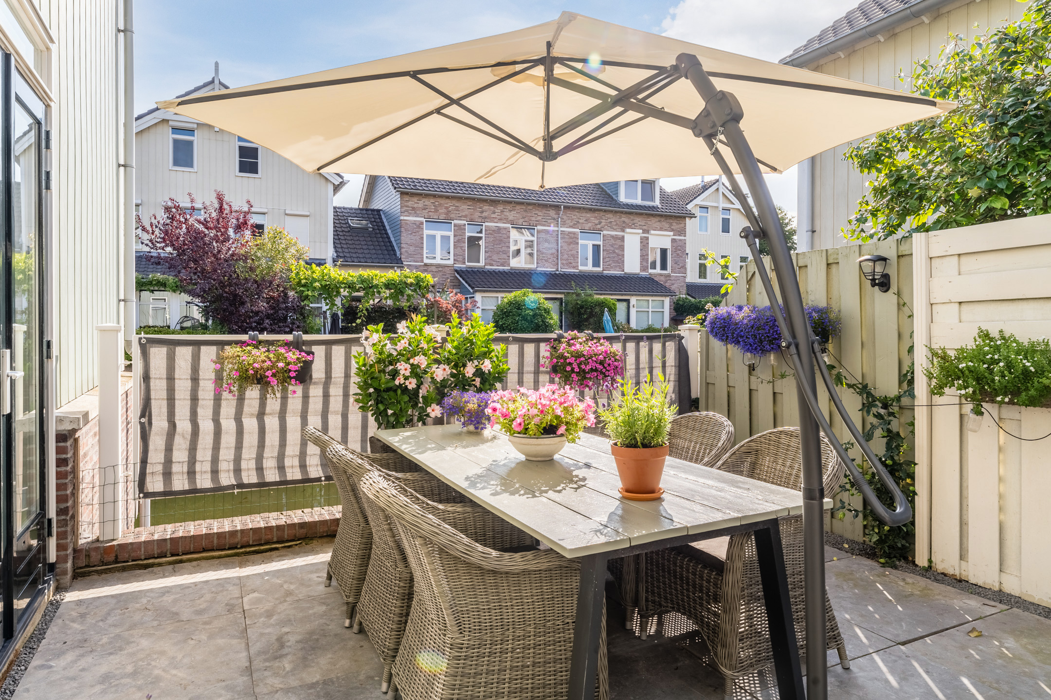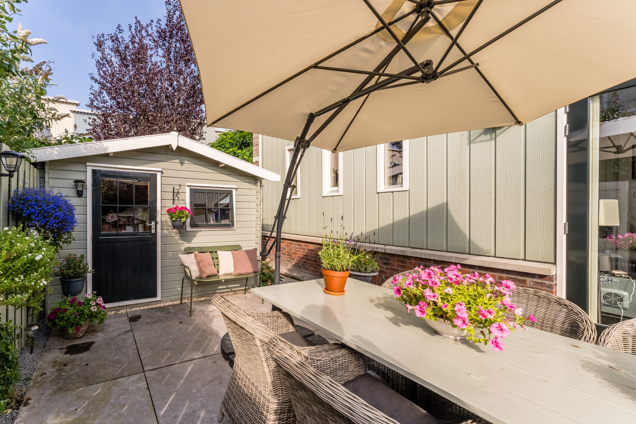 De tuin is fraai aangelegd en veelzijdig ingedeeld, met maar liefst 3 verschillende terrassen die te bereiken zijn door middel van openslaande deuren in de woon- en eetkamer en de keuken.