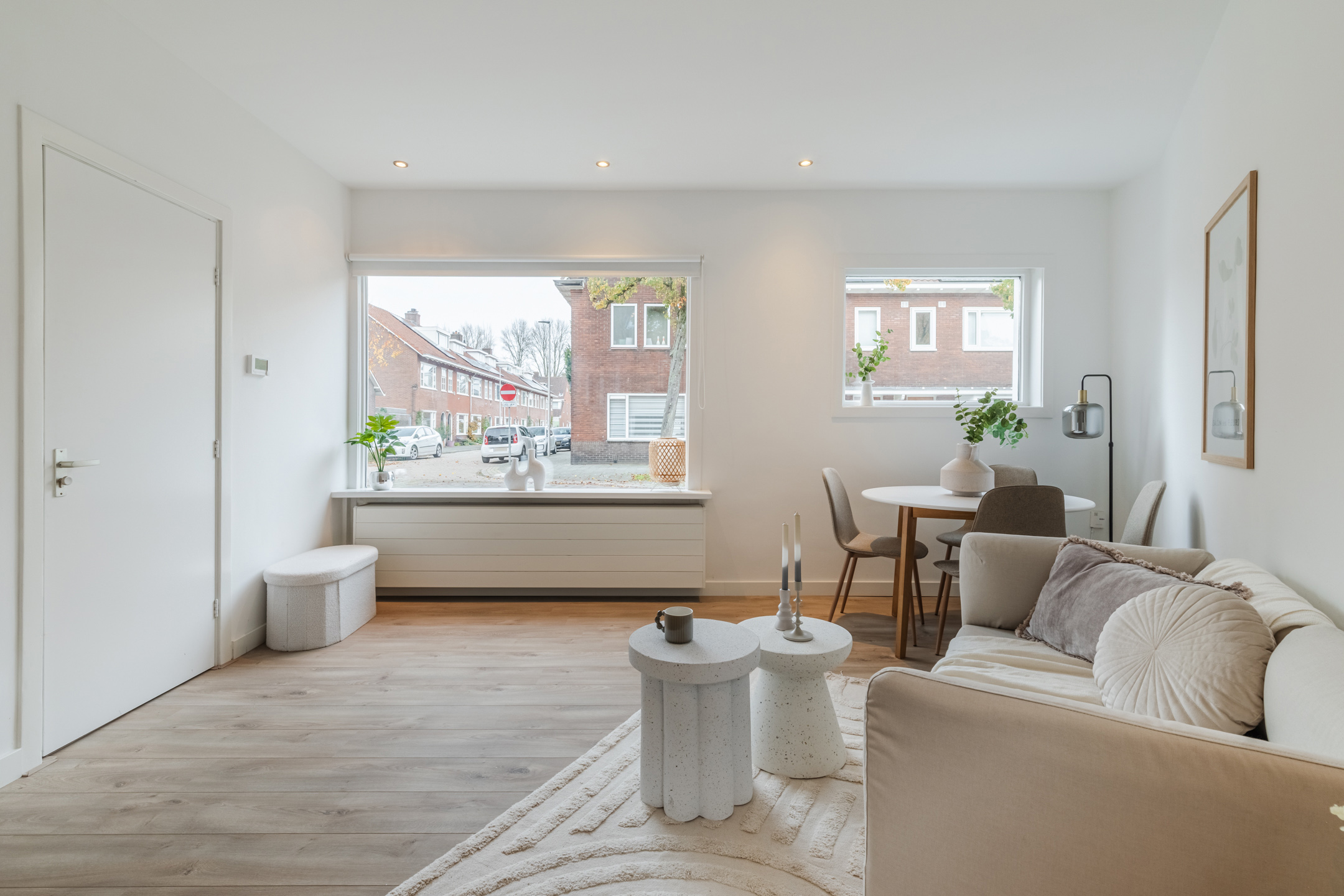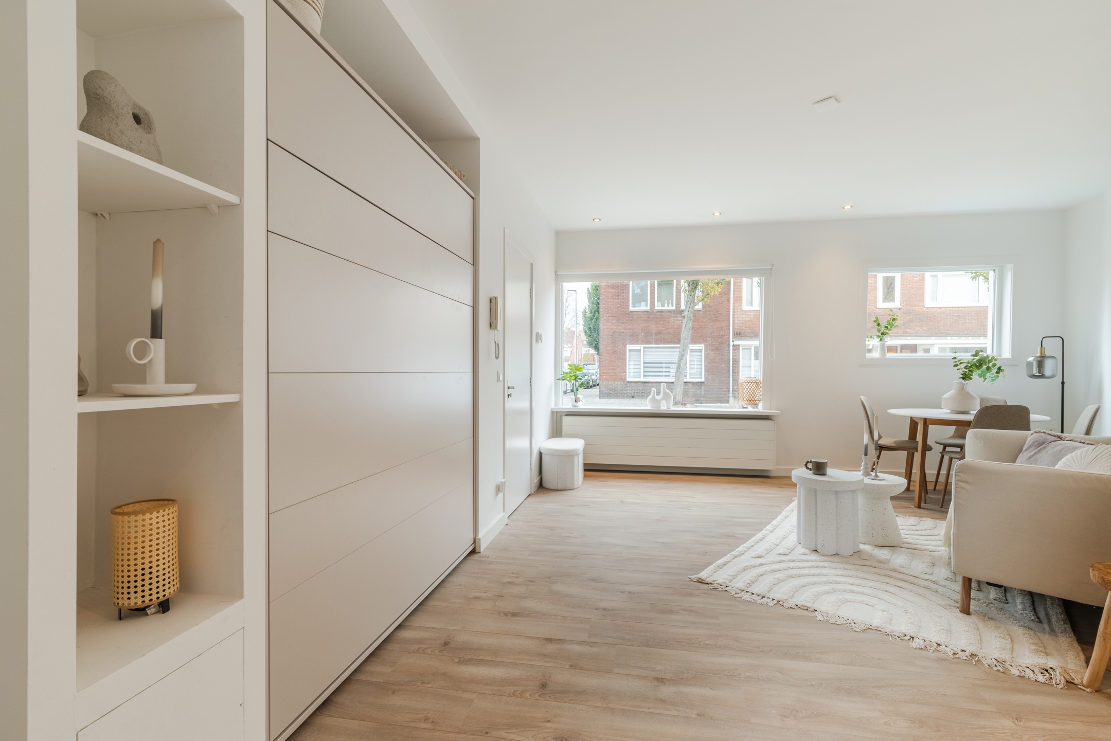 Je komt direct de lichte en speelse woonkamer binnen. Je wordt verwelkomt door de prettige daglichttoetreding middels de ramen aan de voor- en zij kant van het appartement. De afwerking is zeer goed met strak gestucte wanden en plafonds. Er kan een prettige zithoek en eethoek aan de voorzijde van het appartement gecreëerd worden met fraai zicht op de gezellige Rhijnvis Feithstraat. Aan de achterzijde van het appartement tref je de keuken en badkamer.