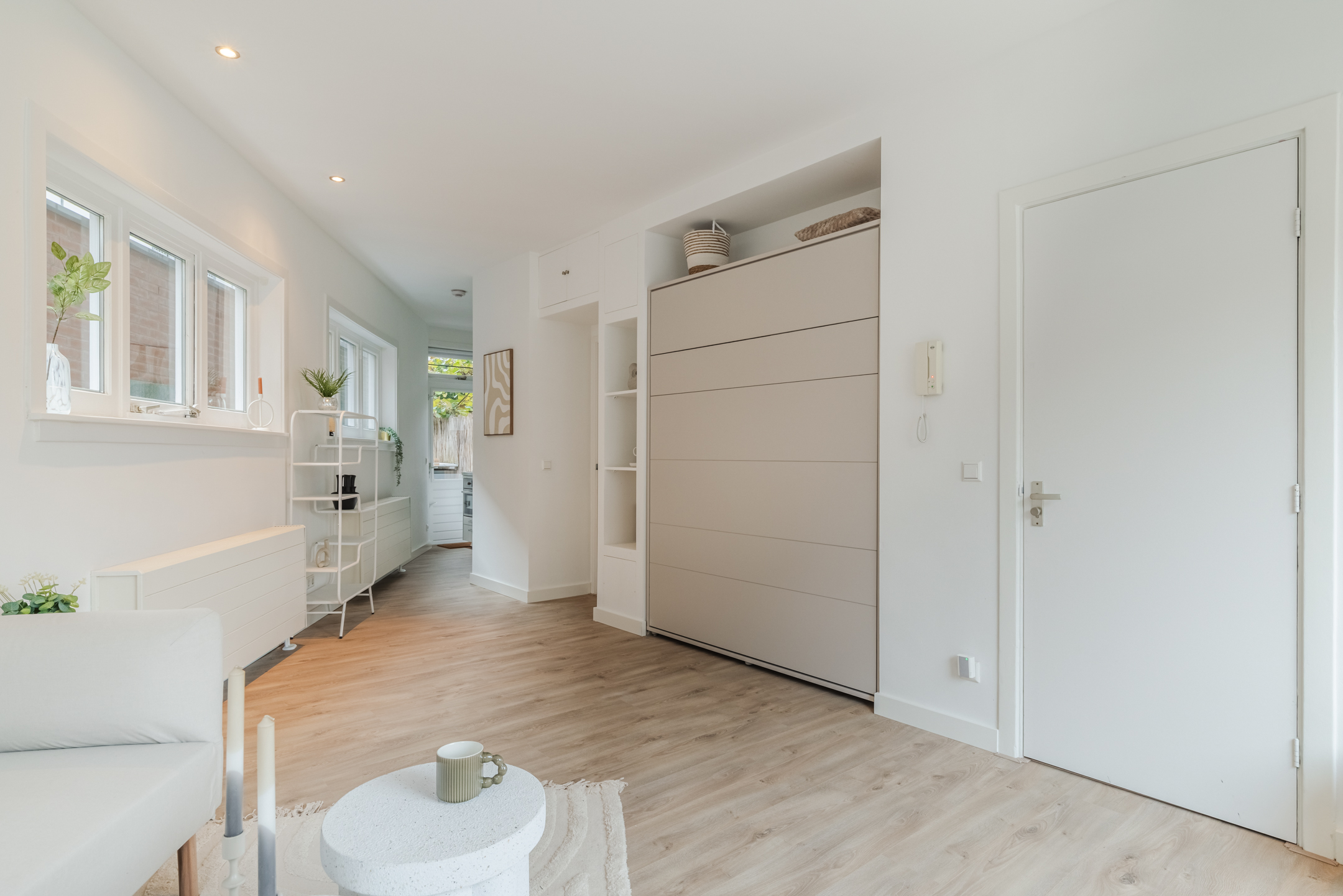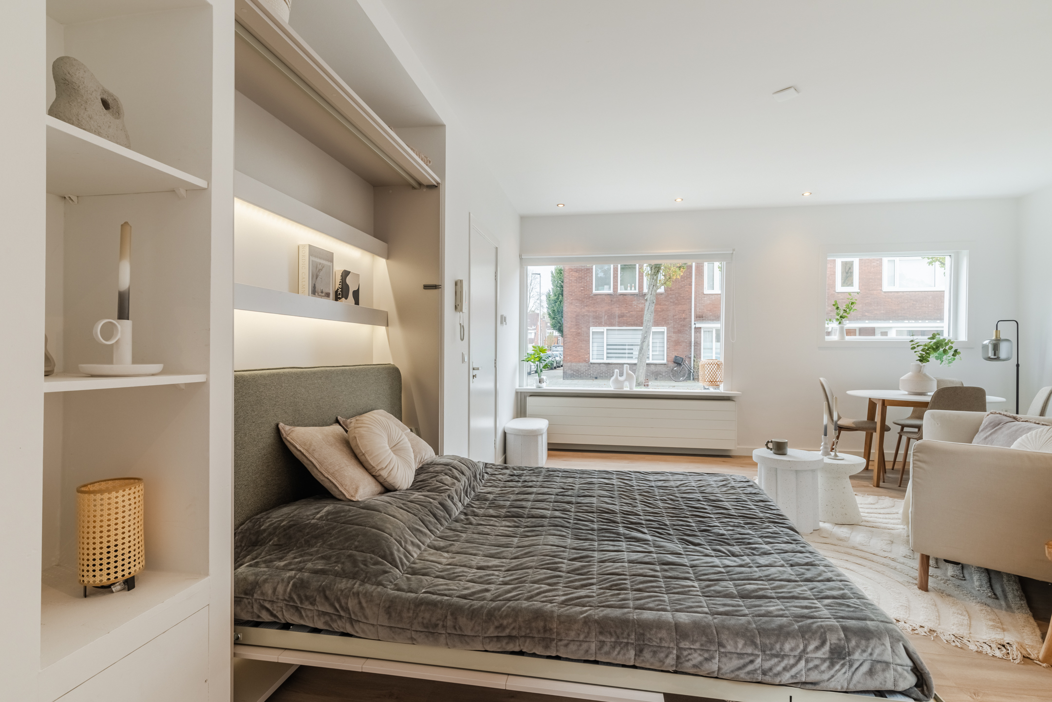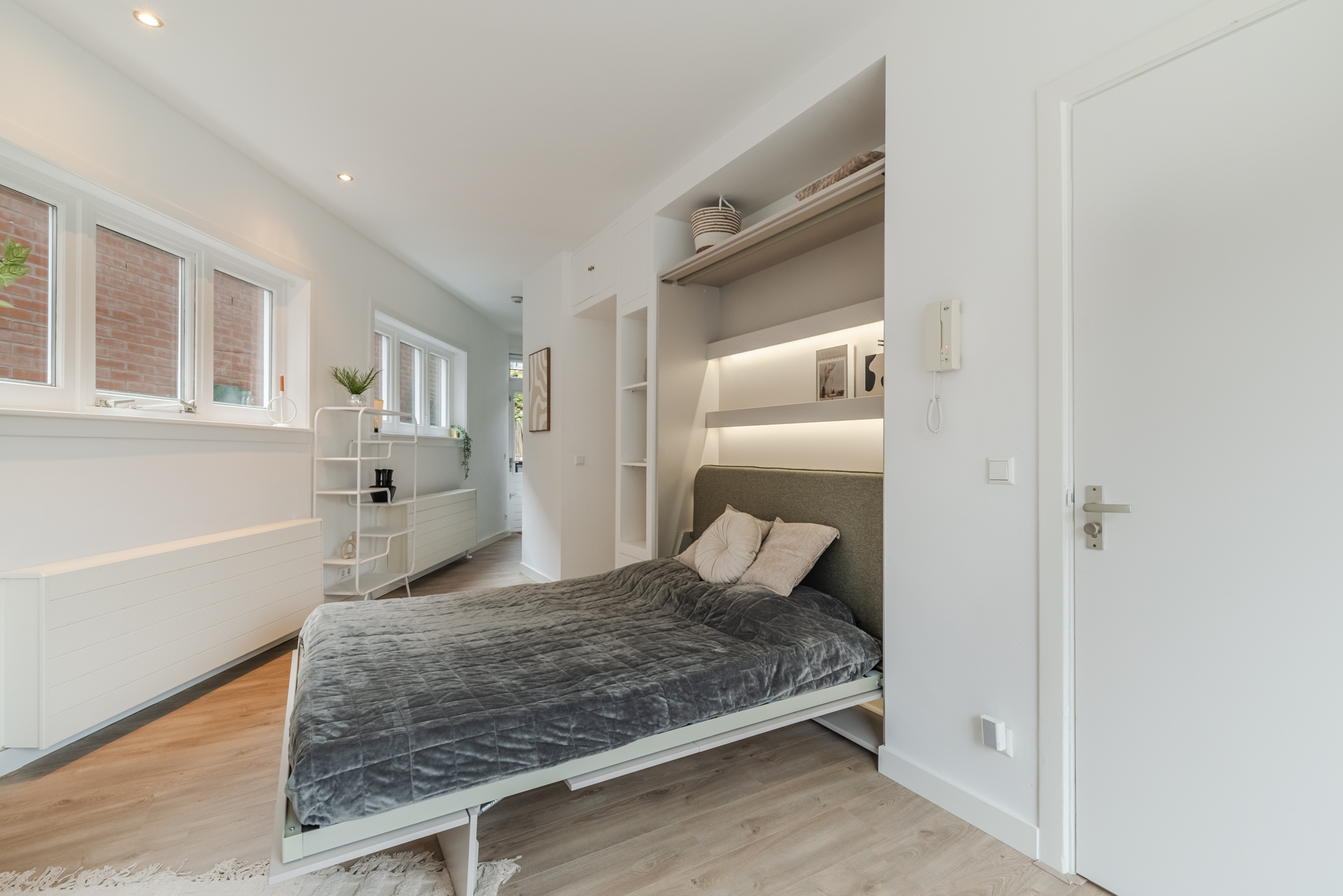 Centraal in de woonkamer is een innovatief opklapbaar twee persoon bed geplaatst. Op zeer eenvoudige wijze en in enkele ogenblikken verander jij je woonkamer tot cosy slaapkamer. In het frame waaruit het bed zich uitklapt zitten handige planken en sfeervolle verlichting verwerkt. Daarnaast zijn er meerdere stopcontacten in de wand die vrijkomt aanwezig, ideaal voor het opladen van o.a. je mobiele telefoon.