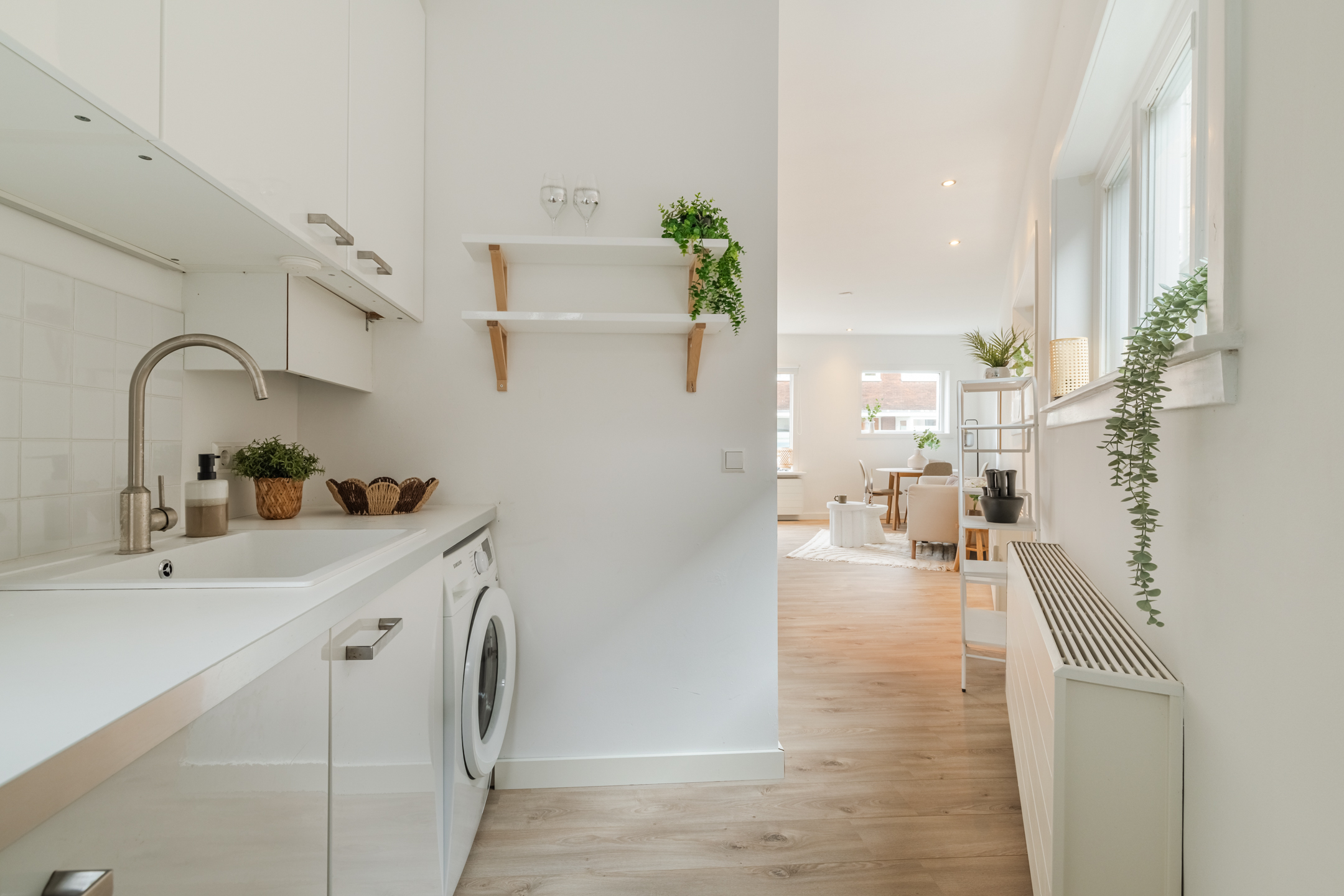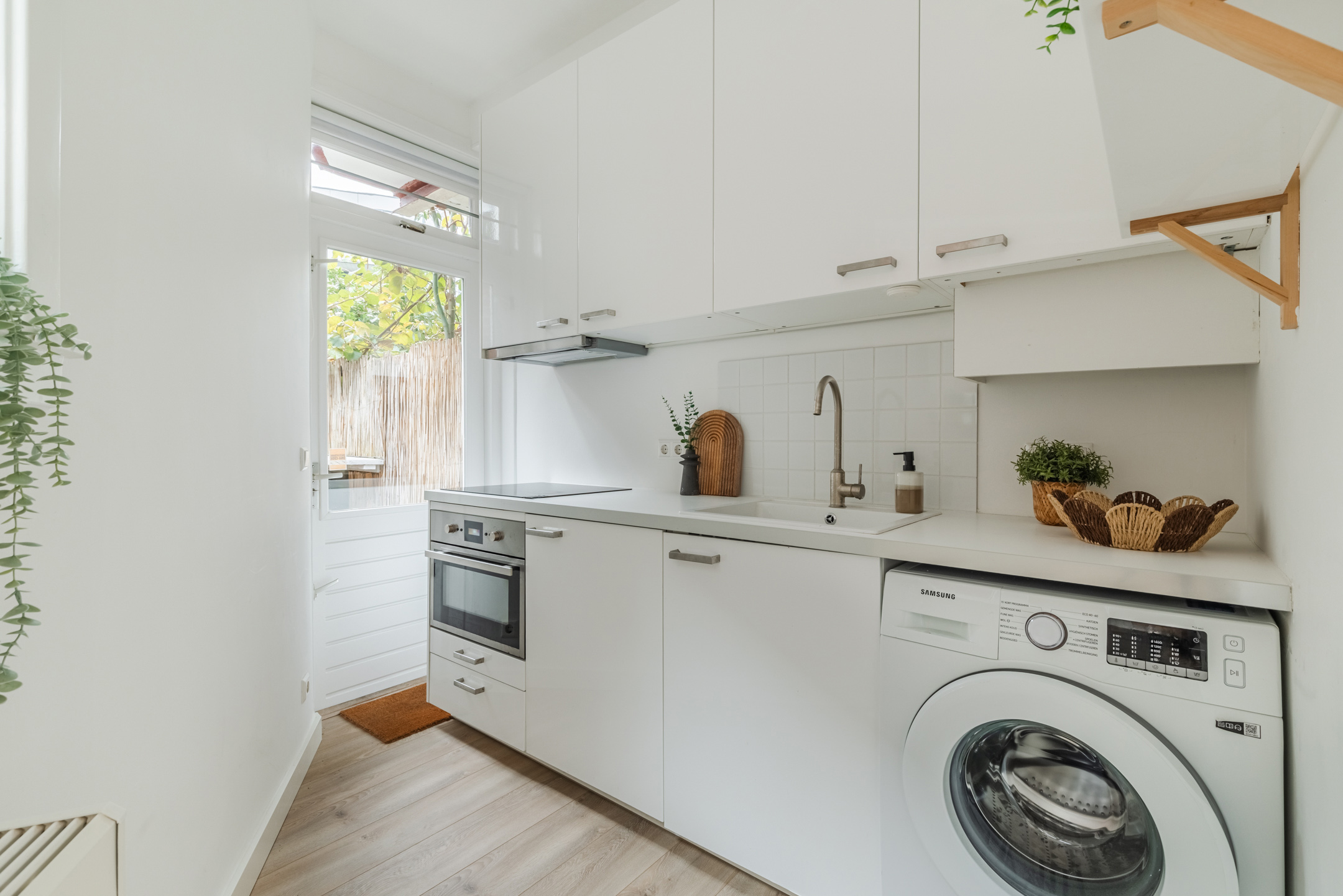 De keuken is uitgerust met de nodige inbouwapparatuur o.a. inductiekookplaat, afzuiger, combi-oven, koel-vries combinatie en aansluiting voor de wasmachine. De keuken is uitgevoerd in een lichte en neutrale kleurstelling. De witte strakke fronten in combinatie met het witte blad vormt een perfecte basis voor ieder interieur. Vanuit de keuken is de achtertuin te bereiken.