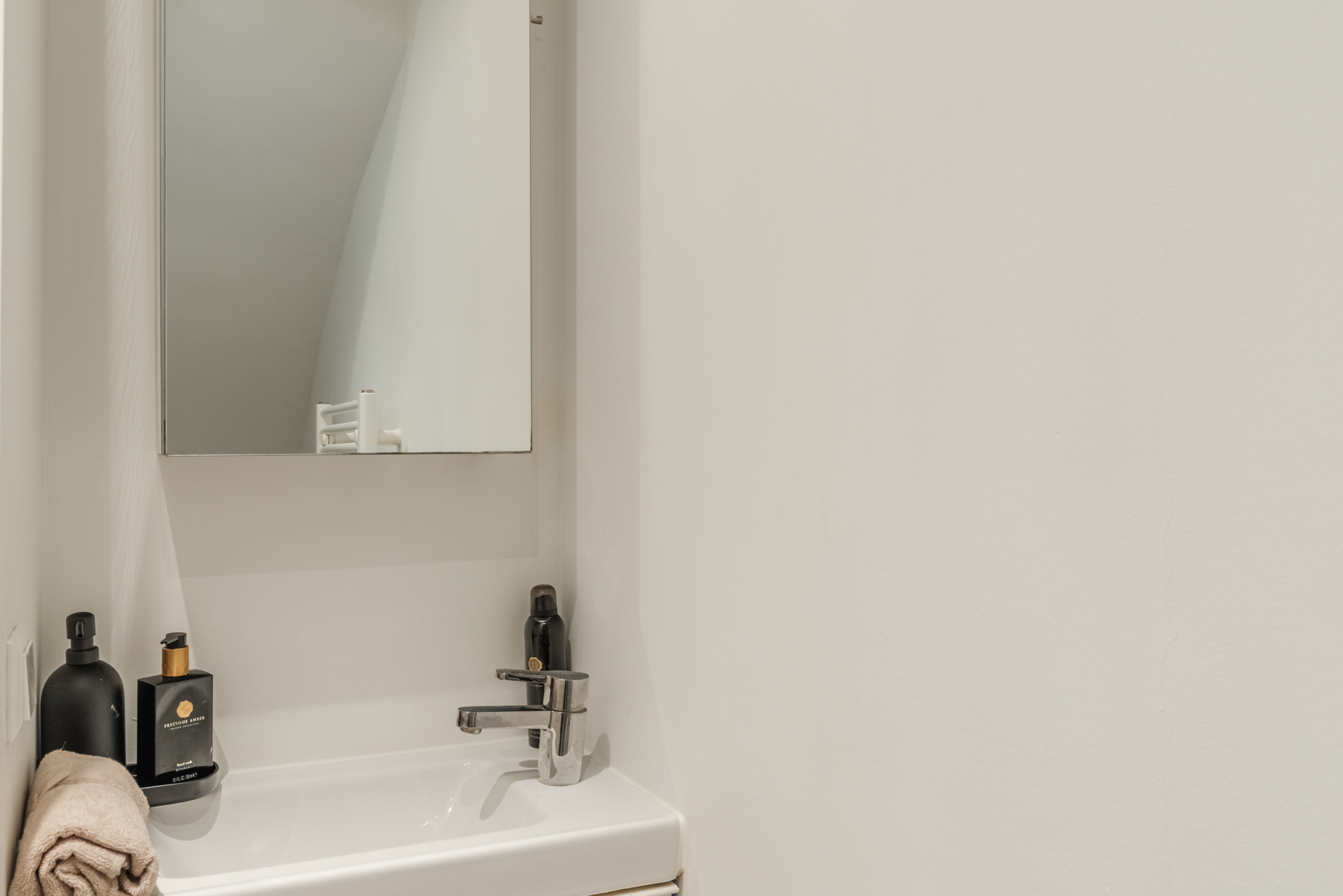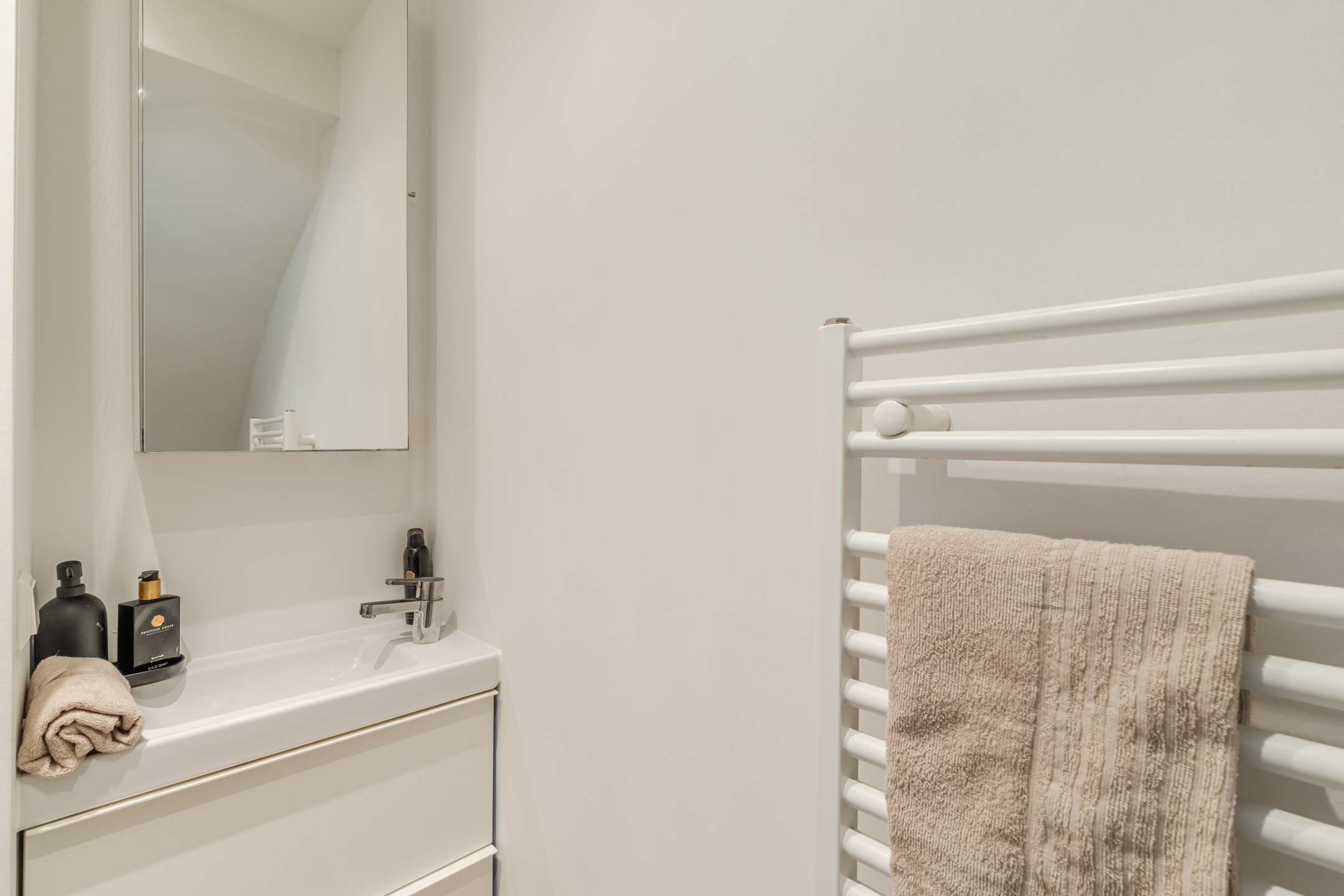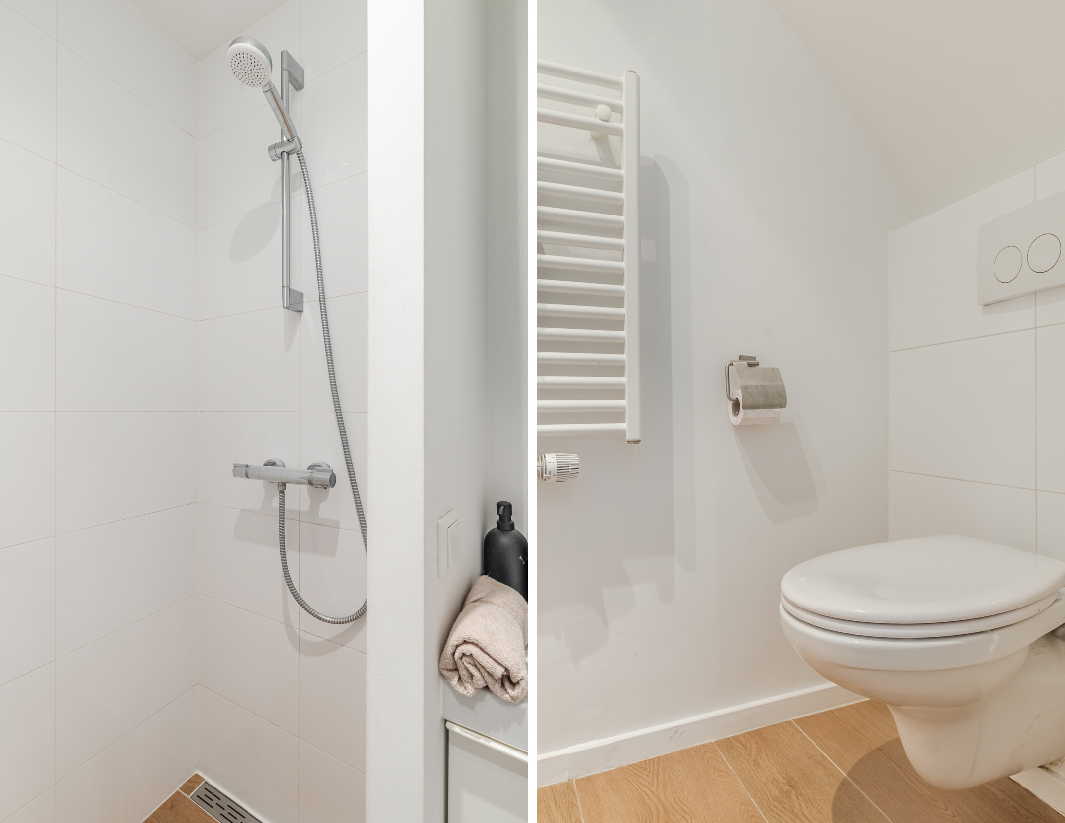 De praktische en inpandige badkamer is op een efficiënte plek gesitueerd onder de trapopgang. De badkamer is uitgerust met ruime inloopdouche, wastafelmeubel met lades, spiegelkast, handdoek radiator en een hangend toilet. De badkamer is uitgevoerd in een strakke kleurstelling met witte wandtegels (gecombineerd met stucwerk) en een frisse houtlook vloertegel.