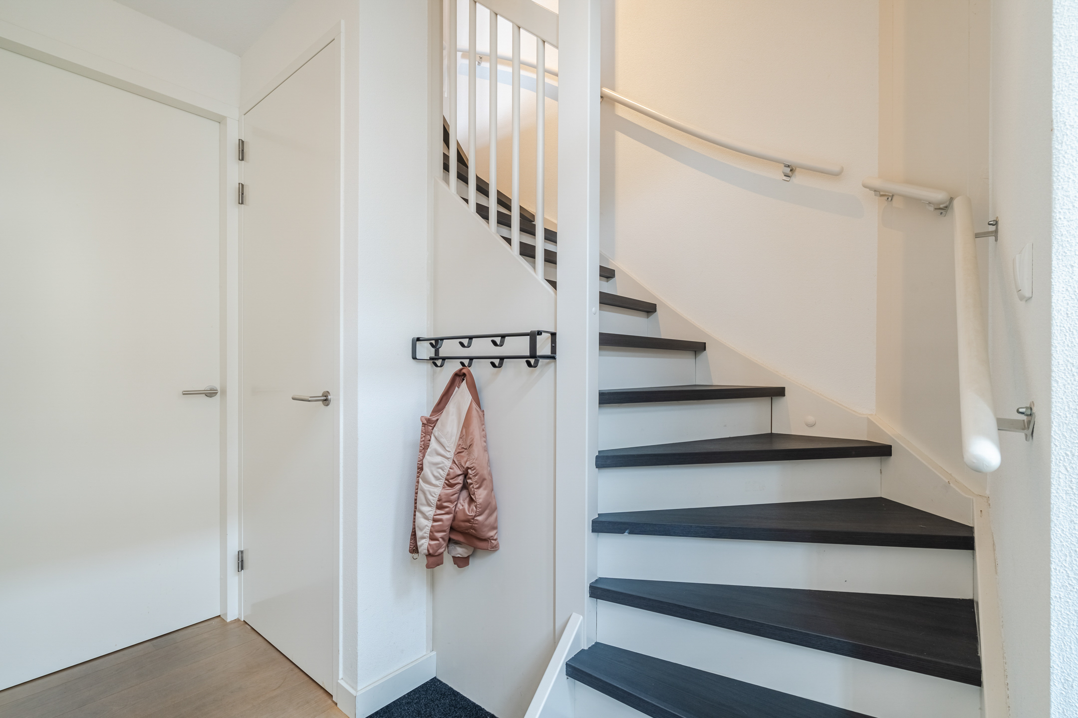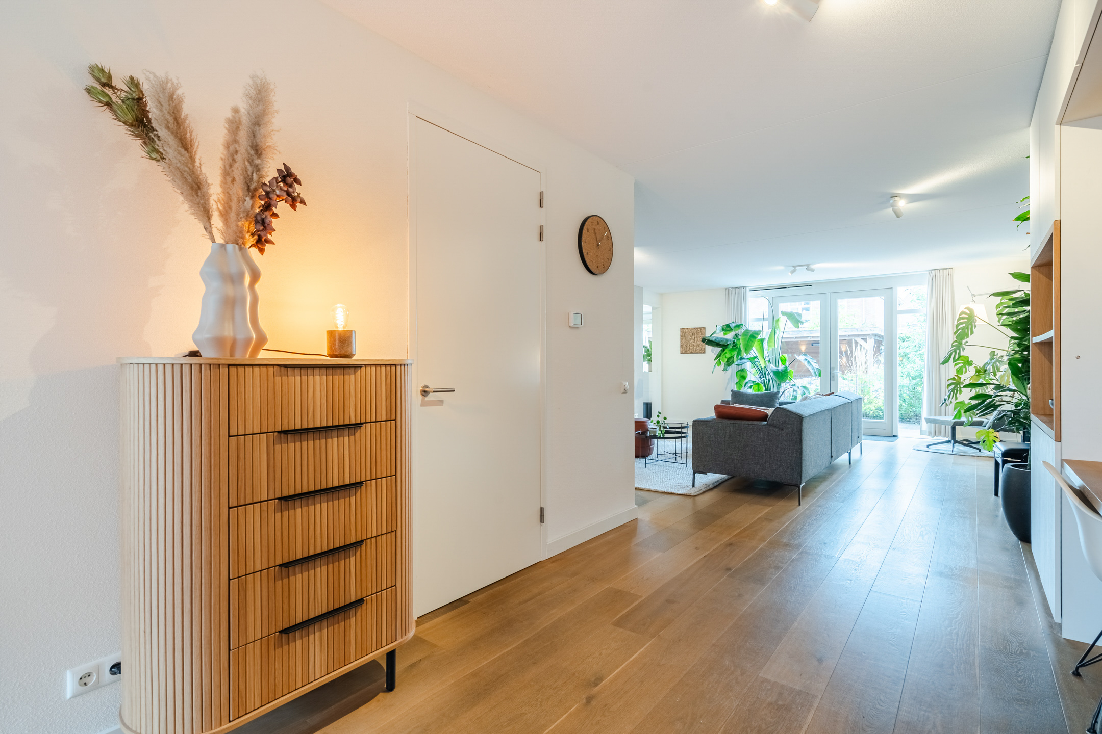 De entree bevindt zich aan de zijkant van het huis. Via de ruime hal word je op een prettige manier verwelkomd. Hier bevinden zich de garderobe, meterkast, een strakke toiletruimte met hangend toilet en fontein, de trapopgang naar de eerste verdieping, een praktische trapkast en de doorgang naar de living.