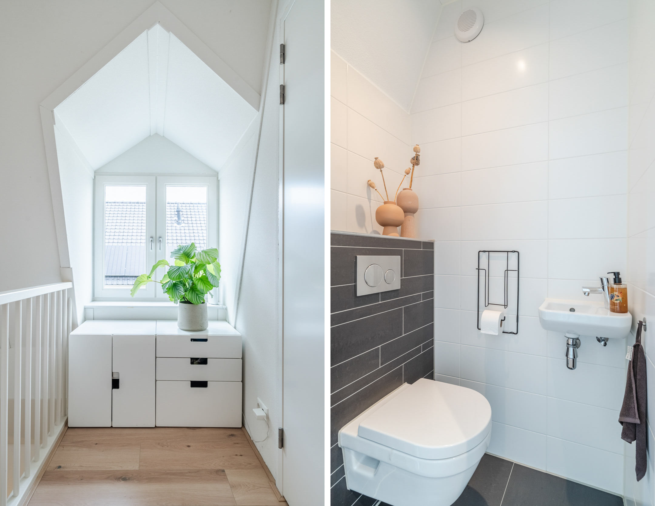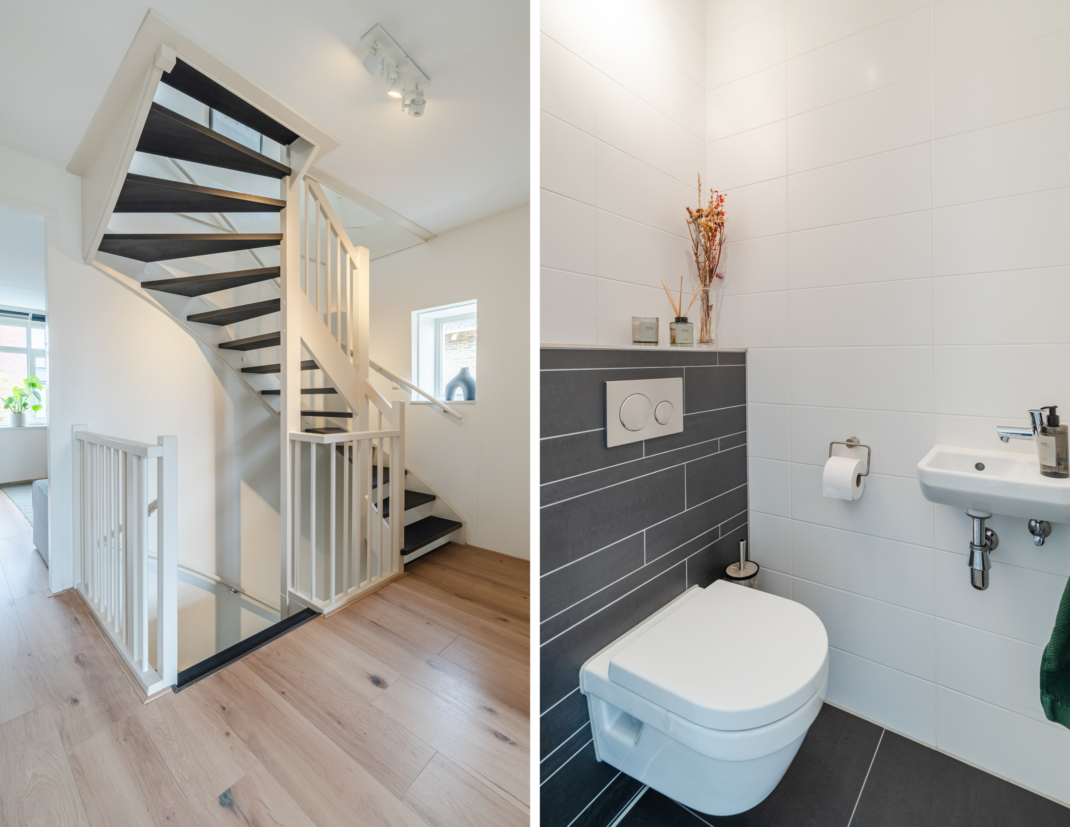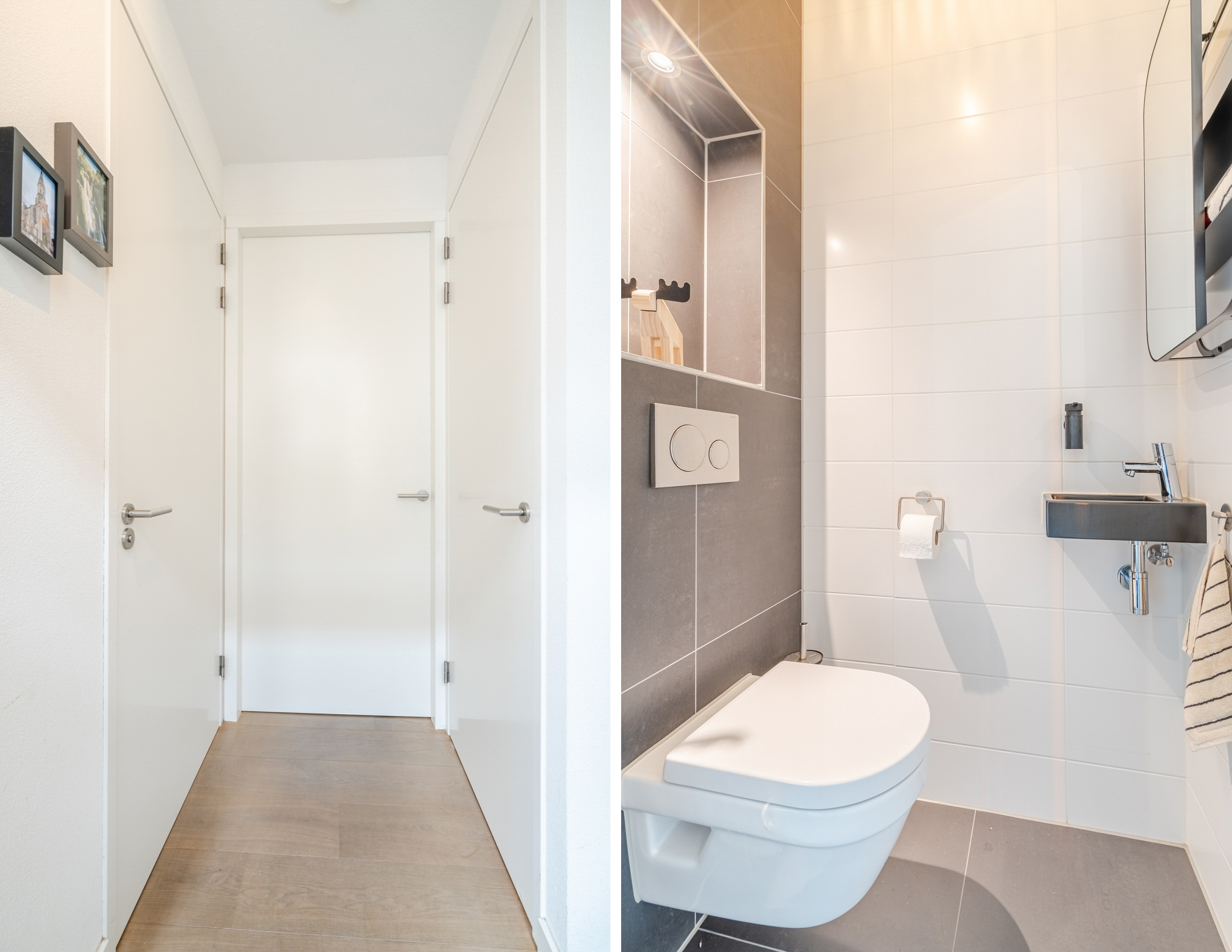 Naast de badkamer bevindt zich de aparte toiletruimte, voorzien van een hangend toilet en fontein, uitgevoerd in dezelfde stijlvolle afwerking als de badkamer. De gehele eerste verdieping beschikt over vloerverwarming voor optimaal comfort en is afgewerkt met een strakke laminaatvloer.