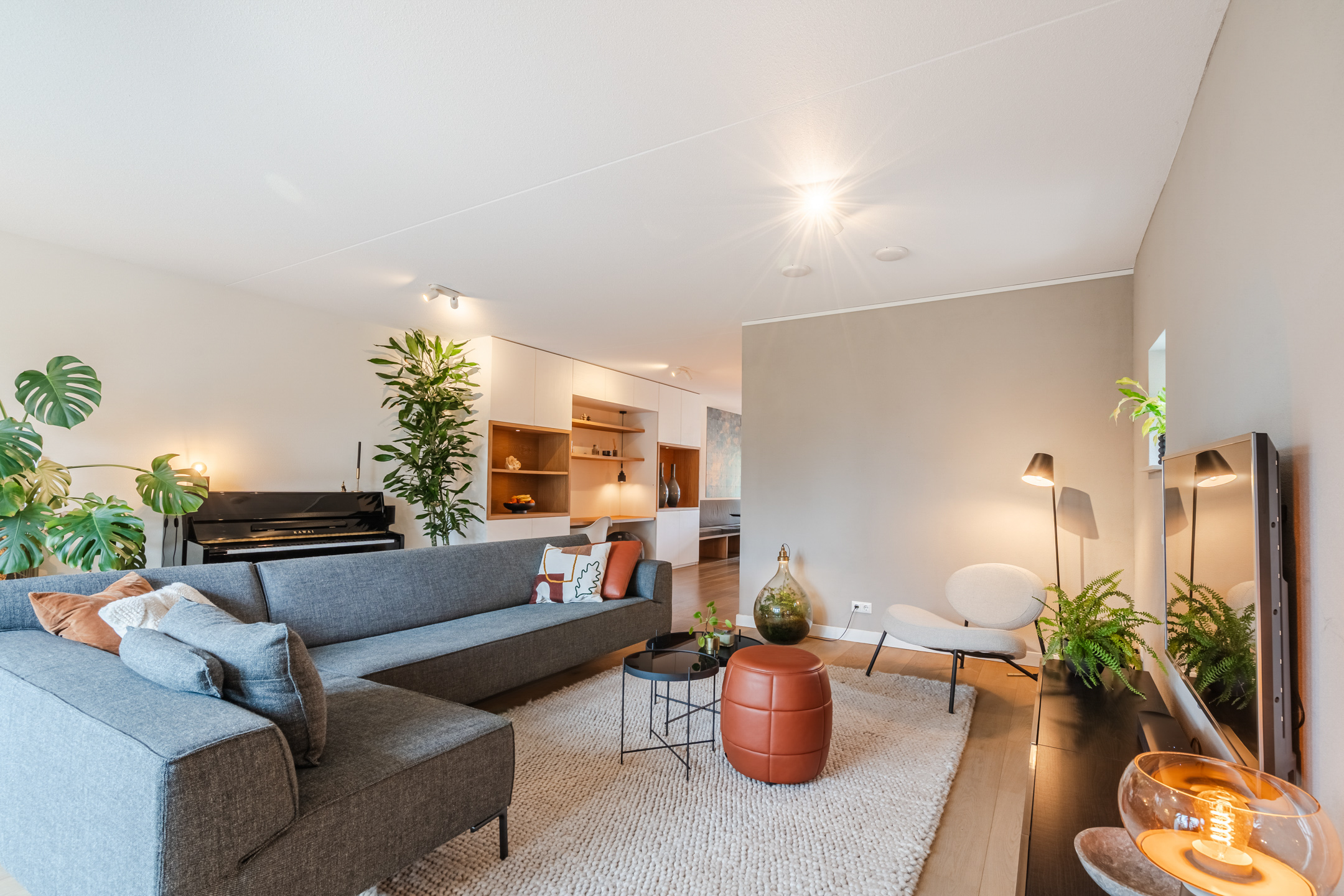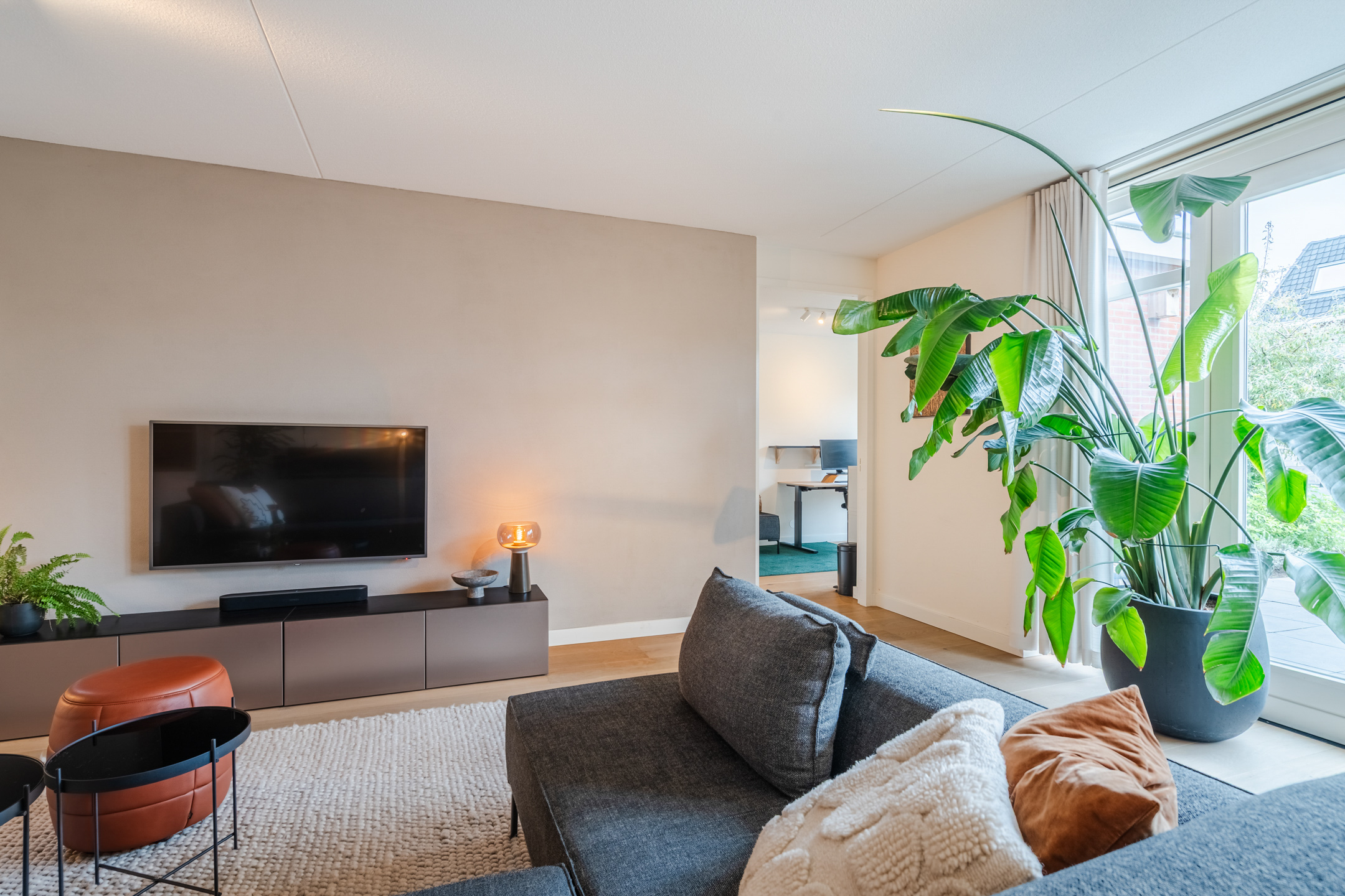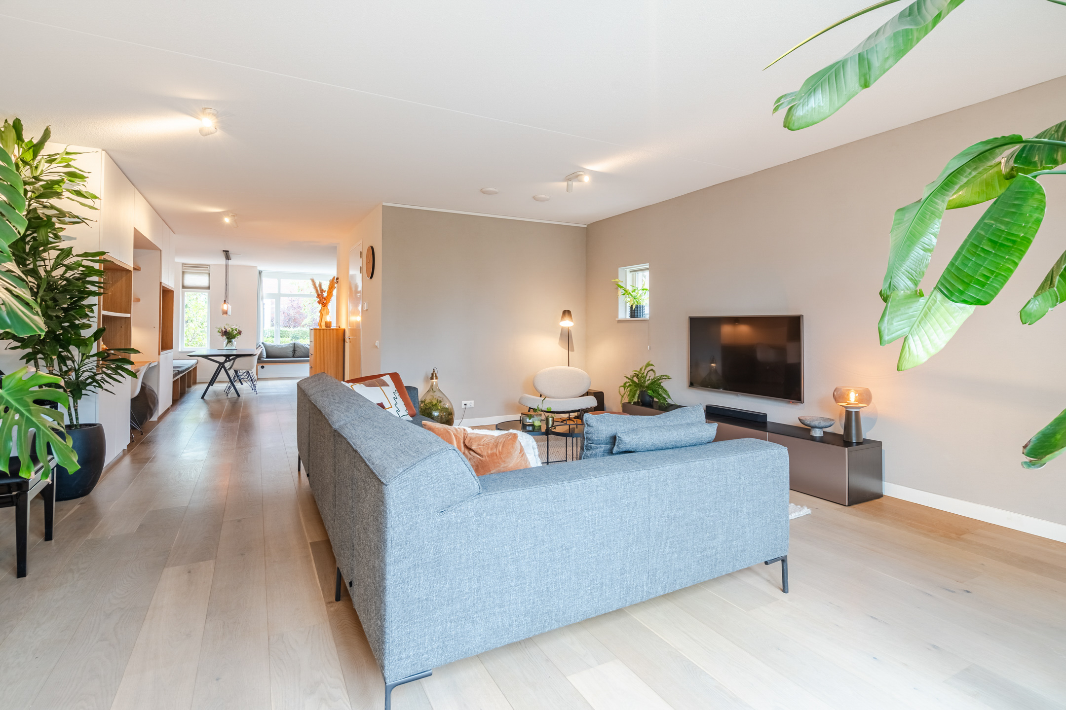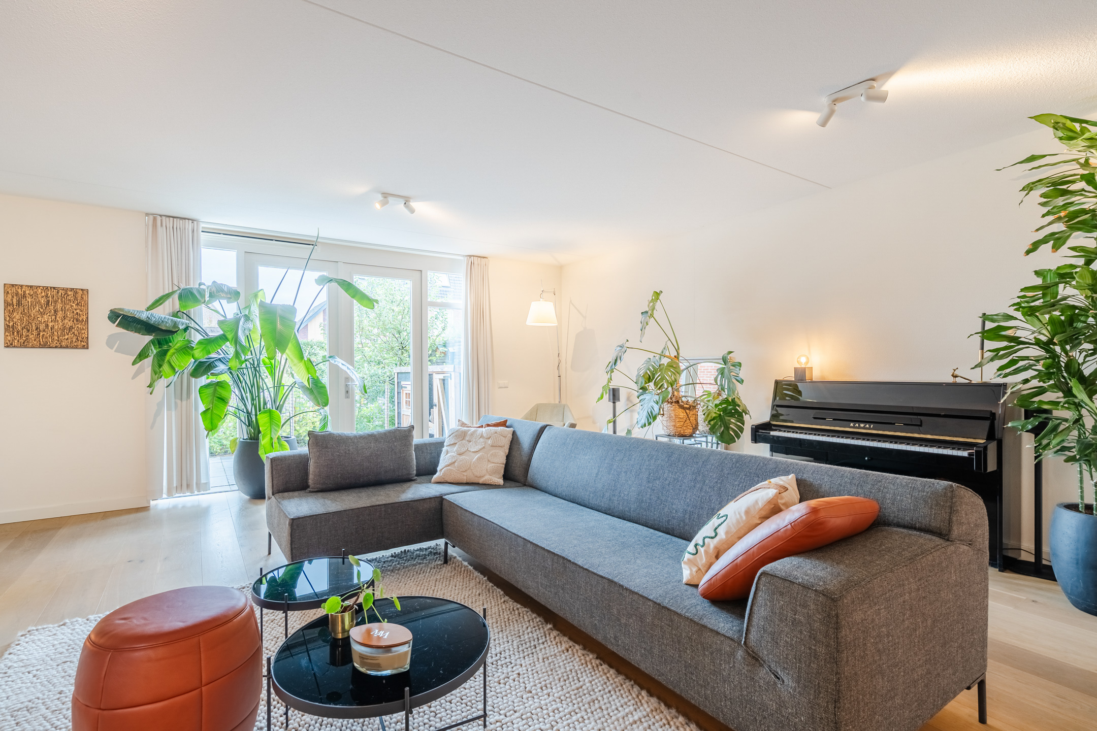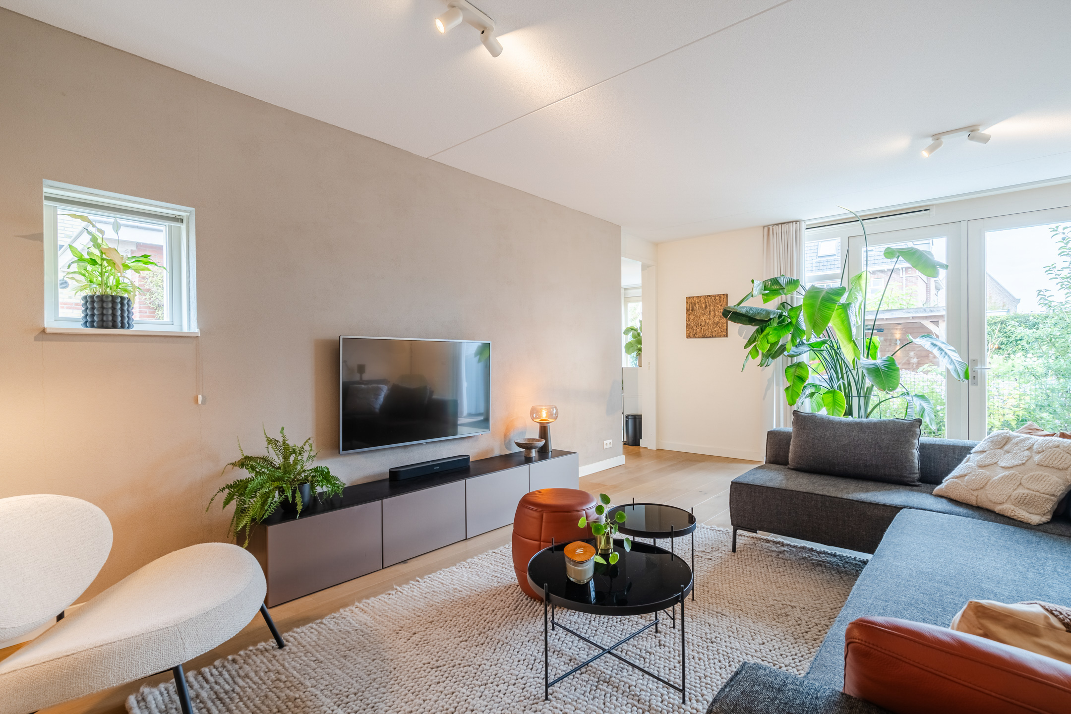De tuingerichte woonkamer met openslaande deuren naar de tuin ademt rust, licht en modern comfort. Het is een heerlijke plek om na een lange dag lekker op de bank te ploffen en te genieten van je favoriete serie. Dankzij het prettige formaat (ca. 36 m2) is de ruimte eenvoudig naar wens in te richten.