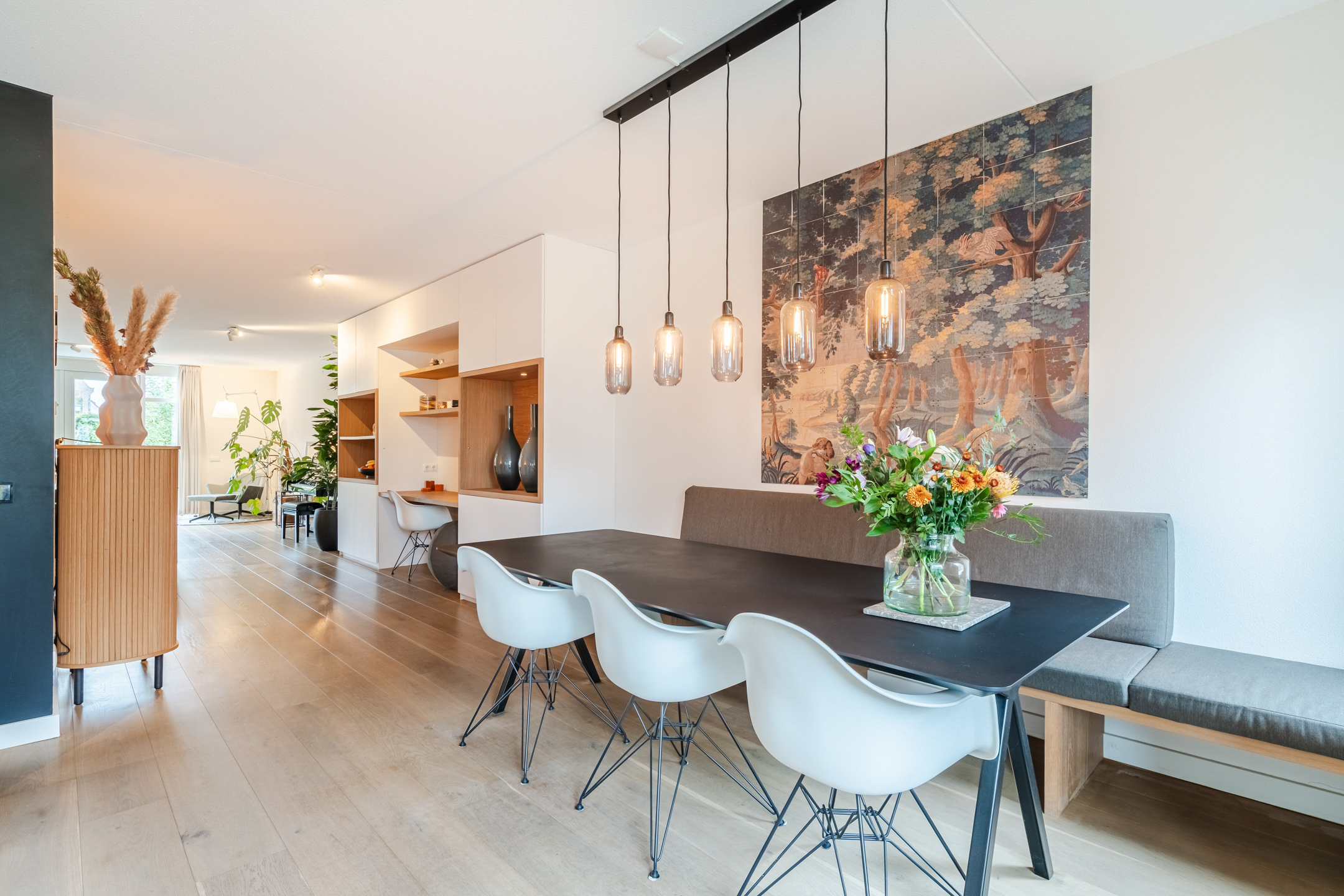 De eethoek vormt het hart van dit warme gezinshuis. De op maat gemaakte bank combineert comfort met stijl en nodigt uit tot lange avonden tafelen. Dankzij de royale ruimte is er plek voor een grote eettafel, waar familie en vrienden samen kunnen genieten — met direct contact tussen de eetruimte en de keuken, wat zorgt voor een gezellige en open sfeer.