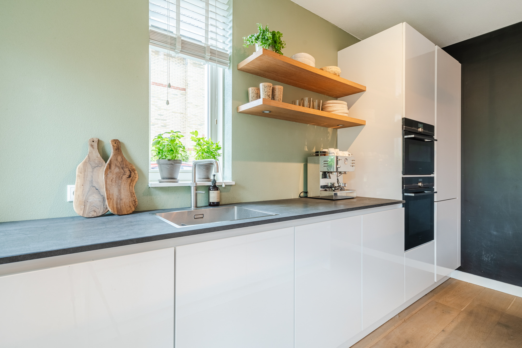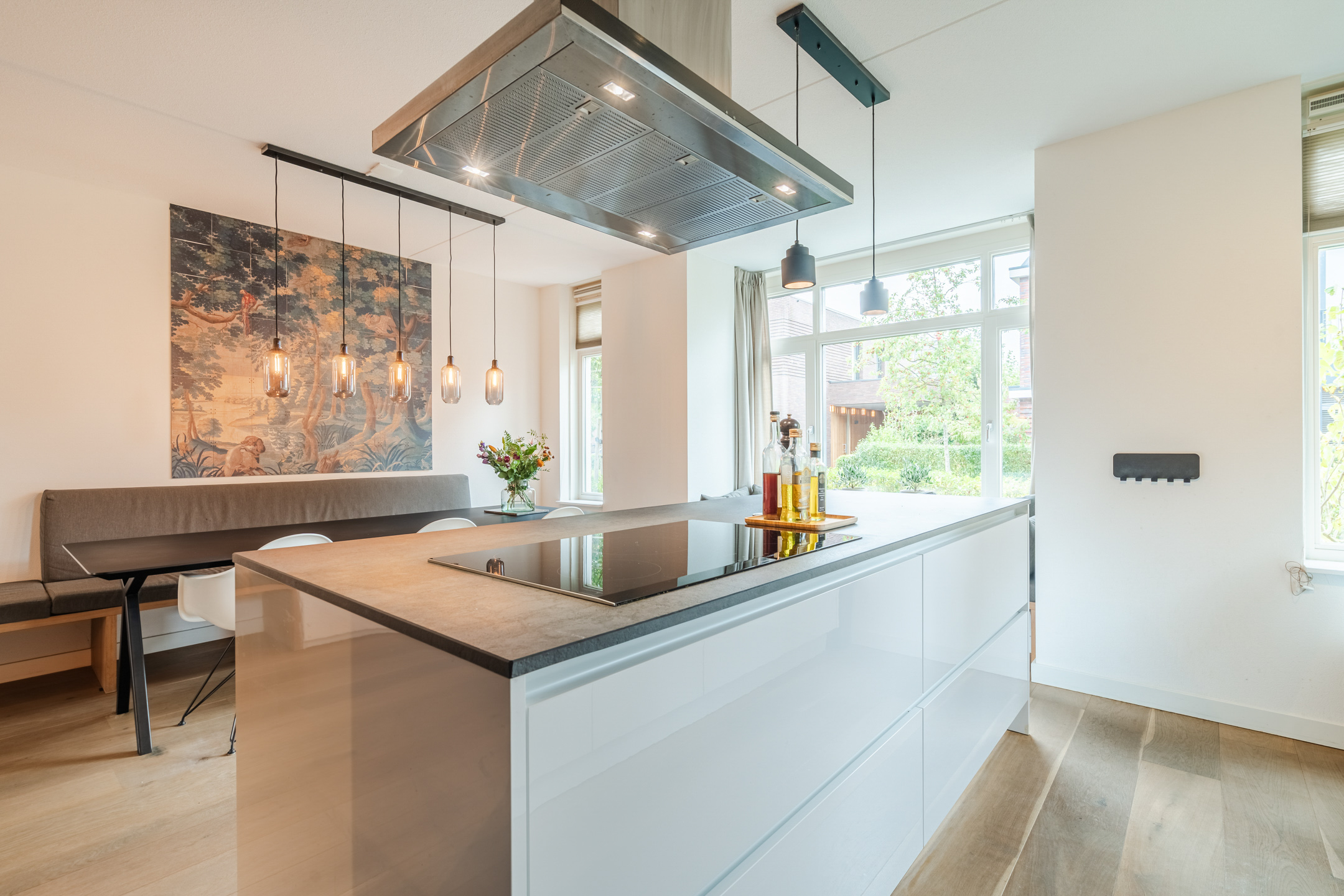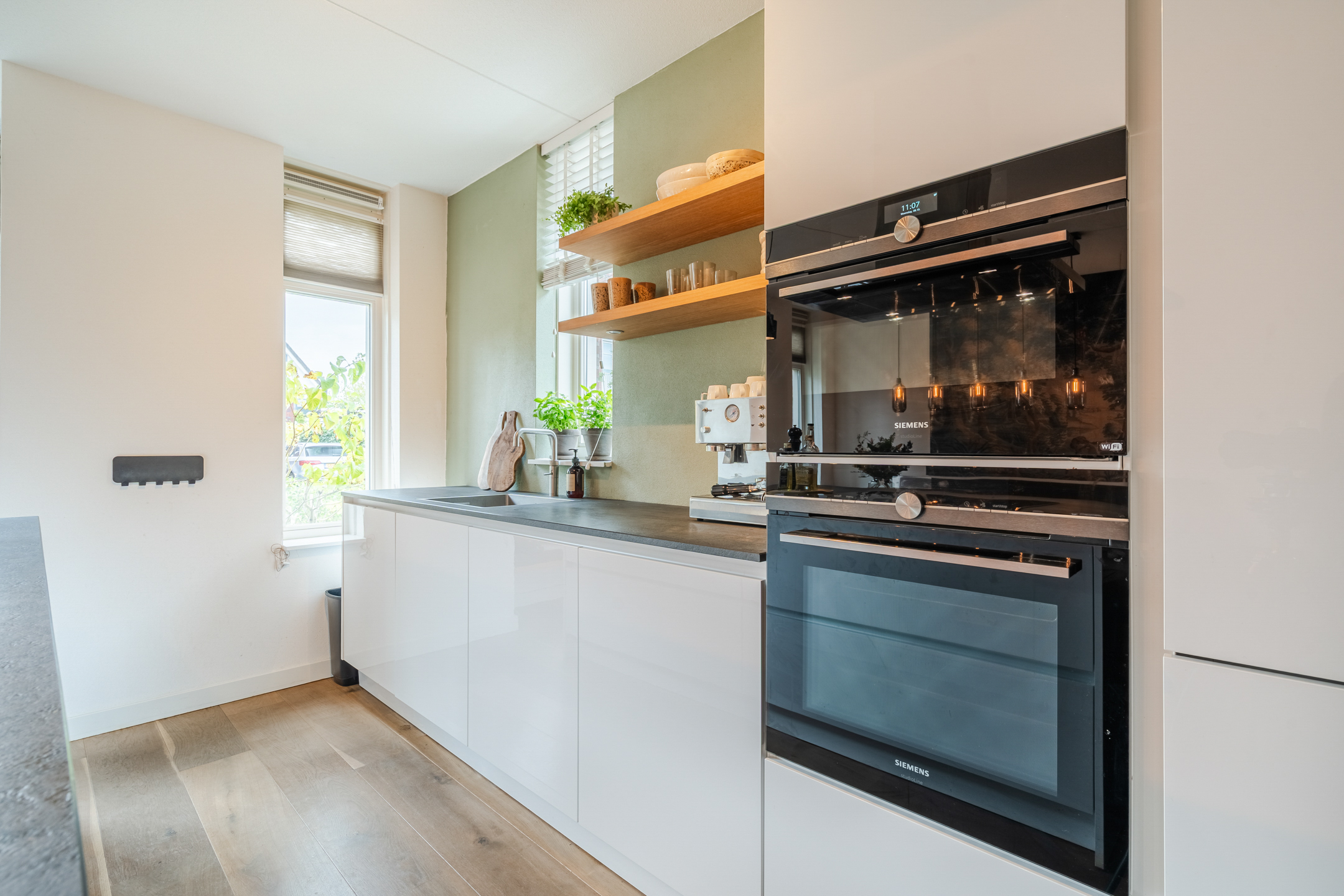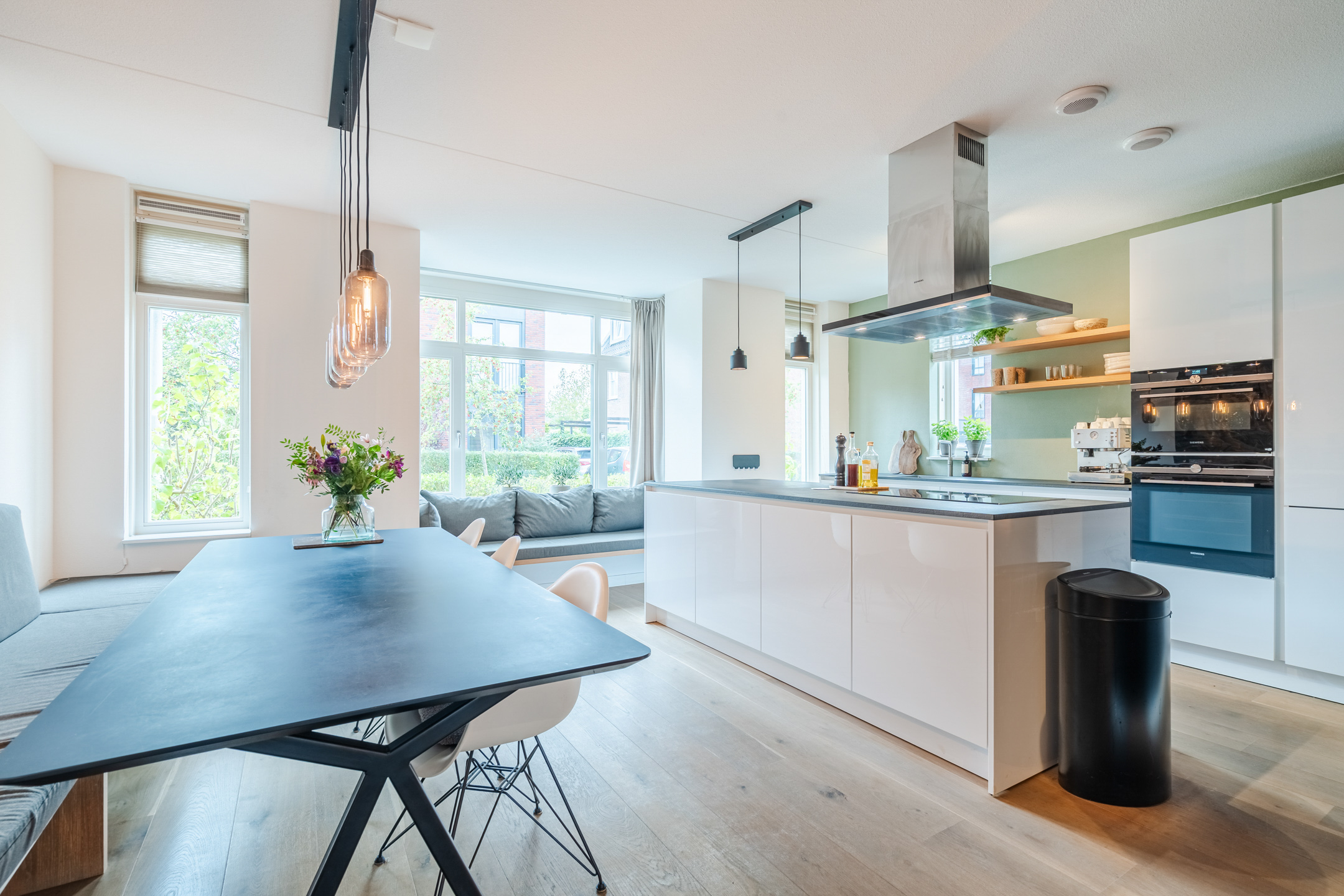Aan de voorzijde van de woning ligt de fijne woonkeuken, die dankzij de vele raampartijen een heerlijk open sfeer heeft. De ruime Siematic-keuken is voorzien van hoogwaardige Siemens-inbouwapparatuur, waaronder een inductiekookplaat, koel-vriescombinatie, Quooker-kraan, vaatwasser, oven en oven/stoomoven-combi). Daarnaast biedt de keuken veel opbergruimte dankzij de diepe lades en kasten in zowel het kookeiland als het aanrechtgedeelte.