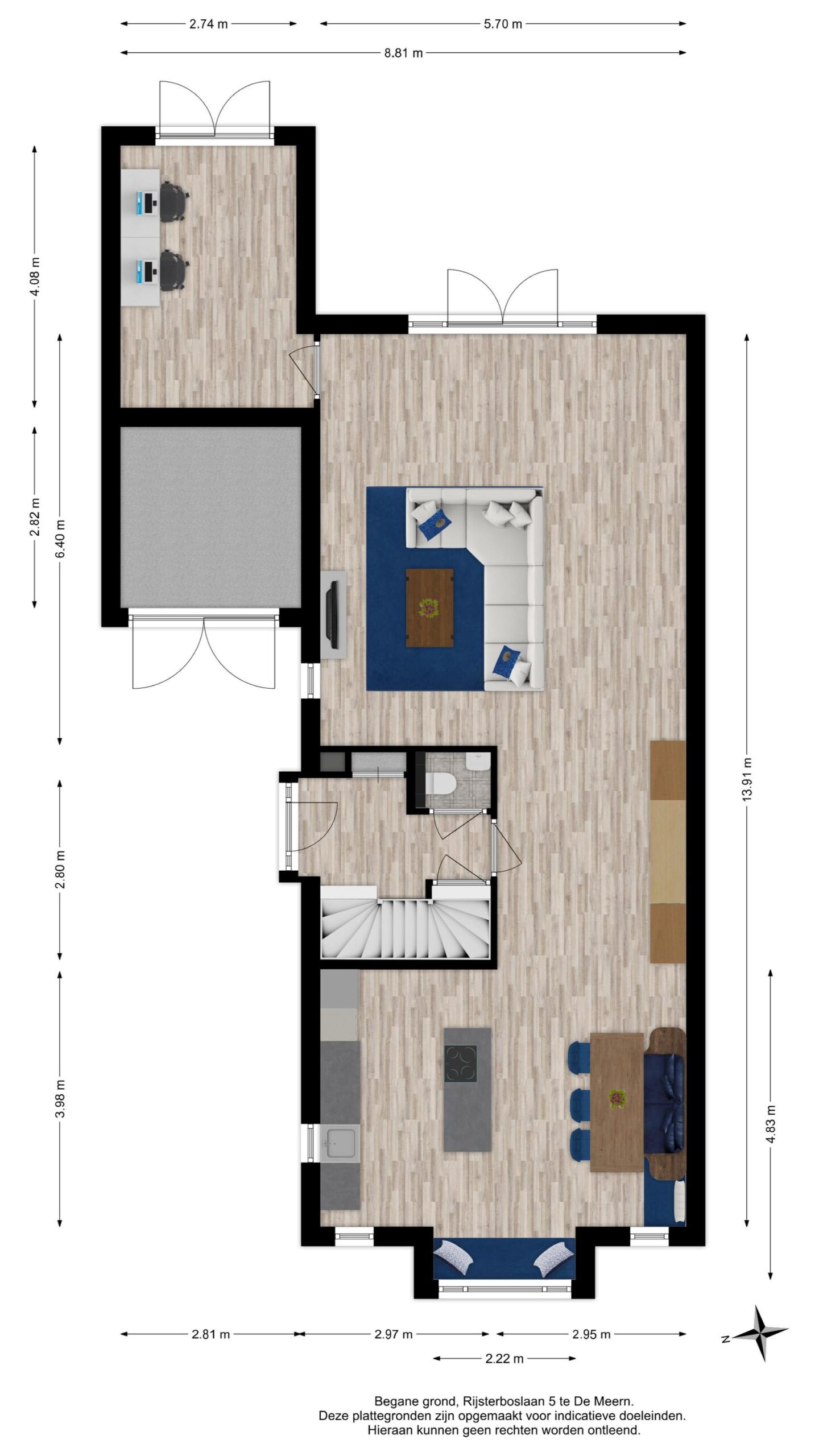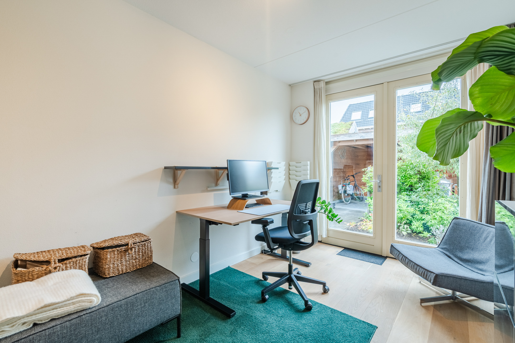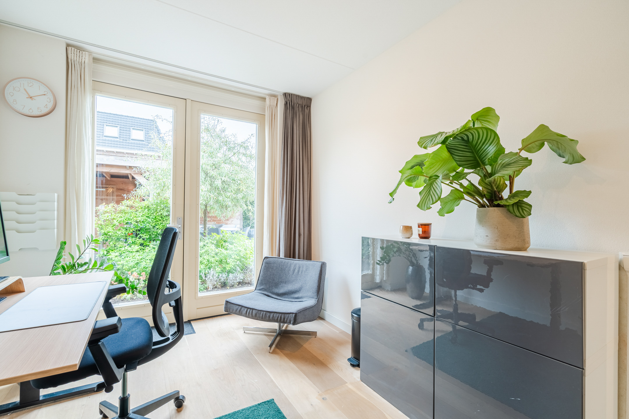 Aangrenzend bevindt zich een multifunctionele tuinkamer (ca. 11 m²), wederom met openslaande deuren naar de tuin, die momenteel is ingericht als werkkamer maar ook geschikt is als speelkamer voor de kinderen of als extra slaapkamer op de begane grond.