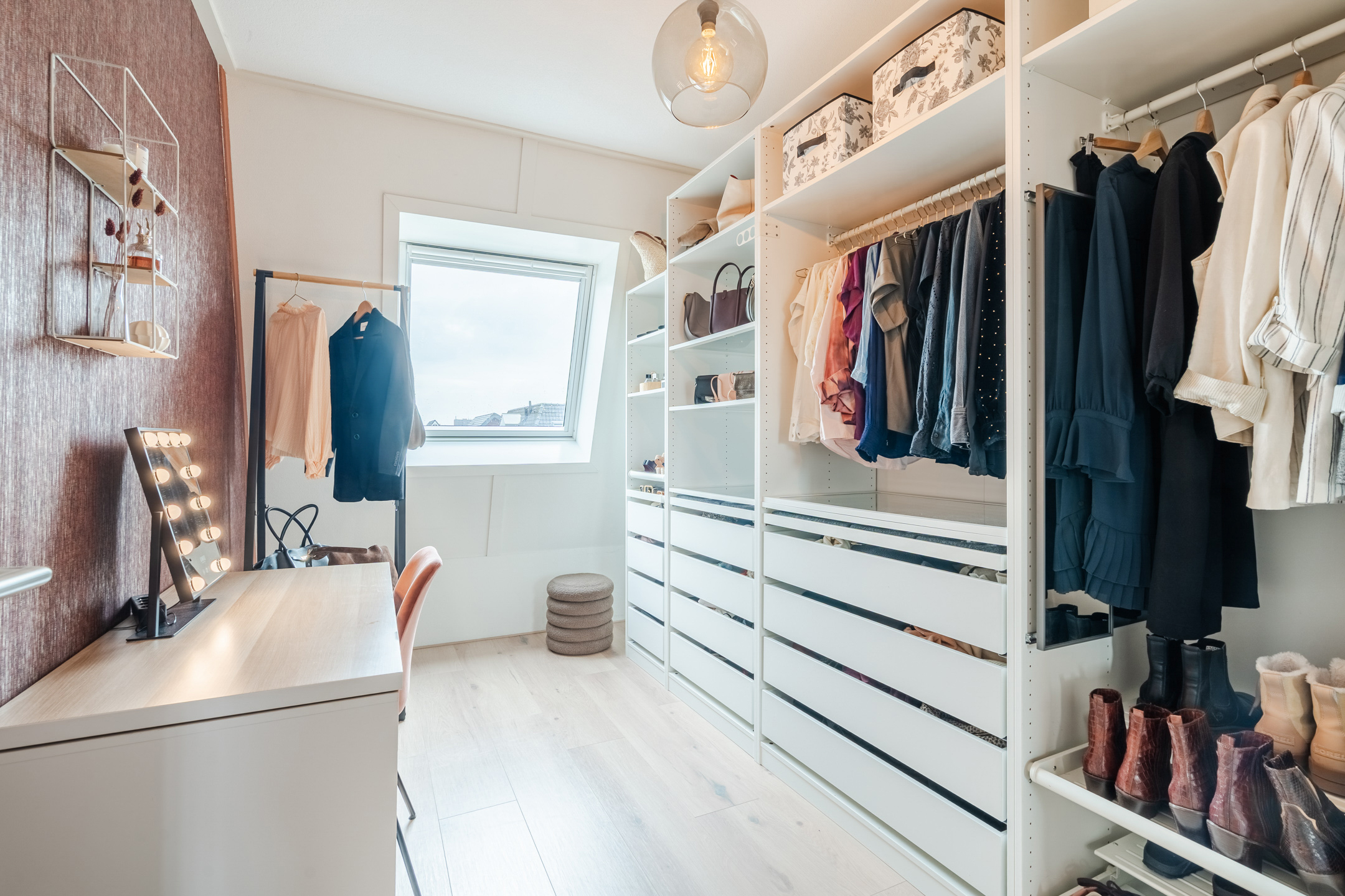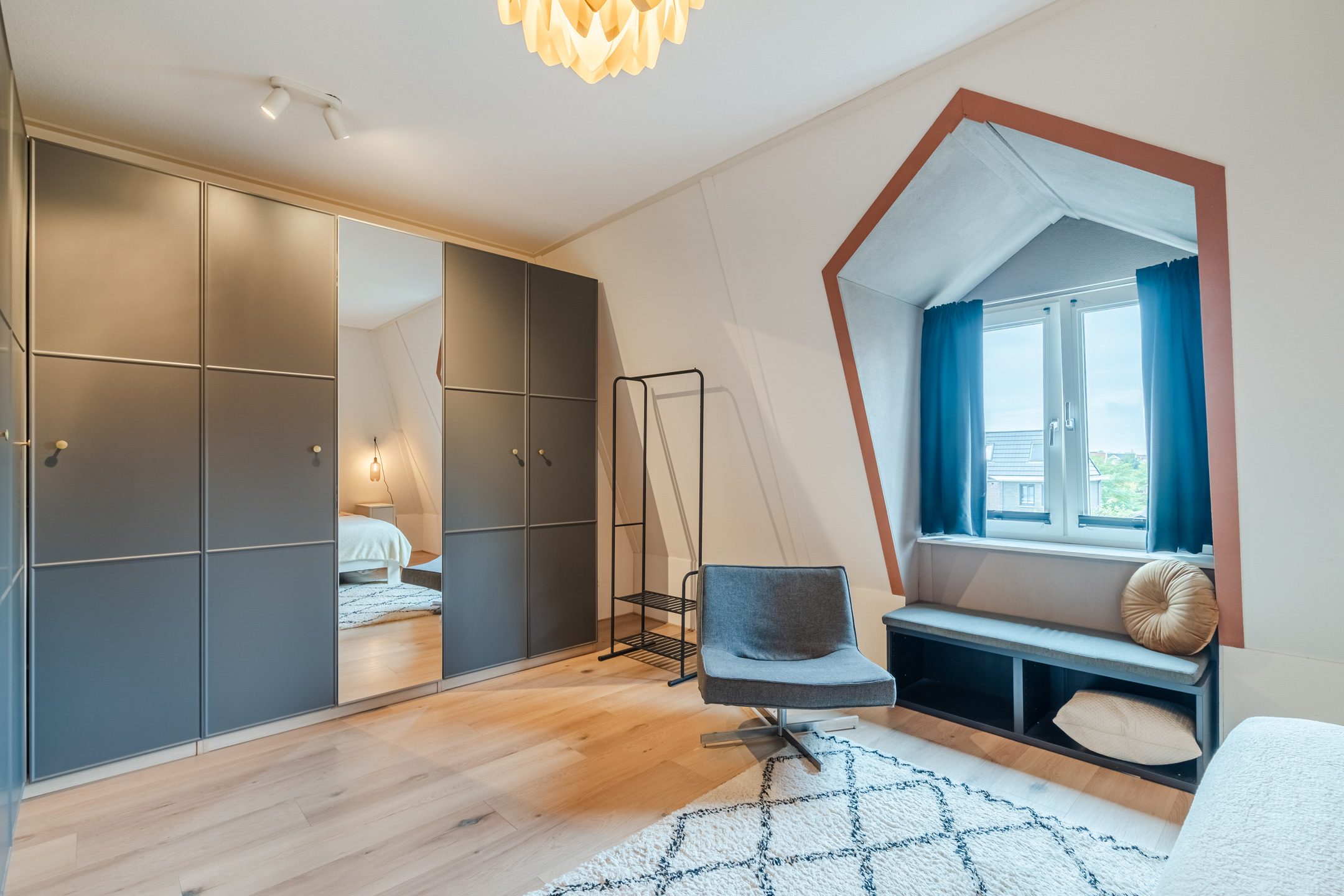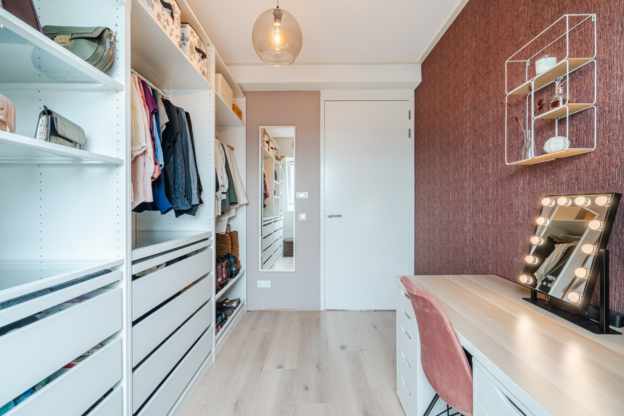 De naastgelegen kamer vormt de vijfde slaapkamer (ca. 9 m²). Deze ruimte is momenteel ingericht als walk-in closet, maar kan eenvoudig worden gebruikt als een slaapkamer of thuiswerkplek, afhankelijk van je woonwensen.