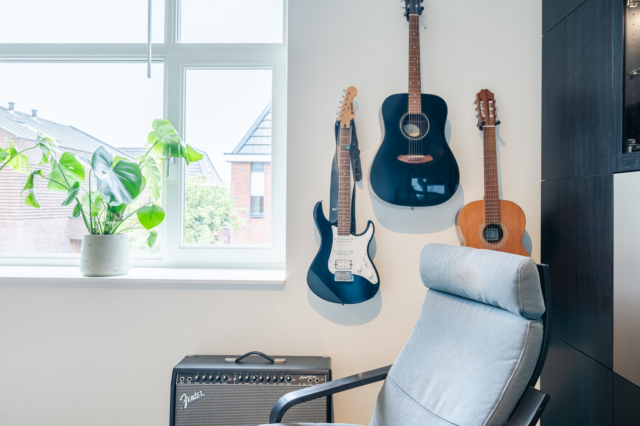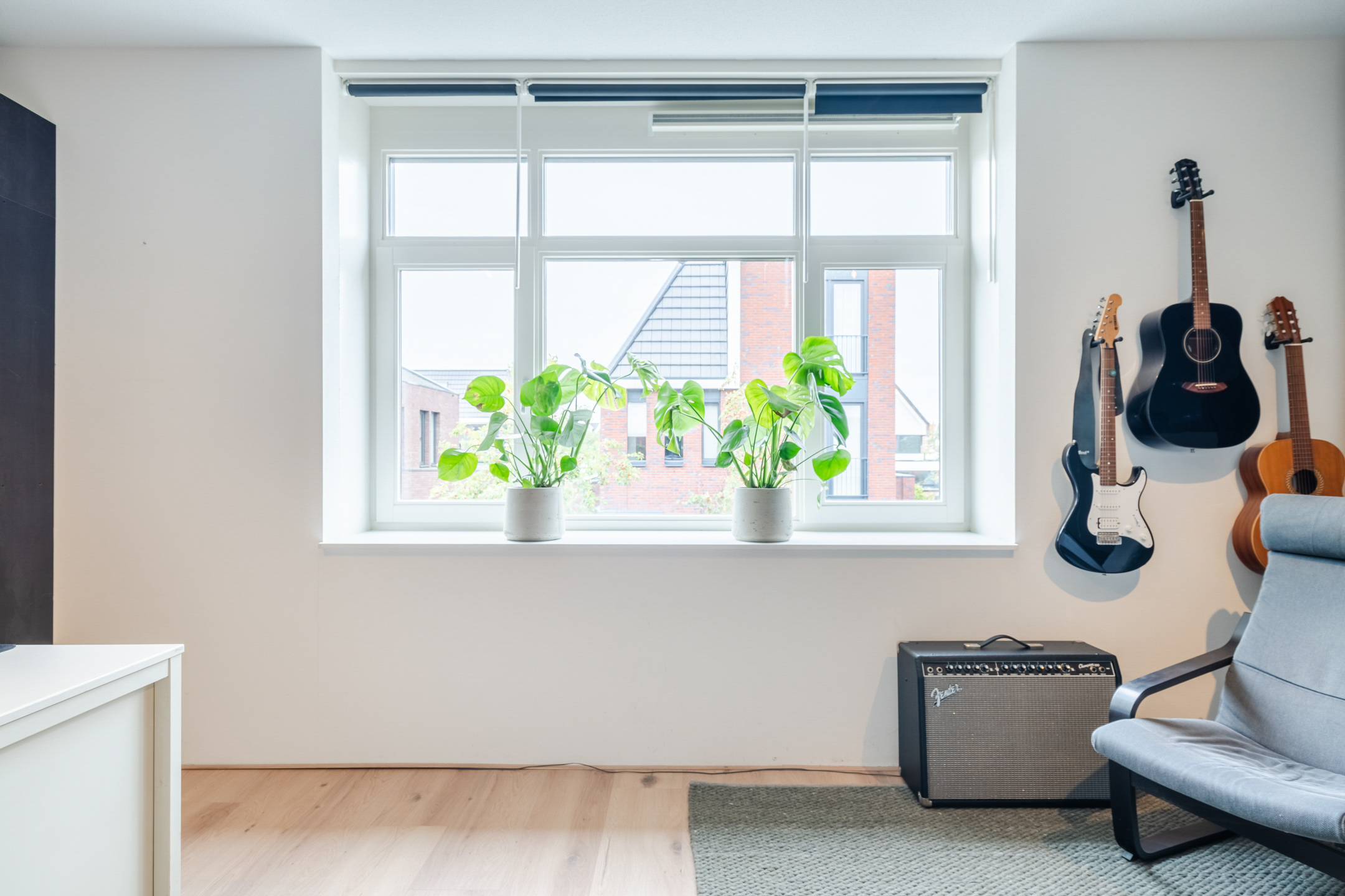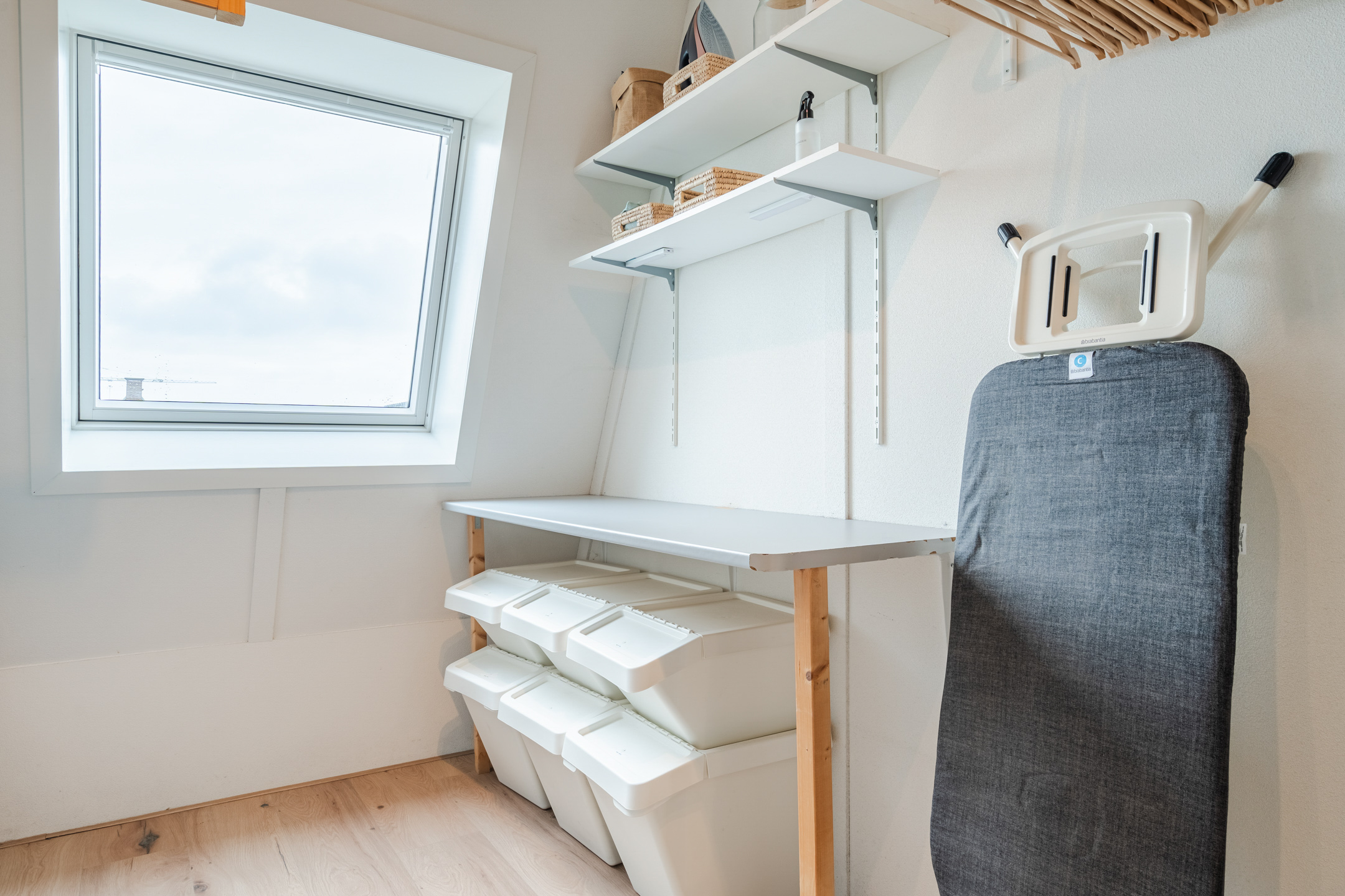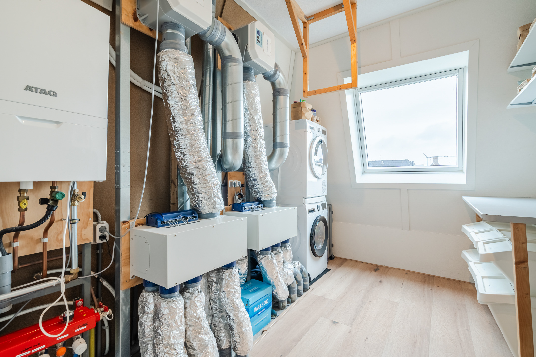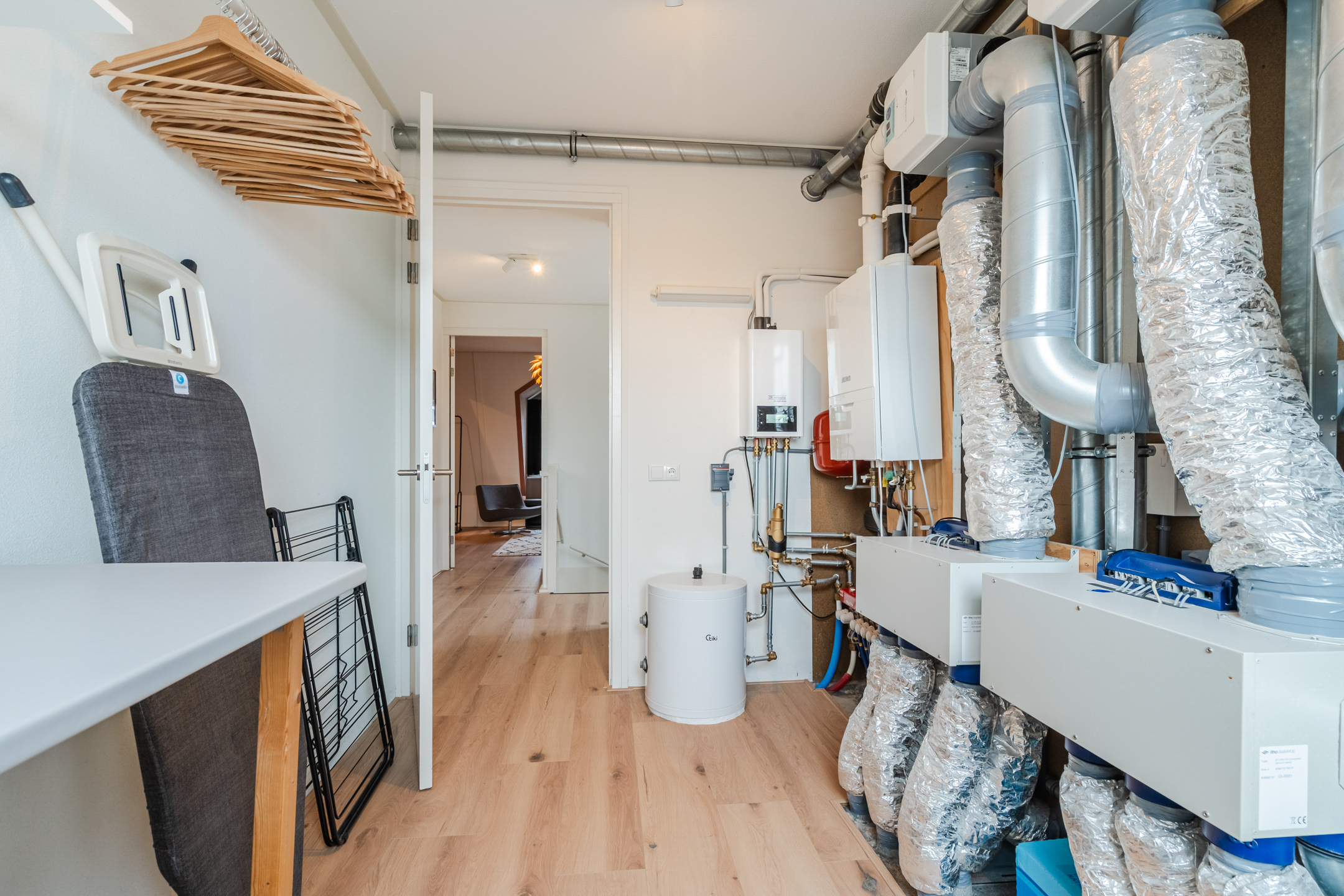 Eén van deze kamers is ingericht als was- en technische ruimte (ca. 11 m²) en biedt plek voor de CV-ketel, hybride warmtepomp, verdeler van de vloerverwarming, mechanische ventilatie en de omvormers van de zonnepanelen. Hier zijn ook de wasmachine en droger opgesteld. Dankzij het Velux-dakraam valt er prettig daglicht binnen en is er voldoende ventilatiemogelijkheid om de was goed te laten drogen.