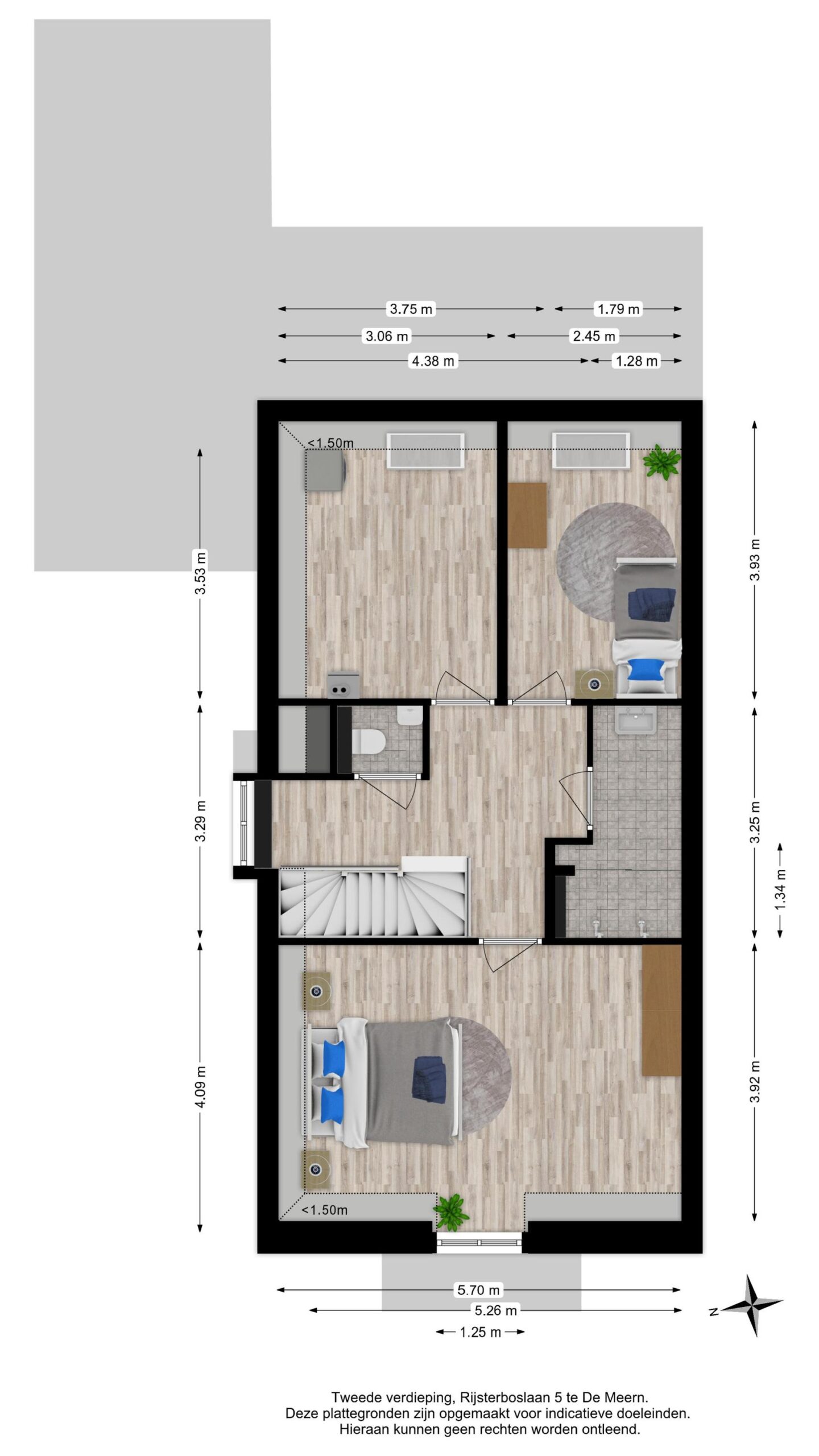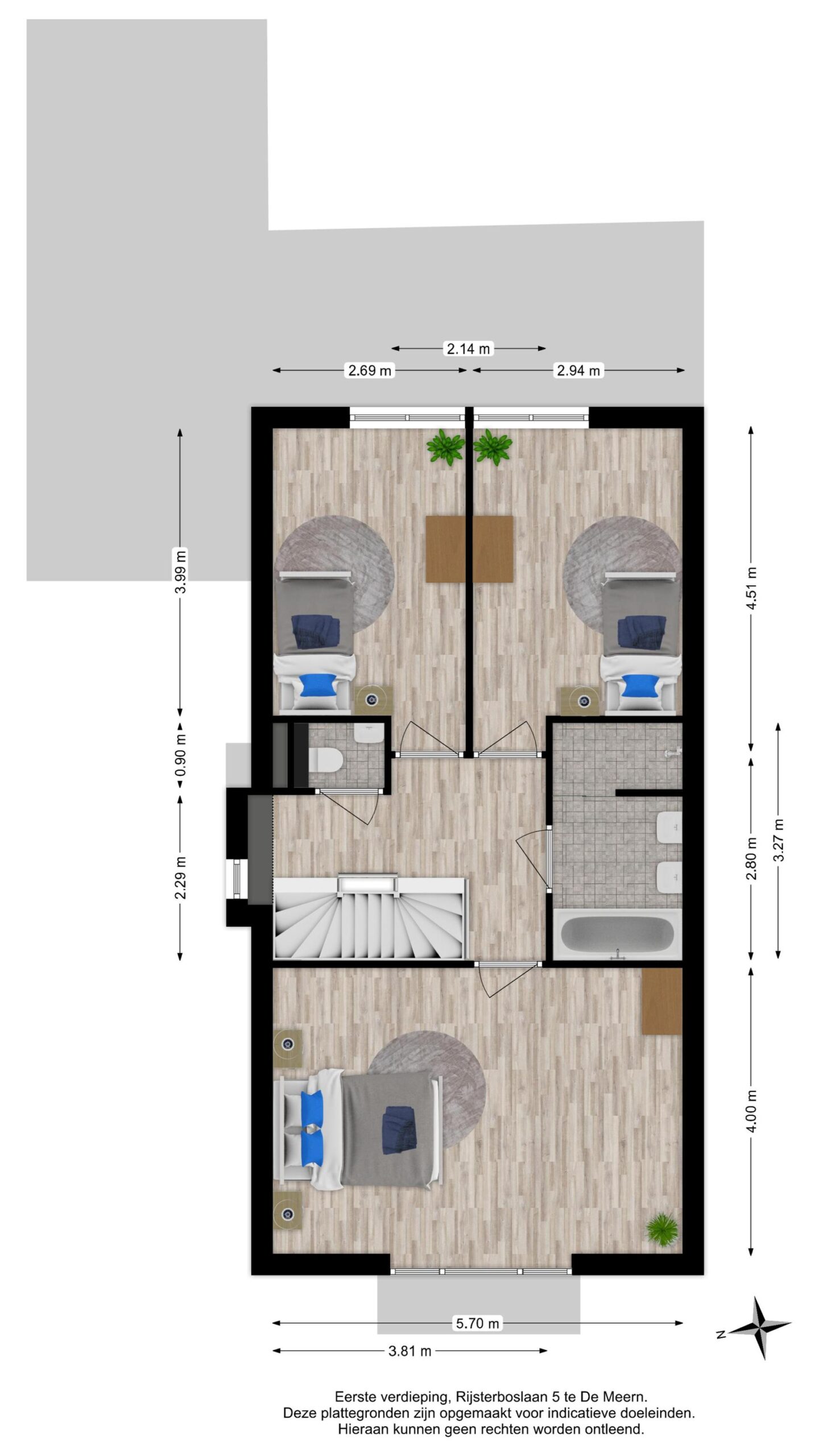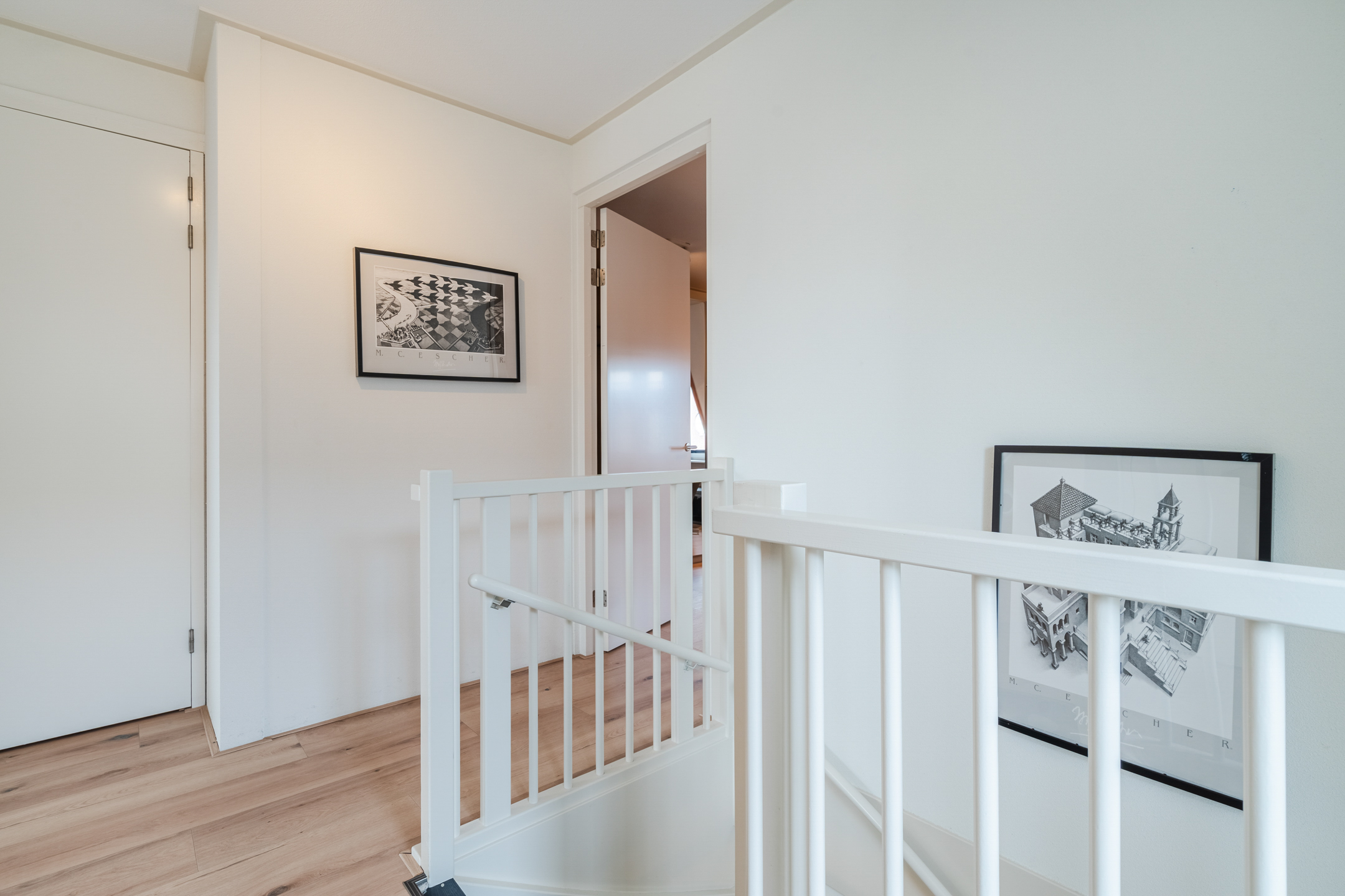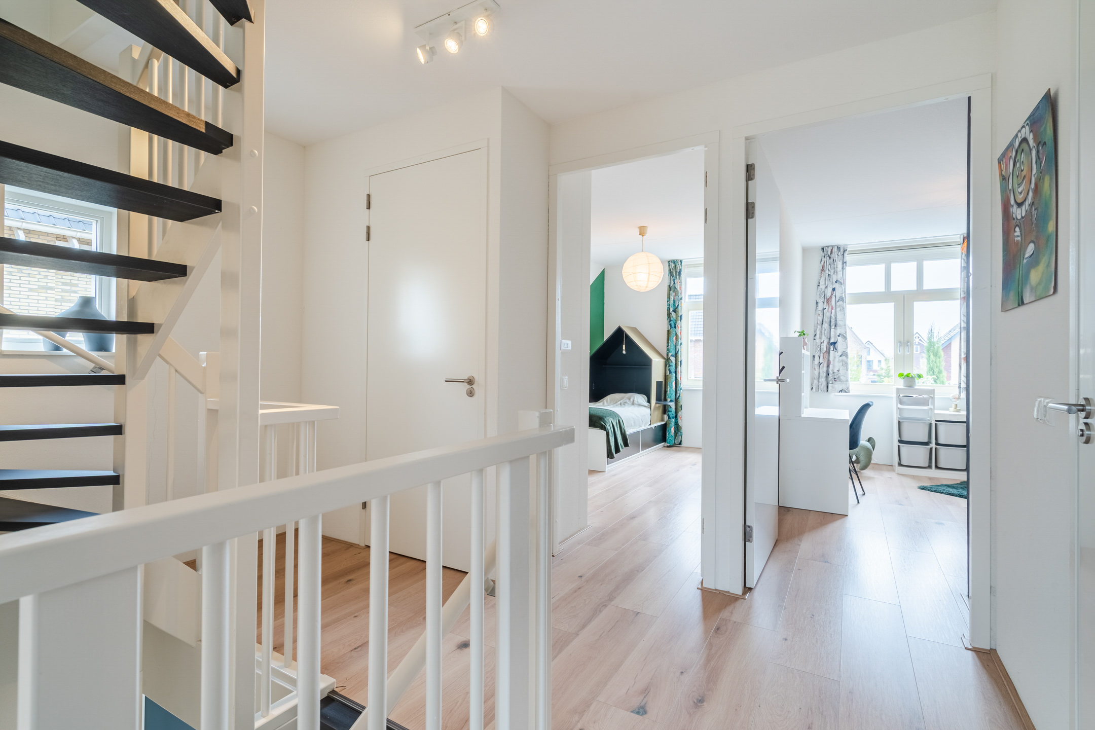 Via de trapopgang kom je uit op de riante overloop. Door de aanwezigheid van het raam aan de zijkant van de woning is er een prettige lichtinval. Vanuit hier heb je toegang tot drie slaapkamers, de badkamer en de separate toiletruimte. Twee slaapkamers bevinden zich aan de achterzijde van de woning (ca. 11 m2 & 12 m2). De grootste slaapkamer bevindt zich aan de voorzijde, door het riante oppervlak van ca. 23 m2 vormt dit een perfecte werkruimte of masterbedroom.