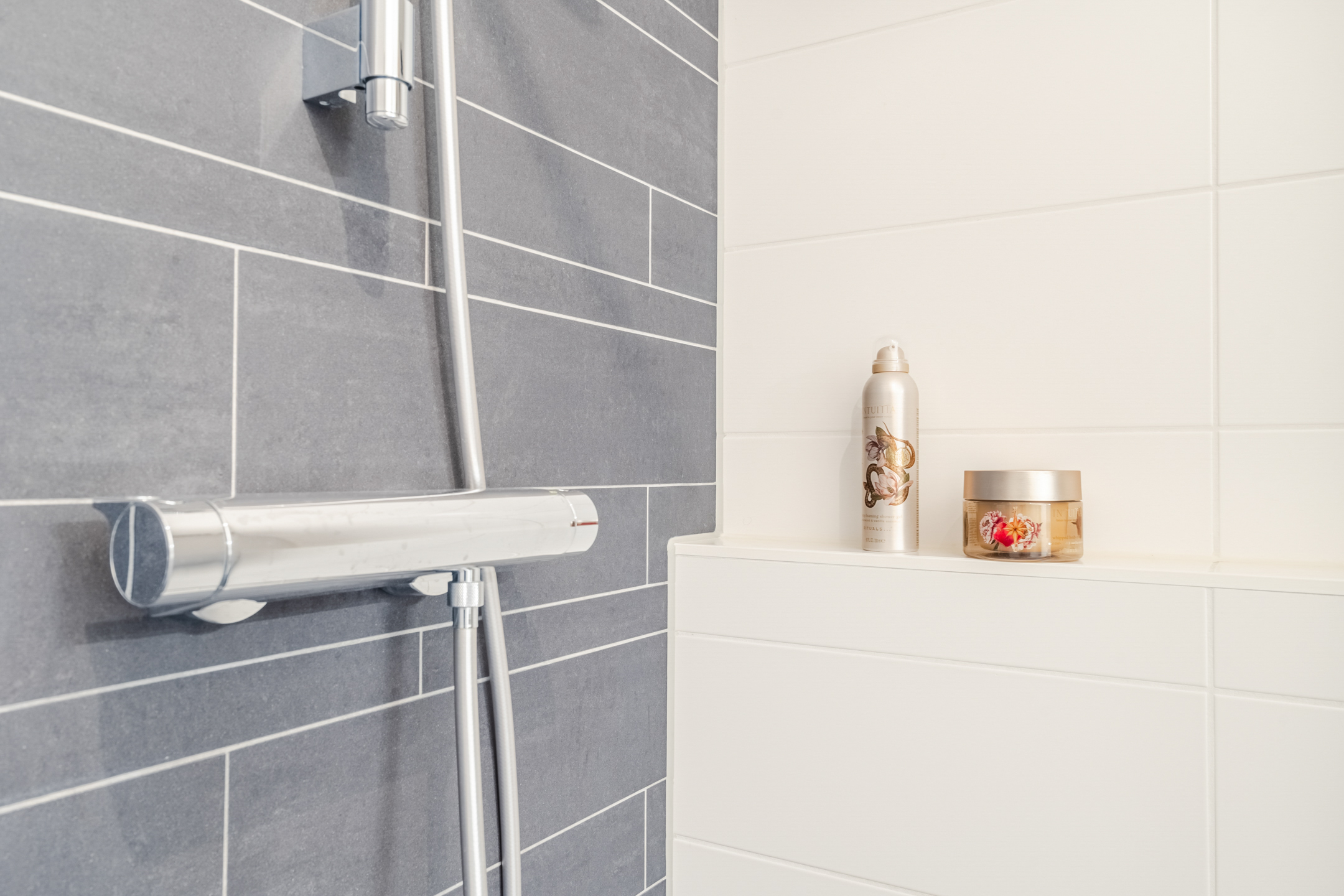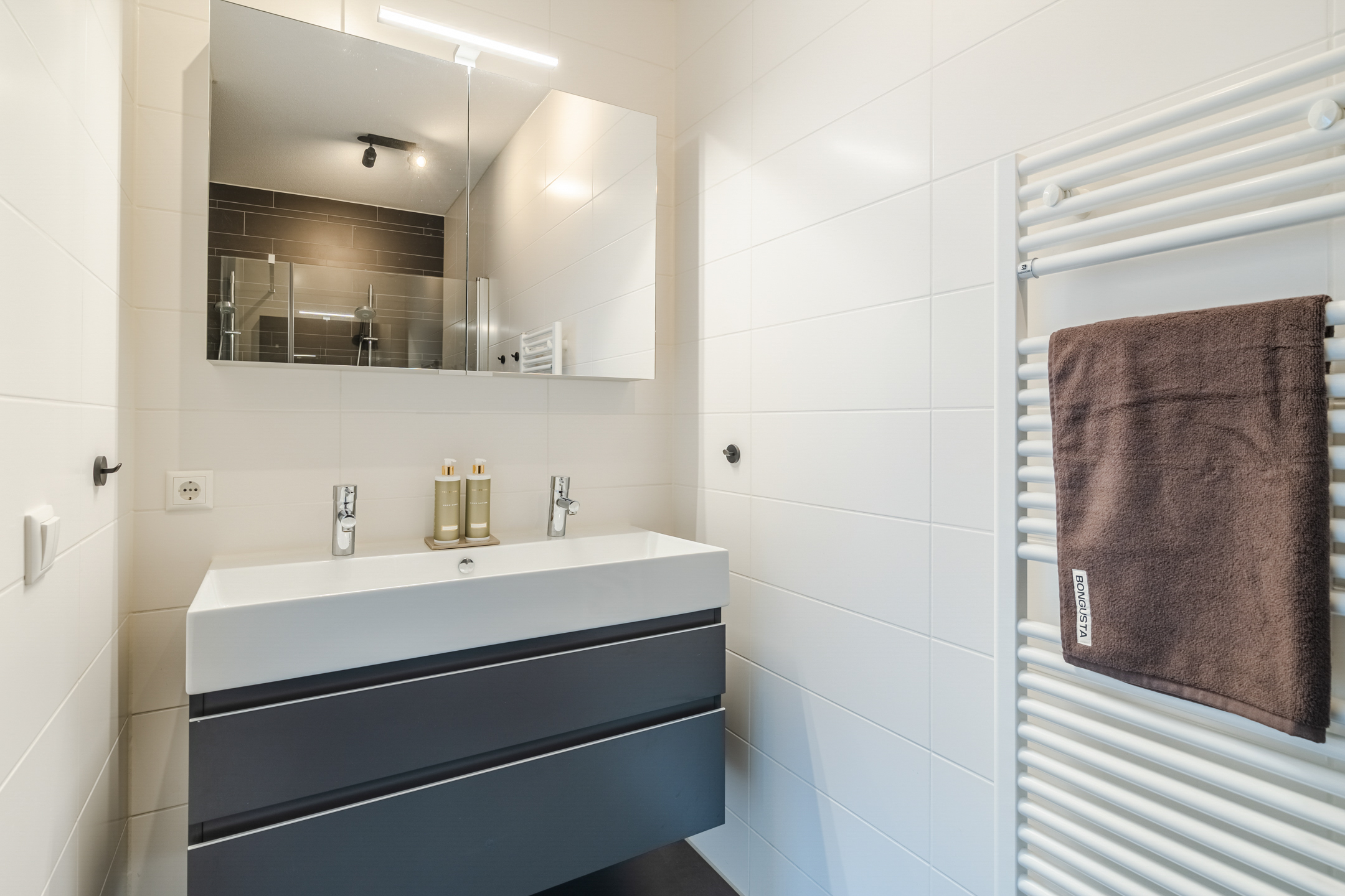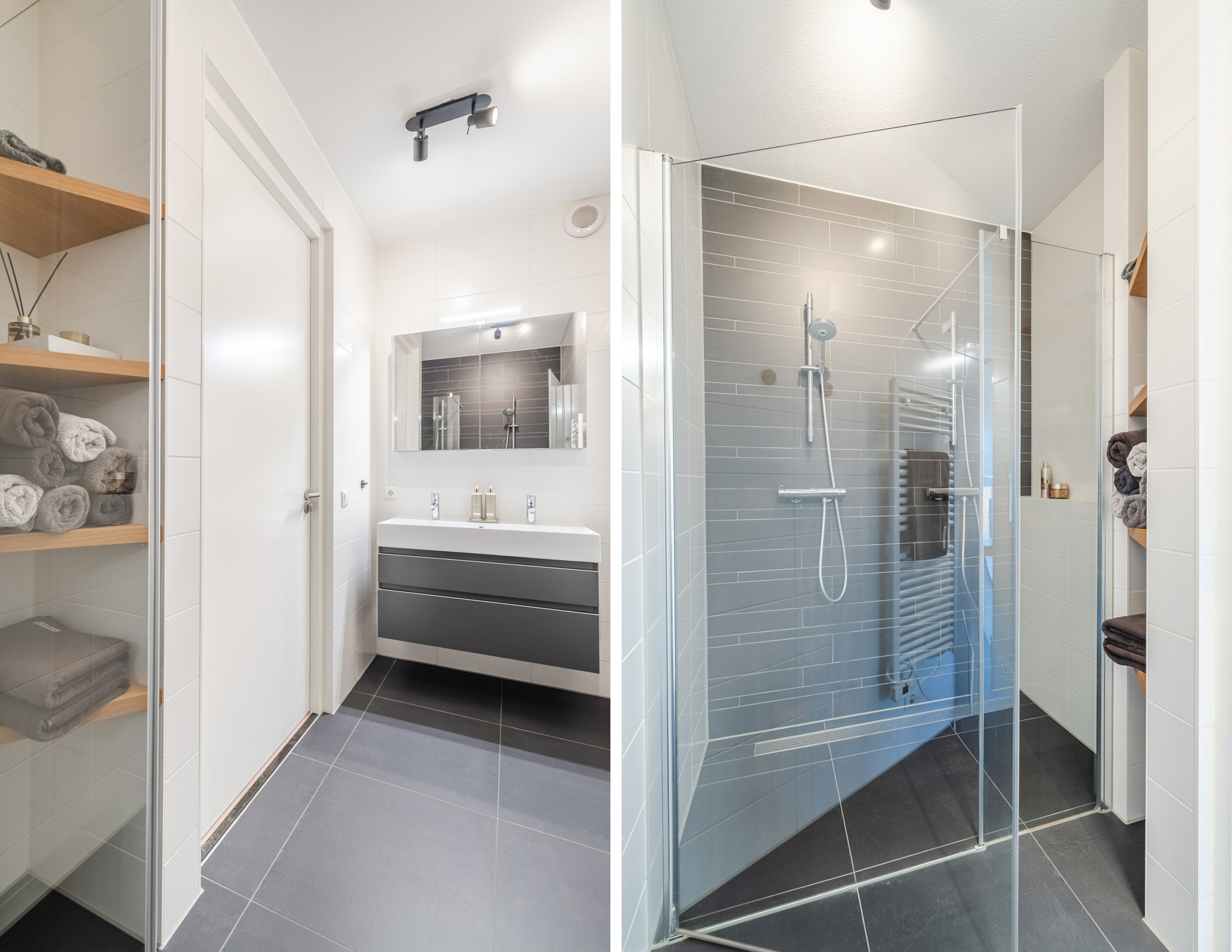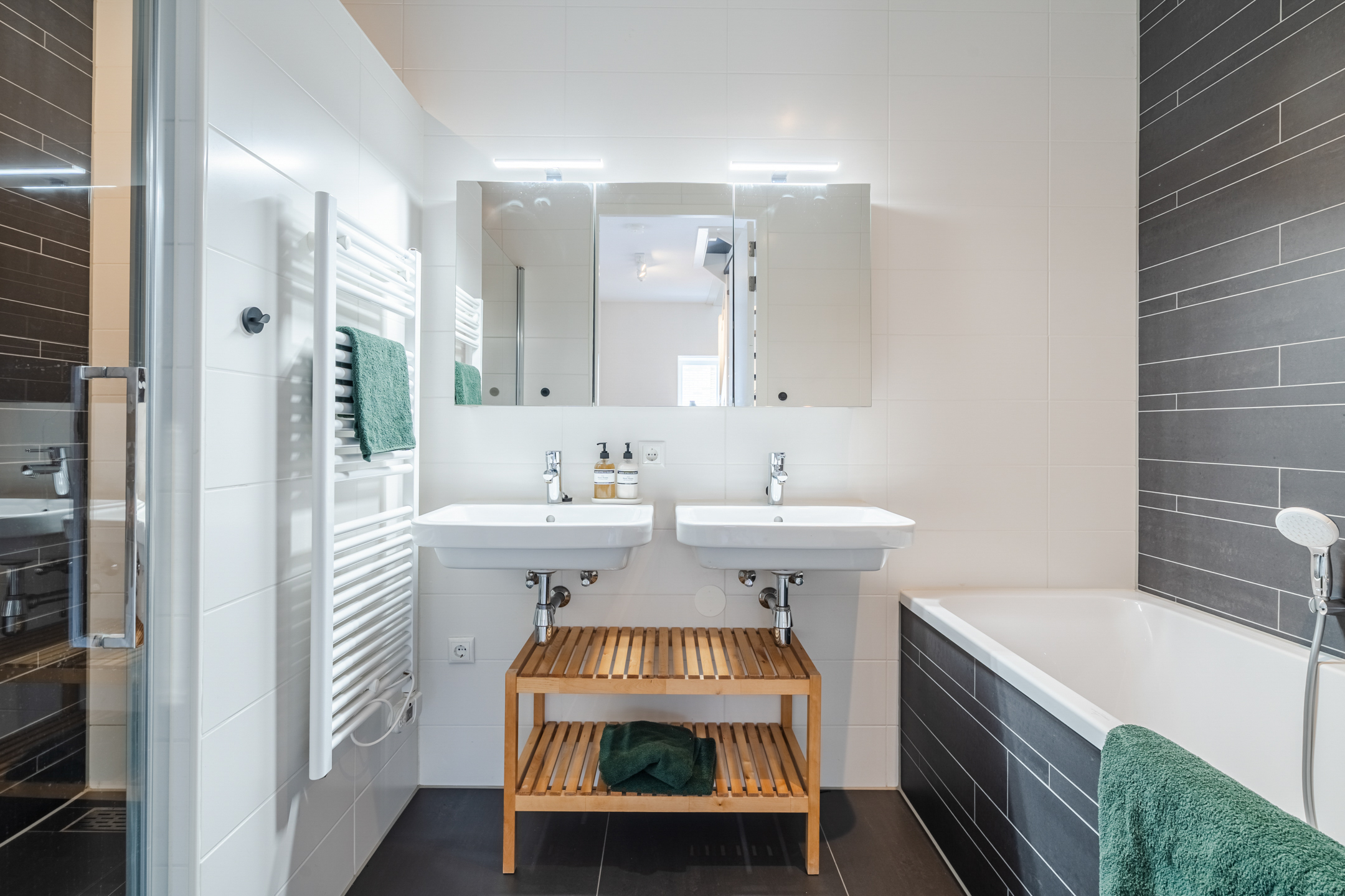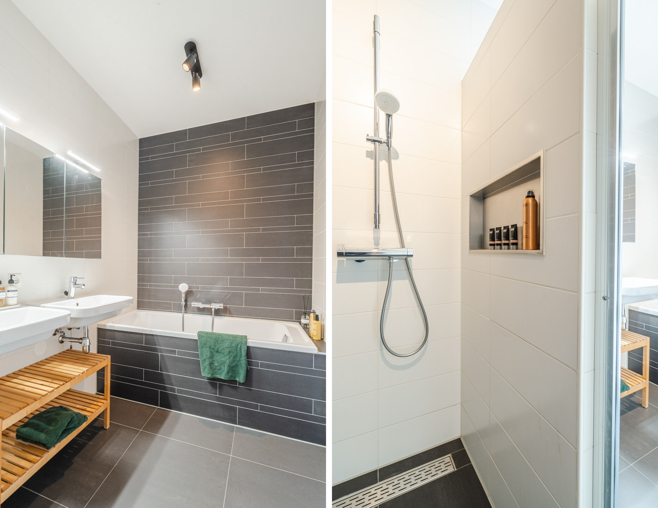 De luxe badkamer (ca. 5 m²) is volledig uitgerust, hij is voorzien van een ligbad (Villeroy & Boch), dubbele wastafel (Villeroy & Boch) met spiegelkast, elektrische handdoekradiator en een inloopdouche met handige nis voor verzorgingsproducten. De afwerking met witte wandtegels en antracietkleurige vloertegels zorgt voor een tijdloze en frisse uitstraling, die past bij elk interieur.