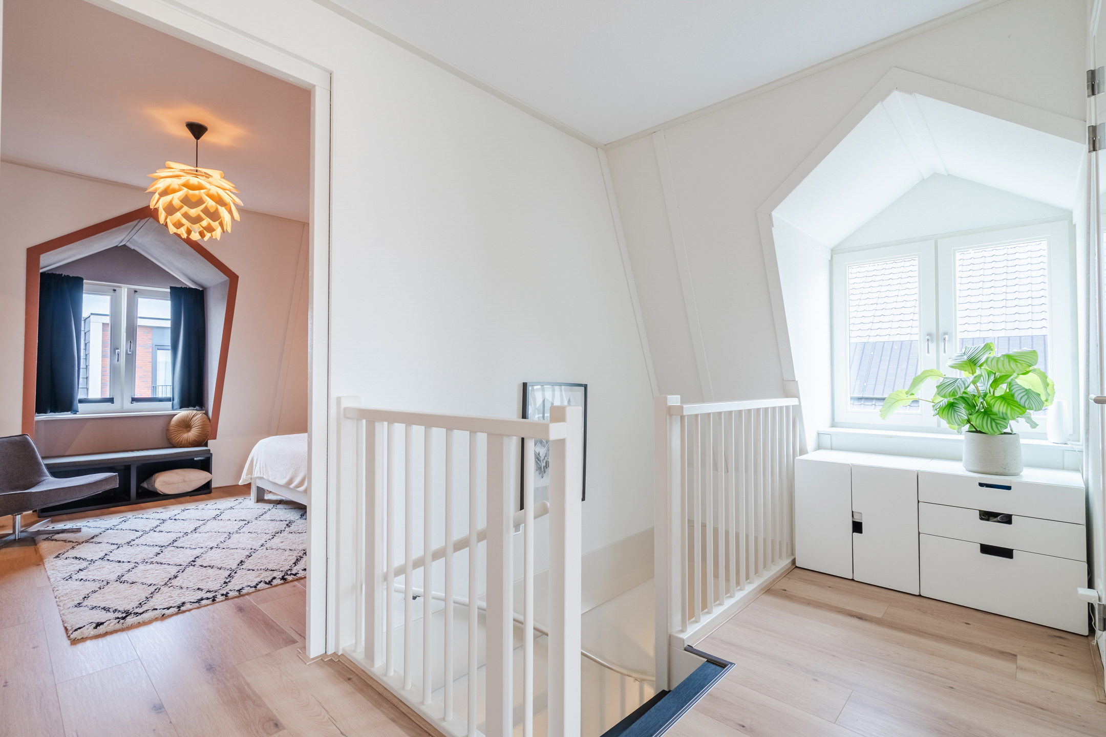 De tweede verdieping verwelkomt je met een lichte en royale overloop, voorzien van een charmante dakkapel die zorgt voor extra ruimte en daglicht. Aan de voorzijde bevindt zich een ruime slaapkamer, eveneens met een sfeervolle dakkapel. Aan de achterzijde zijn nog twee kamers.