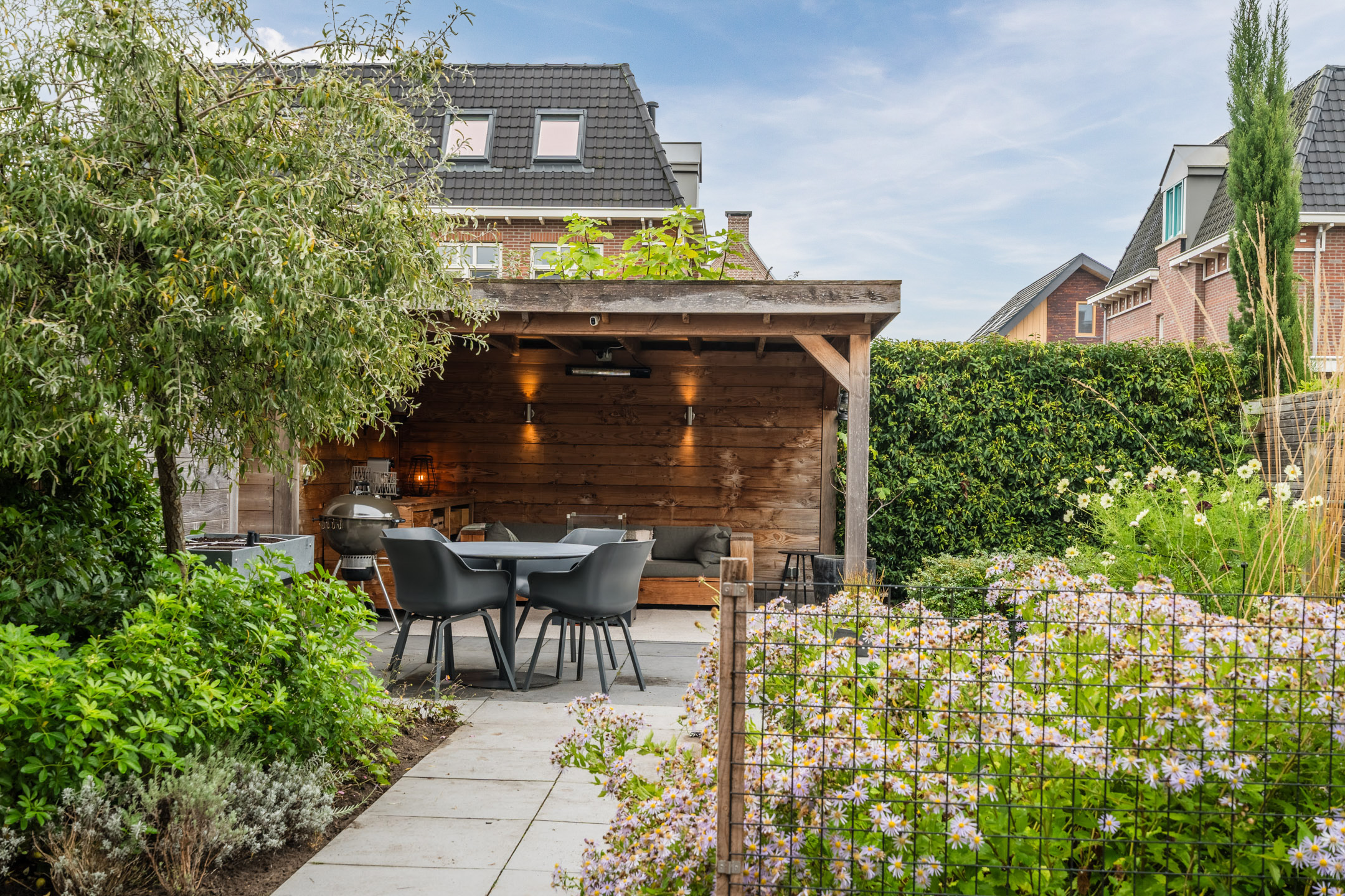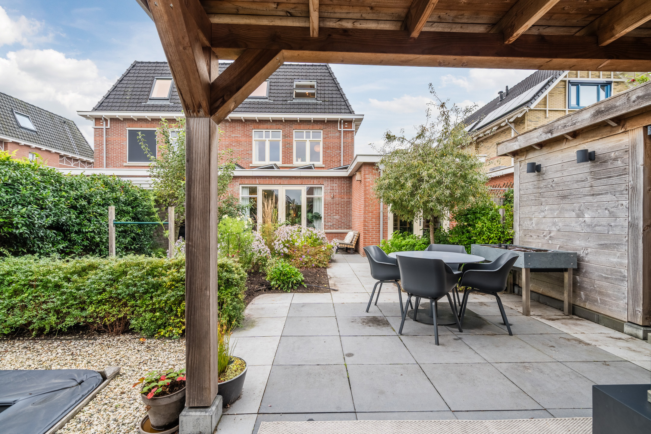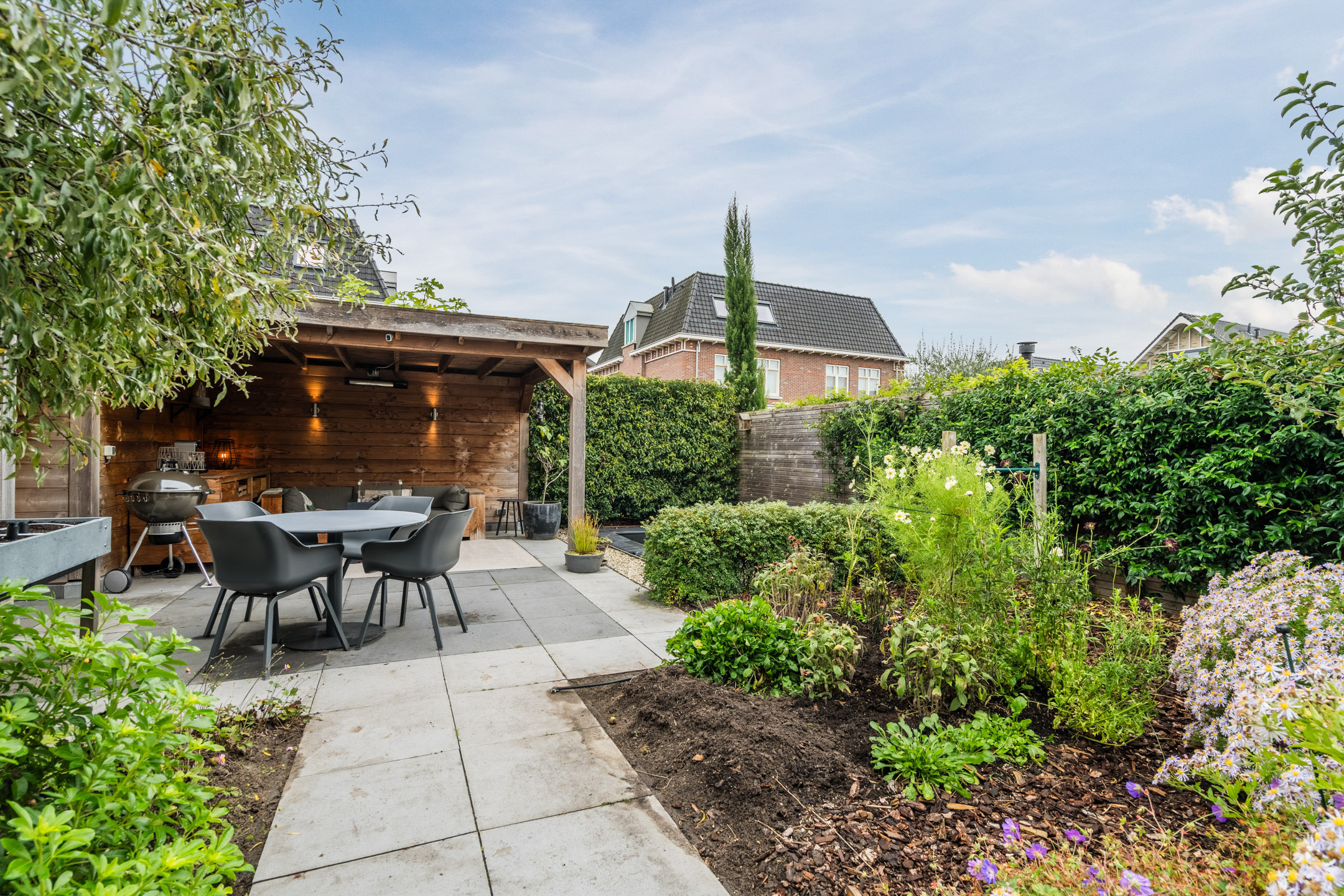 De absolute eyecatcher is de sfeervolle, professioneel op maat gemaakte overkapping; een heerlijke plek om op een zomeravond de dag af te sluiten. Dankzij de aanwezigheid van elektra en verlichting kun je hier het hele jaar door comfortabel genieten; van een ontspannen kop koffie in het voorjaar tot een gezellig borrelmoment op een herfstachtige avond. Grenzend aan de overkapping bevindt zich het praktische tuinhuis, ideaal voor het opbergen van tuingereedschap, speelgoed en het stallen van fietsen.