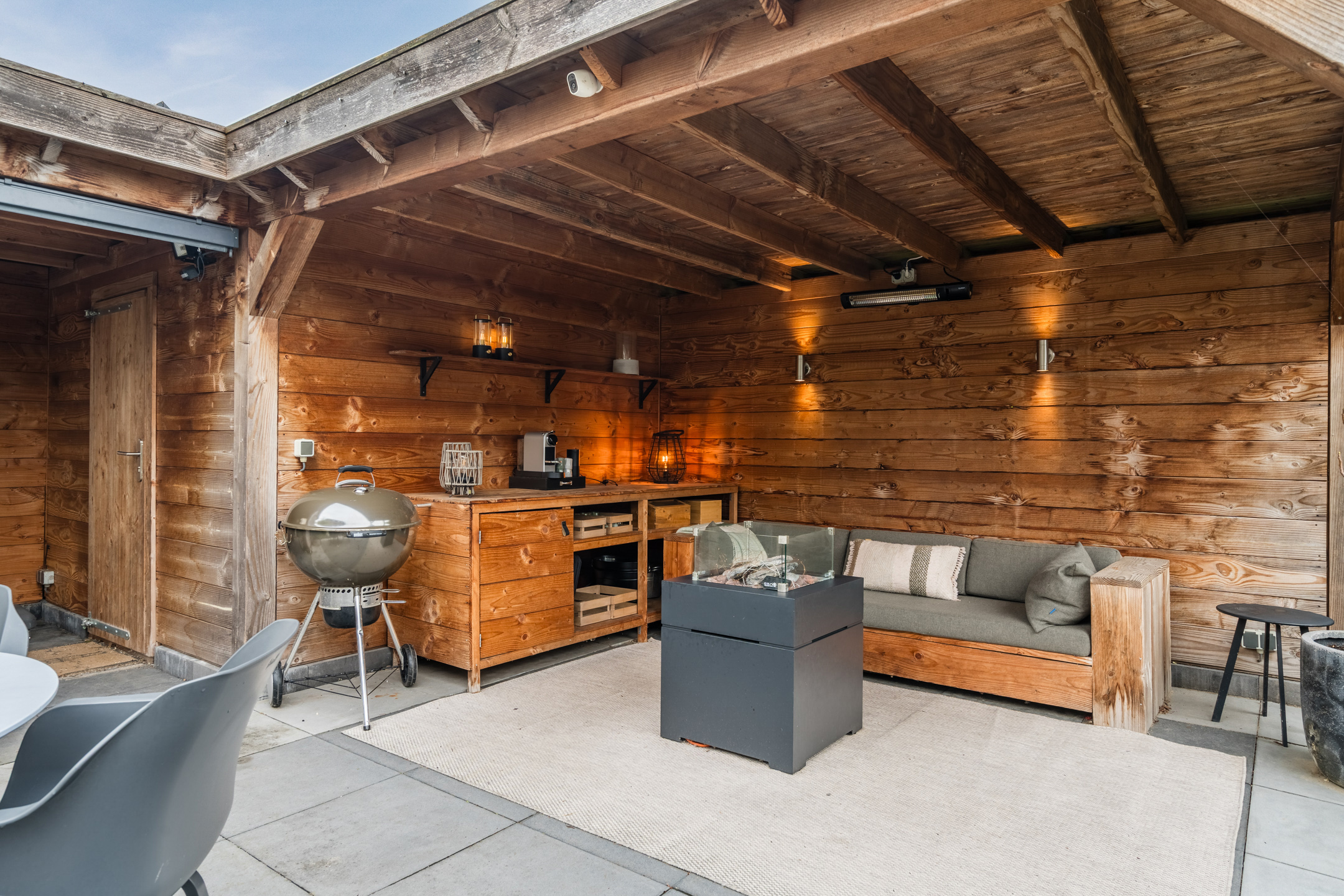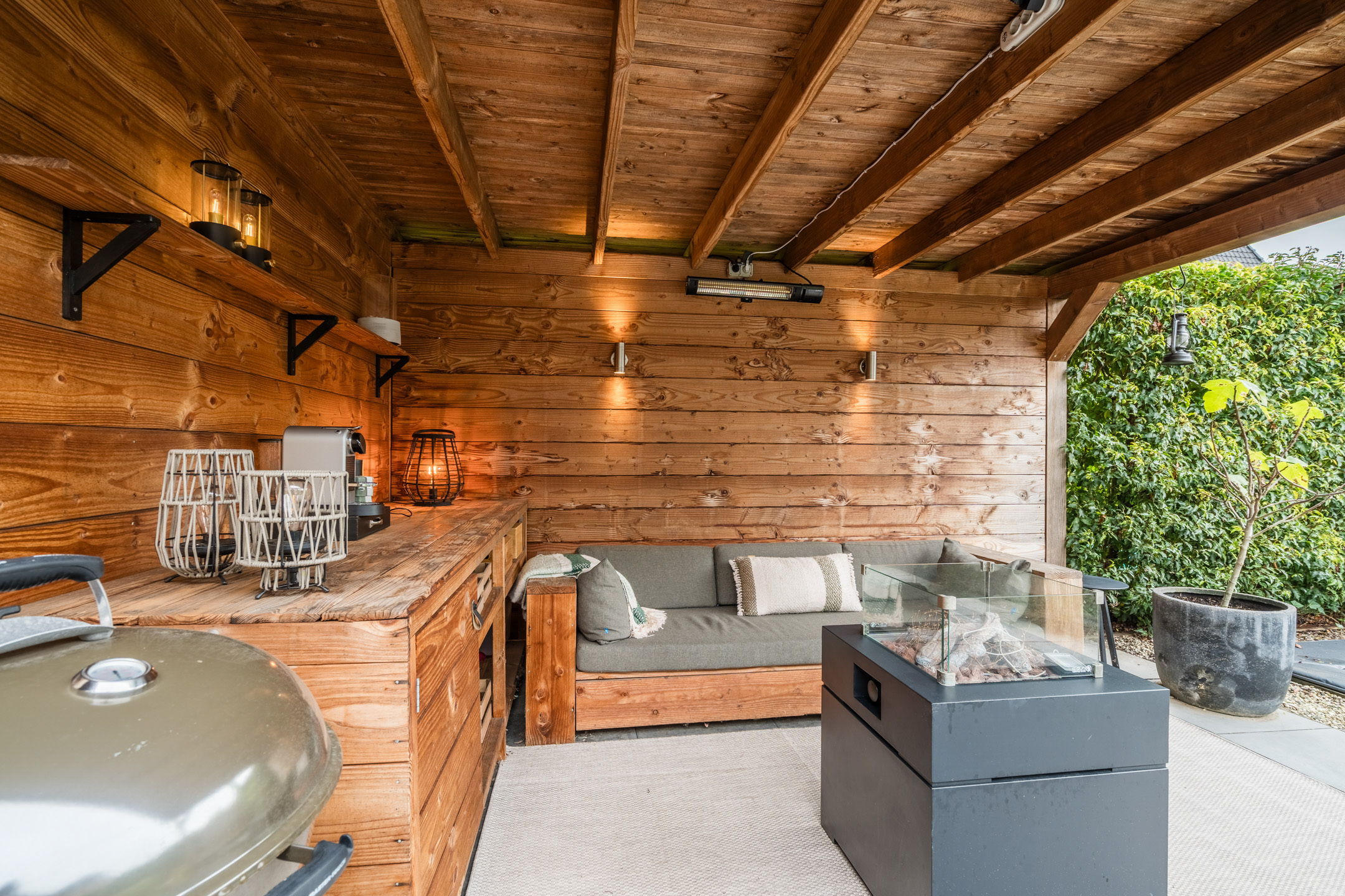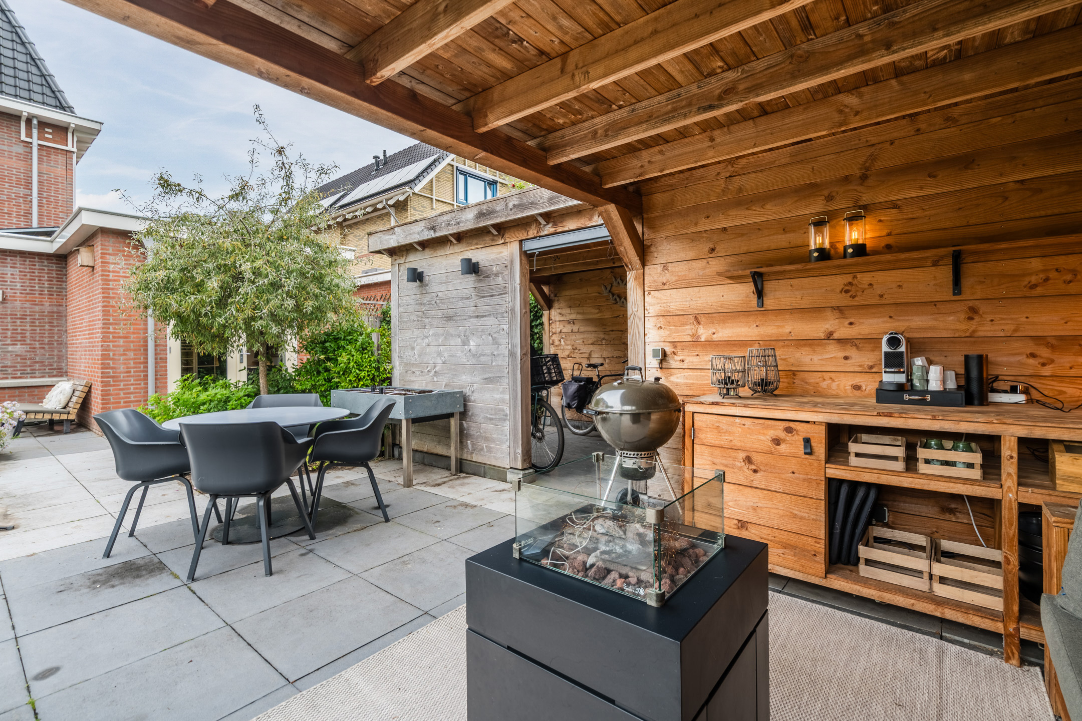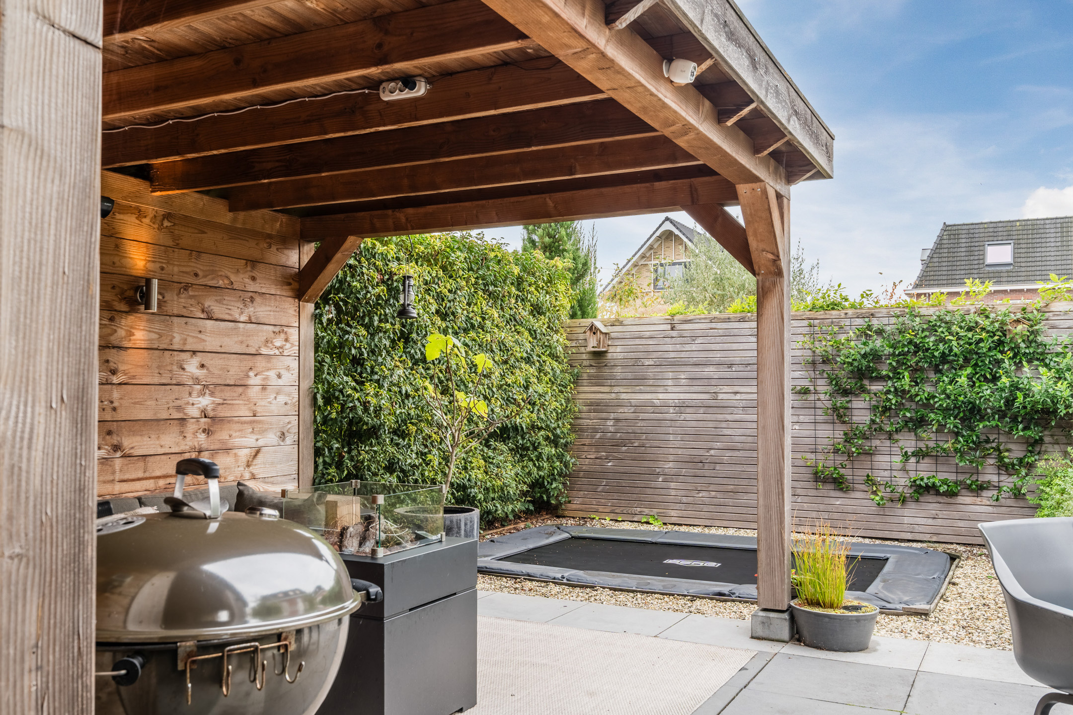 De absolute eyecatcher is de sfeervolle, professioneel op maat gemaakte overkapping; een heerlijke plek om op een zomeravond de dag af te sluiten. Dankzij de aanwezigheid van elektra en verlichting kun je hier het hele jaar door comfortabel genieten; van een ontspannen kop koffie in het voorjaar tot een gezellig borrelmoment op een herfstachtige avond. Grenzend aan de overkapping bevindt zich het praktische tuinhuis, ideaal voor het opbergen van tuingereedschap, speelgoed en het stallen van fietsen.