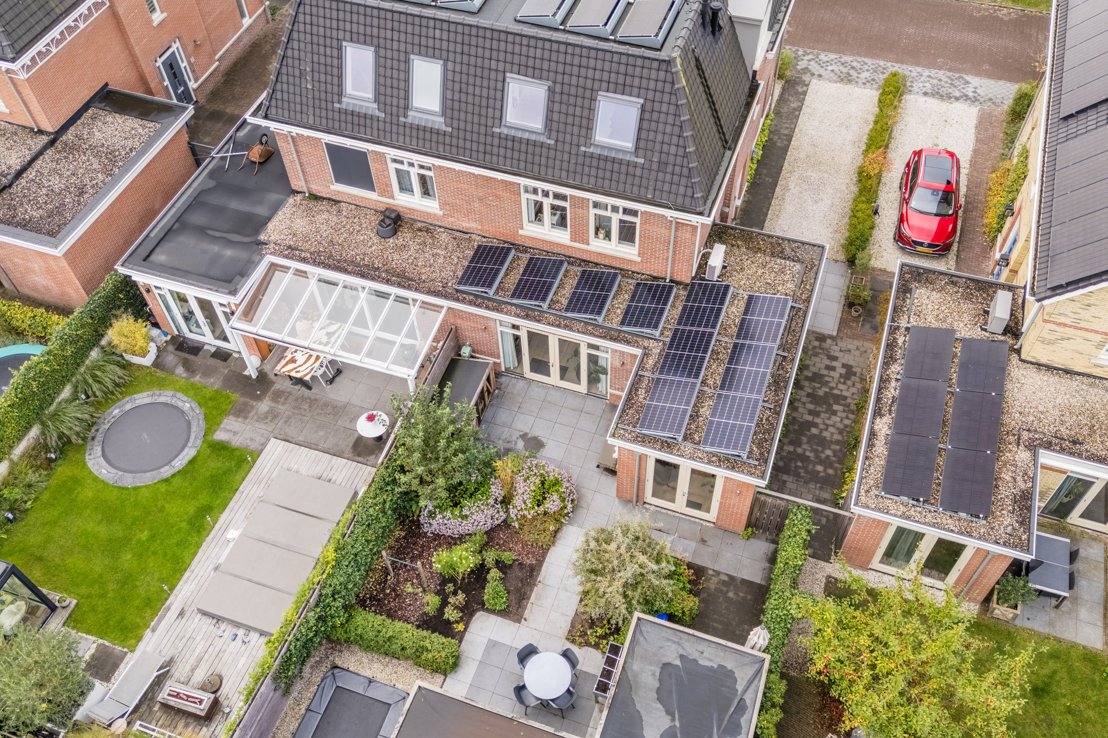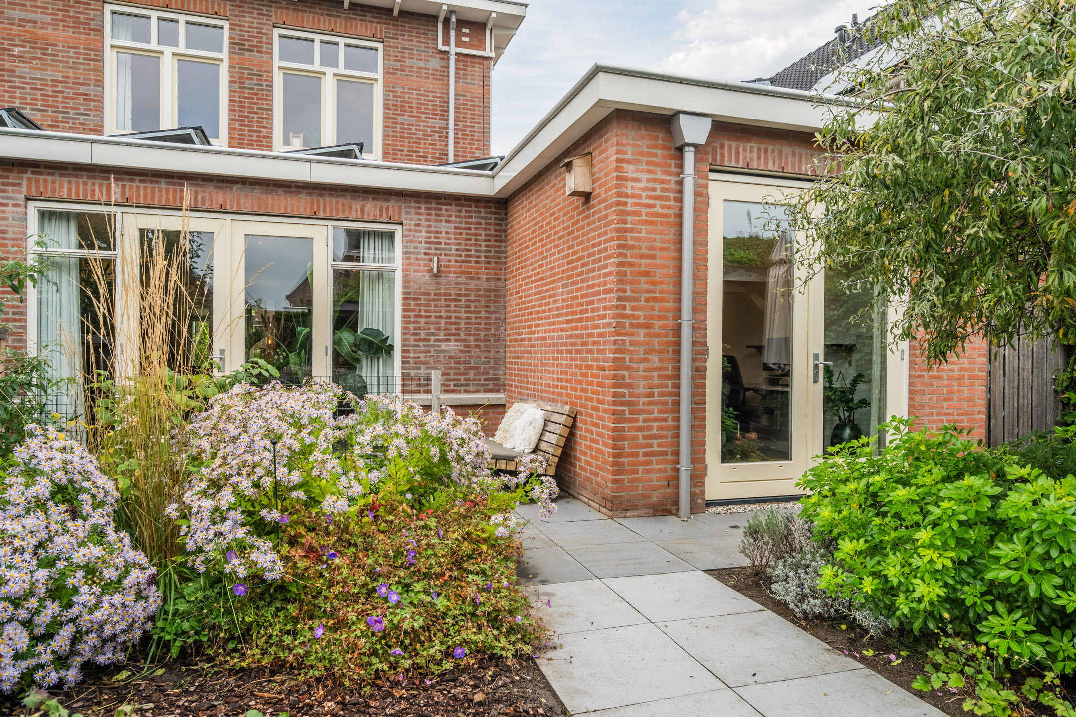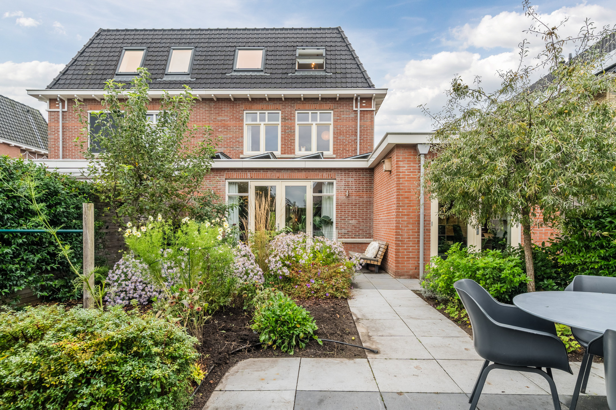 De achtertuin is smaakvol aangelegd met veel groen, een ruim terras, weelderige bloemenborders, (sier)fruitbomen en een trampoline, wat het maakt tot een complete tuin, waar het hele gezin kan genieten van het buitenleven.
