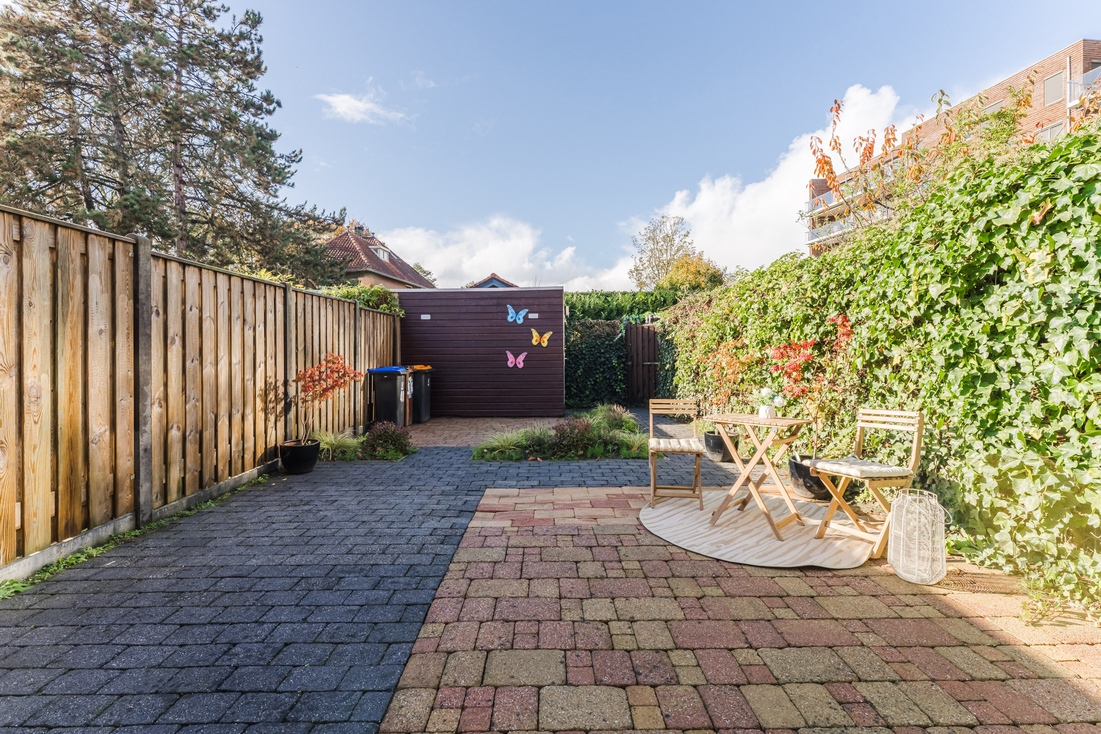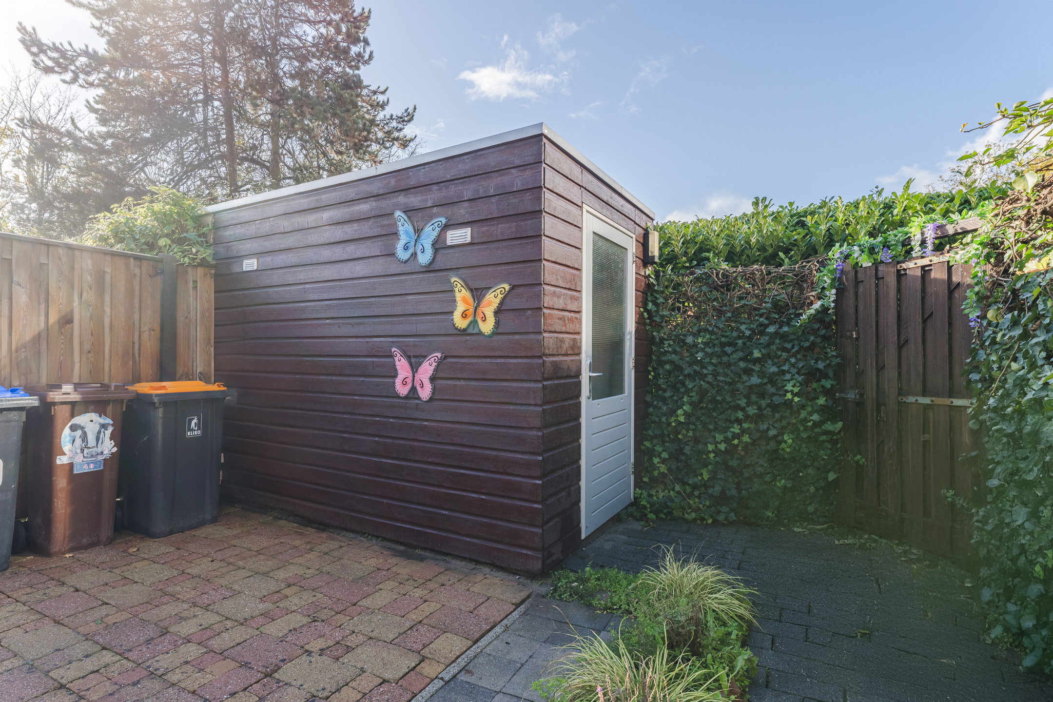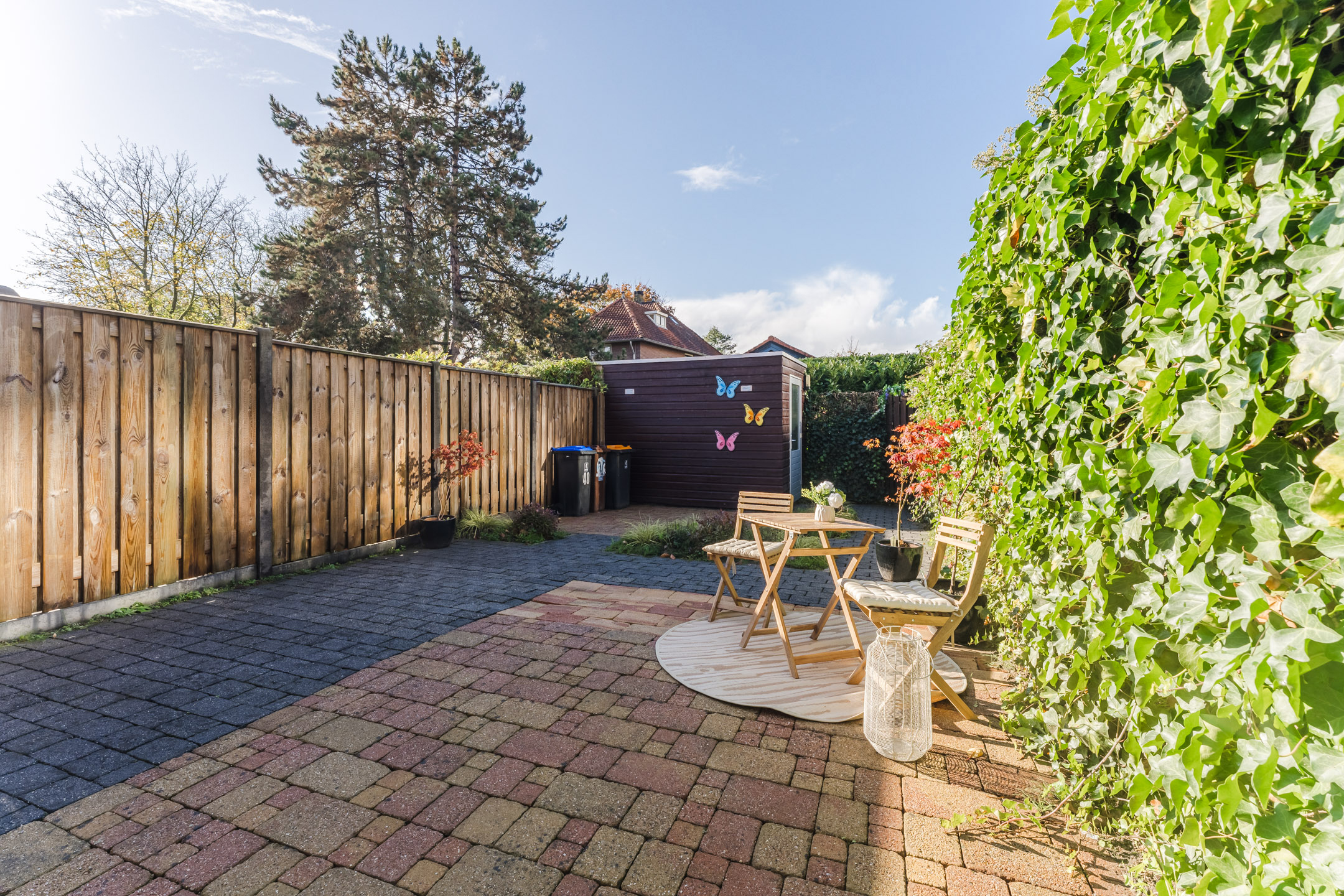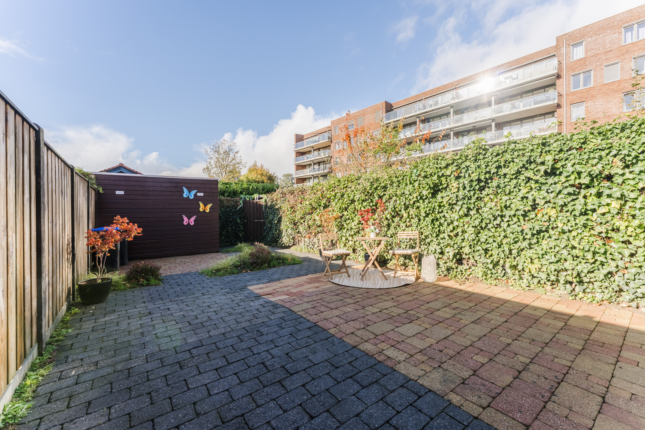 De verzorgde inrichting zorgt ervoor dat je weinig omkijken hebt naar het onderhoud, terwijl je toch kunt genieten van een groene, sfeervolle buitenruimte. Achterin de tuin staat een praktische, vrijstaande houten berging, perfect voor het stallen van fietsen, tuingereedschap of seizoensspullen.