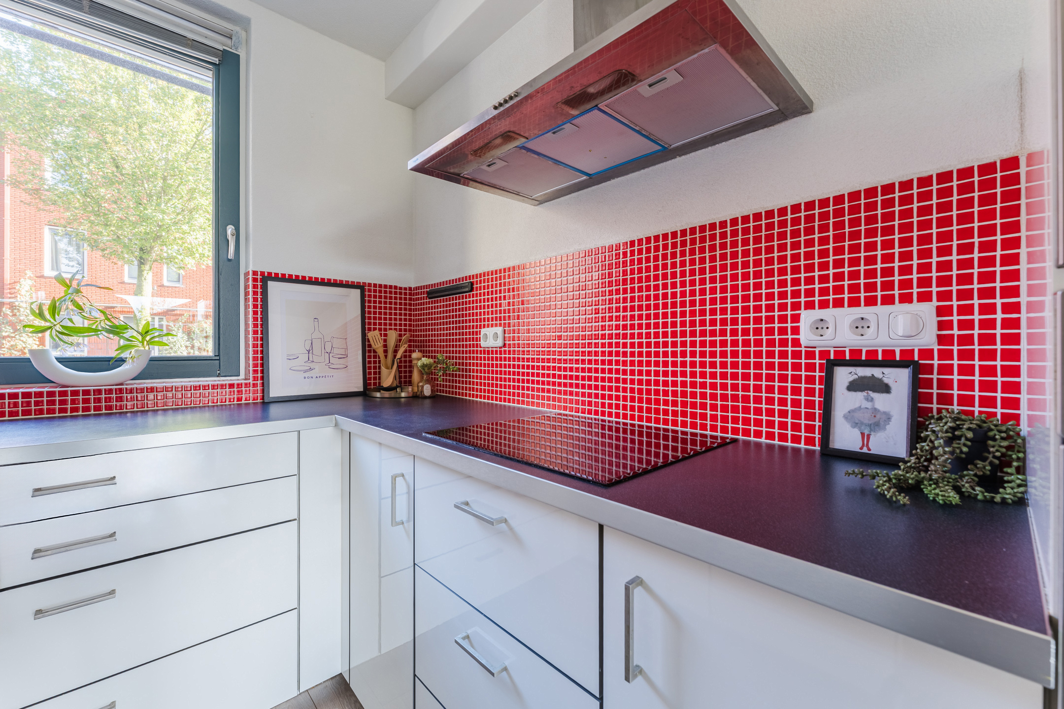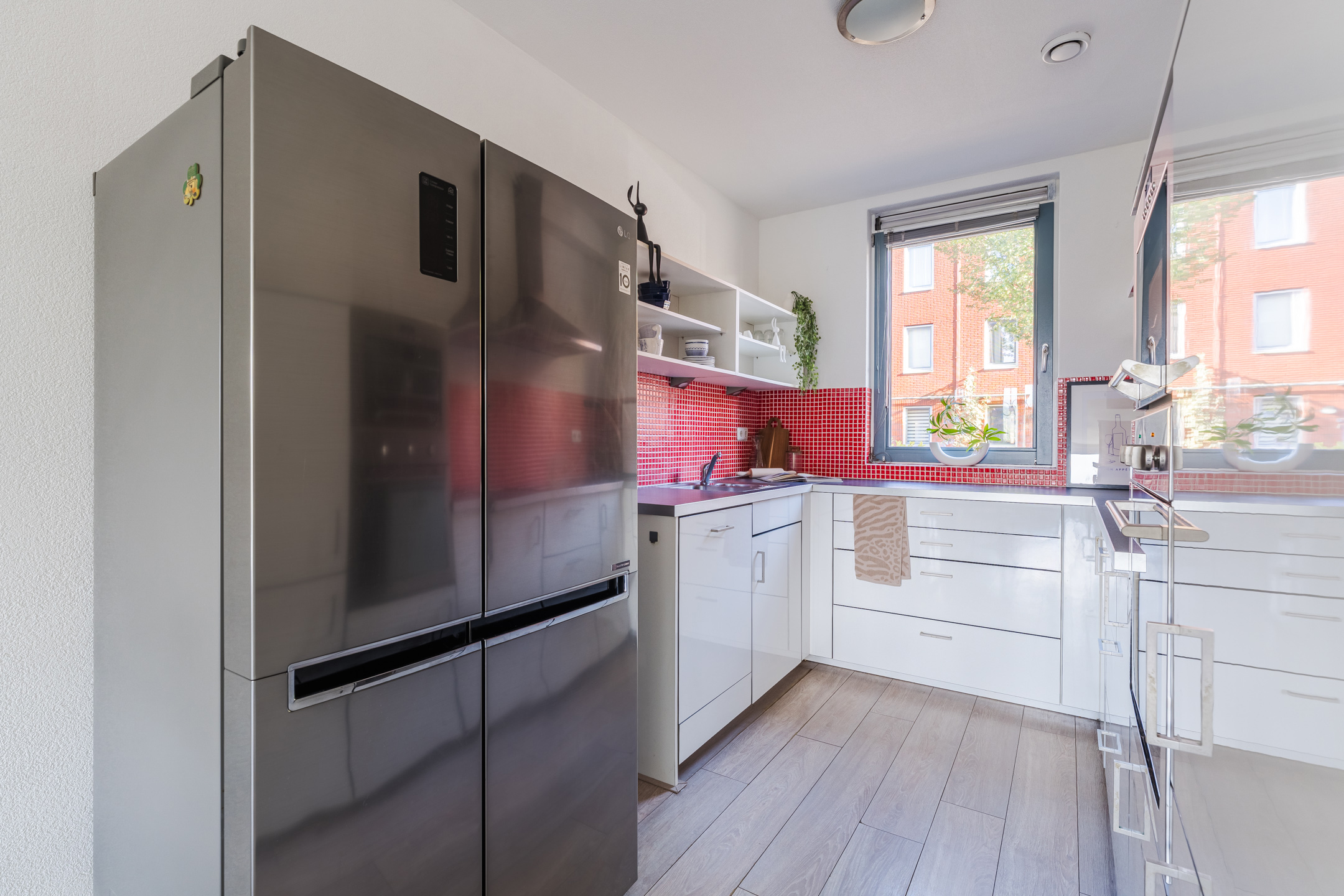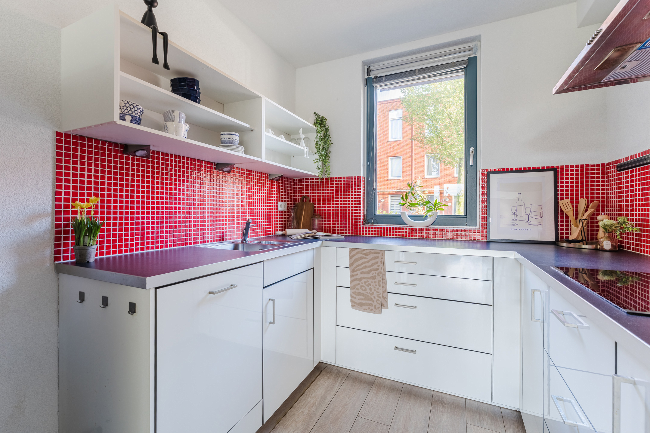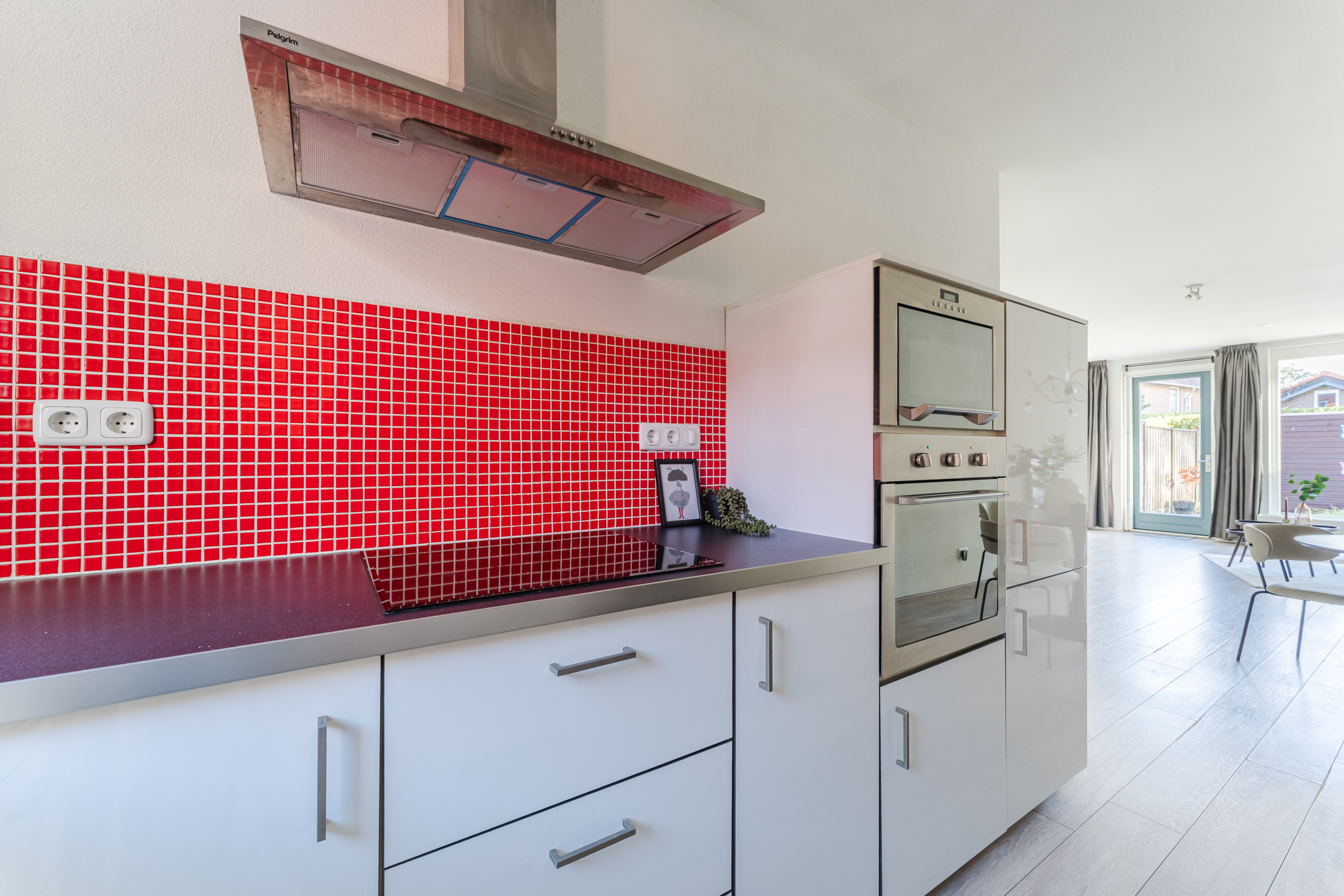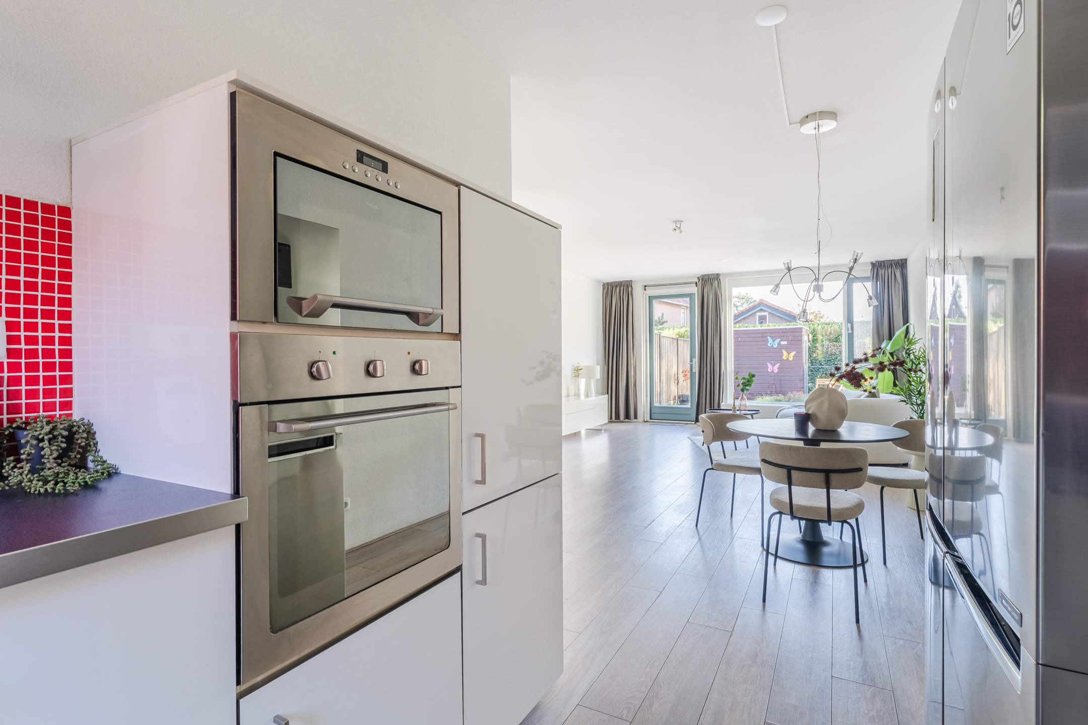 Aan de voorzijde van de woning bevindt zich de nette en complete keuken, geplaatst in een U-opstelling. De moderne keuken is uitgevoerd in een lichte kleurstelling en van alle gemakken voorzien, zoals: een vaatwasser, een inductiekookplaat, een combi-oven/magnetron, een koel-/ vriescombinatie en een rvs-afzuigkap. Vanuit de keuken is er uitzicht op de voortuin en de straat.