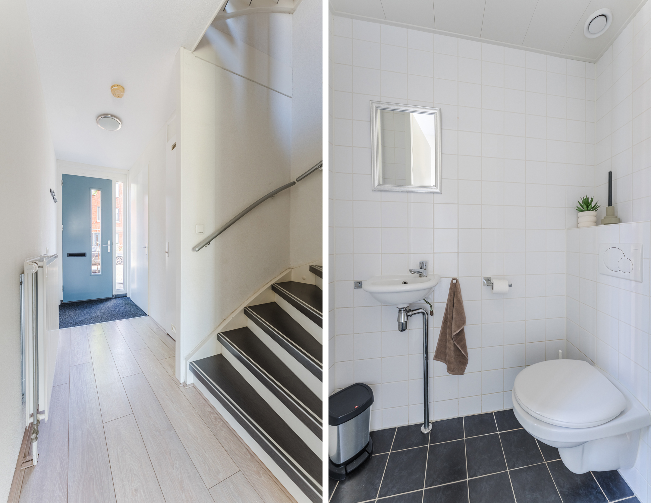 Entree, hal met garderobe, meterkast en toiletruimte met hangend toilet en fontein. Vanuit de hal is er toegang tot de woonkamer en halfopen keuken.