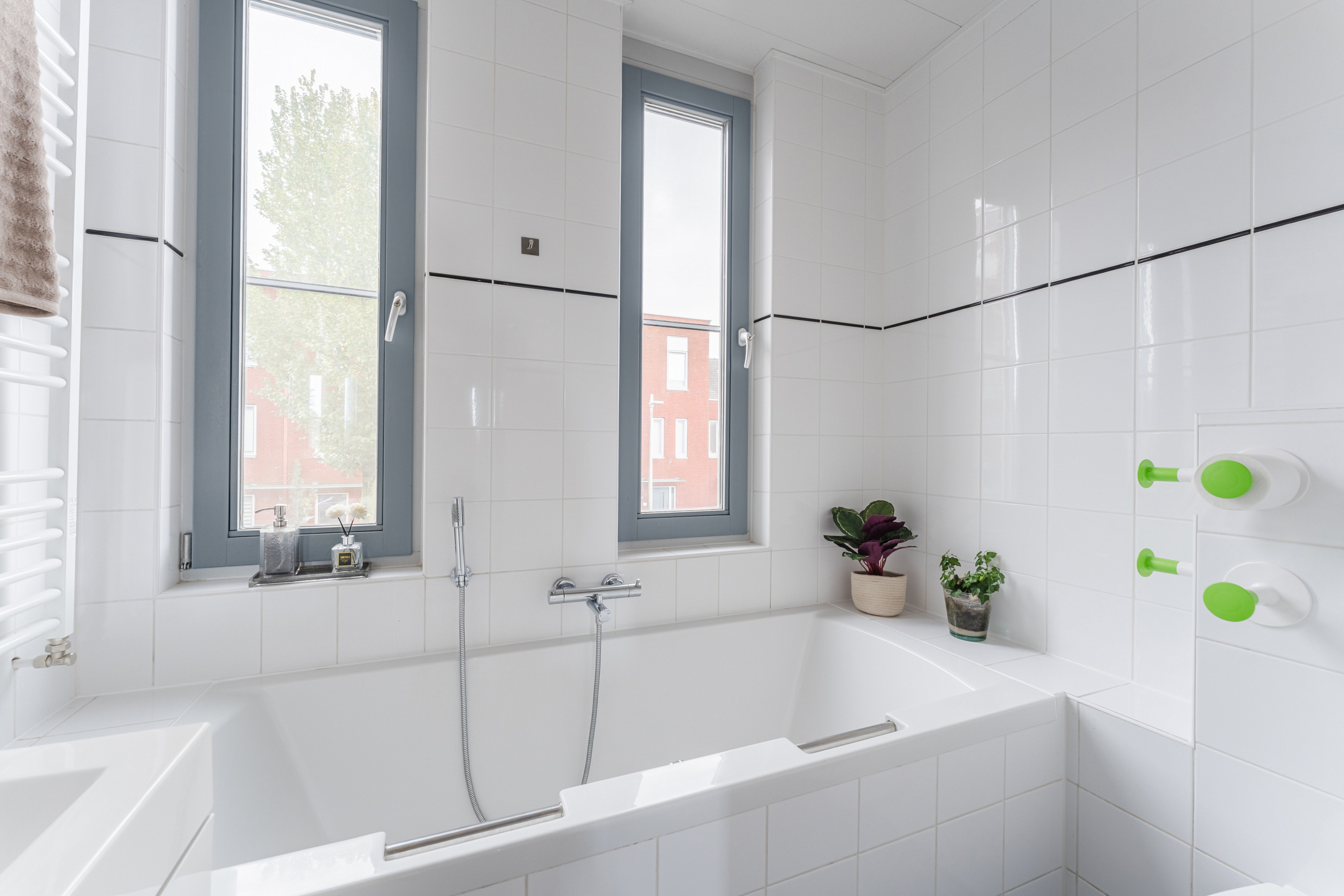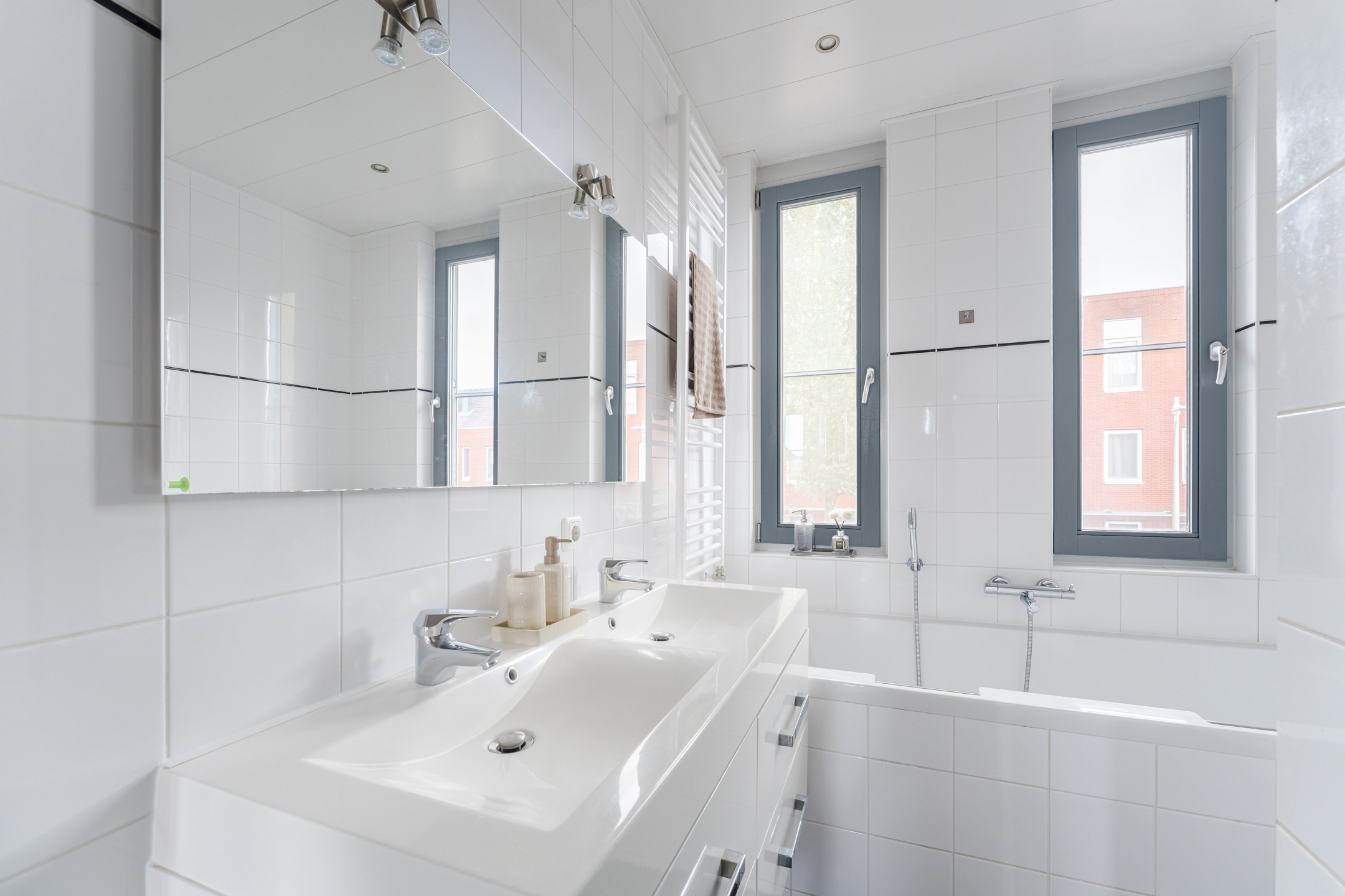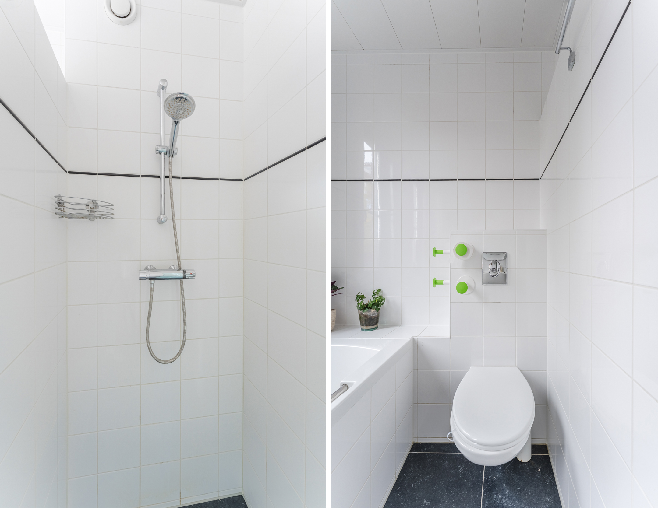 De badkamer op deze verdieping is compleet uitgevoerd en vormt een stijlvolle, moderne ruimte. De ruimte beschikt over een ligbad met douchevoorziening, een inloopdouche, een wastafelmeubel met opbergruimte, een hangend toilet en een designradiator. De zwart-/witte kleurstelling geeft de badkamer een eigentijdse, luxe uitstraling. Bovendien zorgen de twee ramen voor volop daglicht en natuurlijke ventilatie, een fijne combinatie van comfort en frisheid.