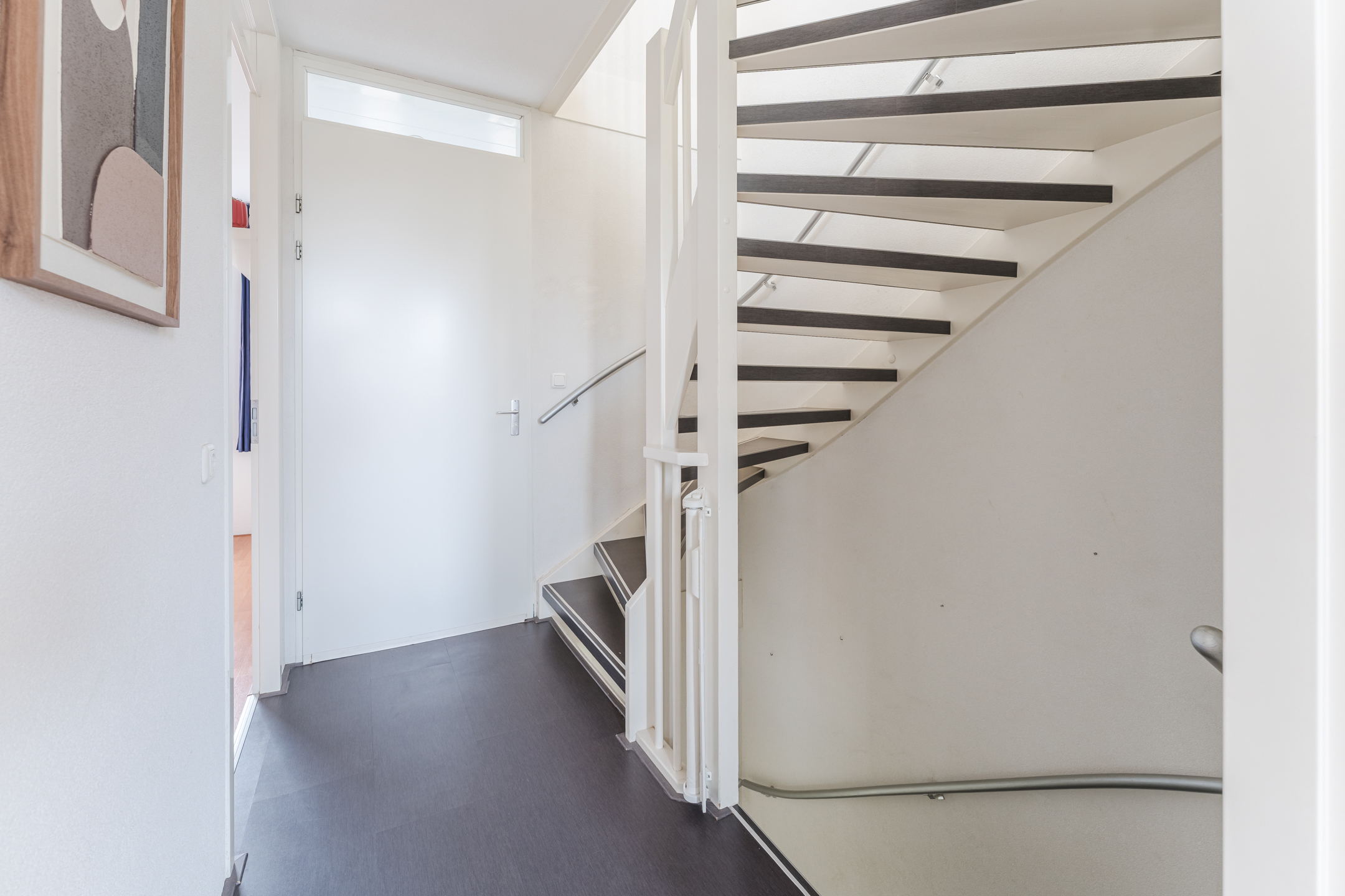 De trappen in de woning zijn verzorgd afgewerkt met een donkere bekleding, wat zorgt voor een chique en rustige uitstraling, die mooi aansluit bij de rest van het interieur.