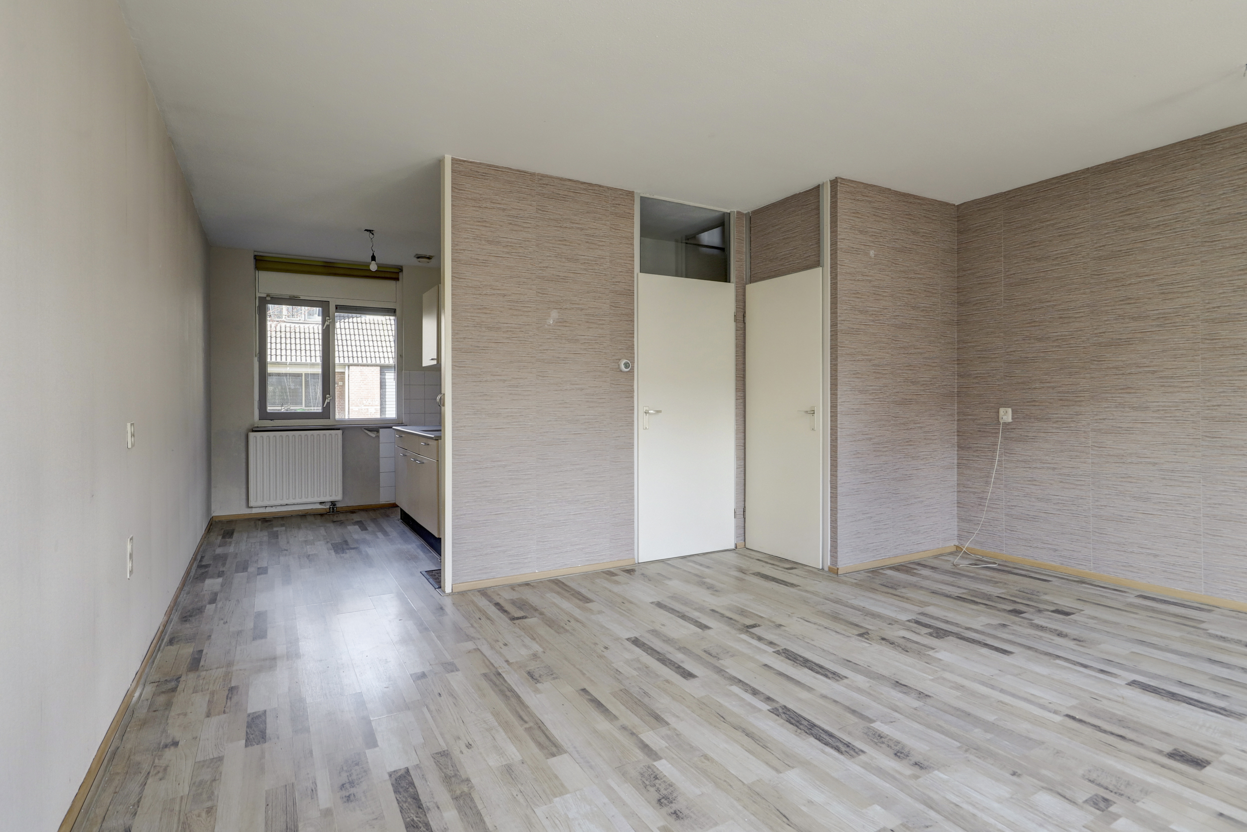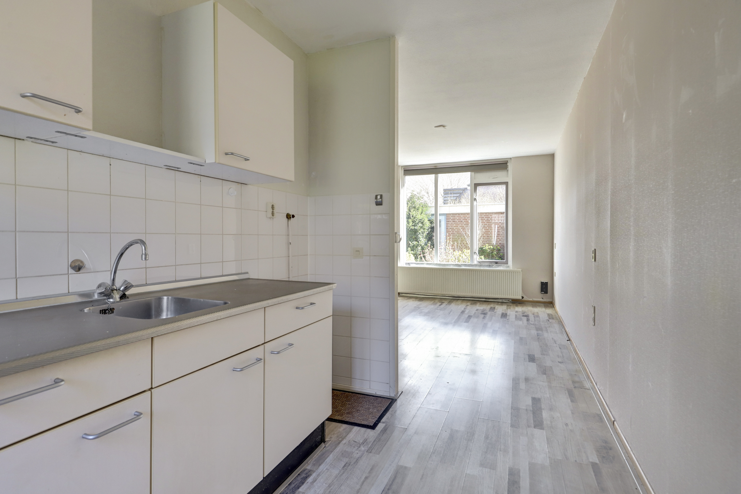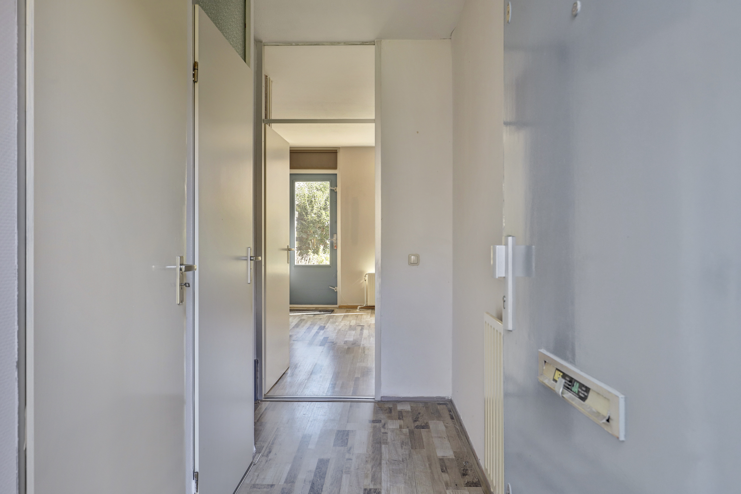 Vanuit de hal is het toilet, de trapopgang, de meterkast en de woonkamer te bereiken. De woonkamer bevindt zich aan de achterzijde van de woonlaag en biedt fraai uitzicht op de achtertuin. De keuken is aan de voorzijde gesitueerd en biedt zicht op het plantsoen. De keuken is eenvoudig qua uitvoering.