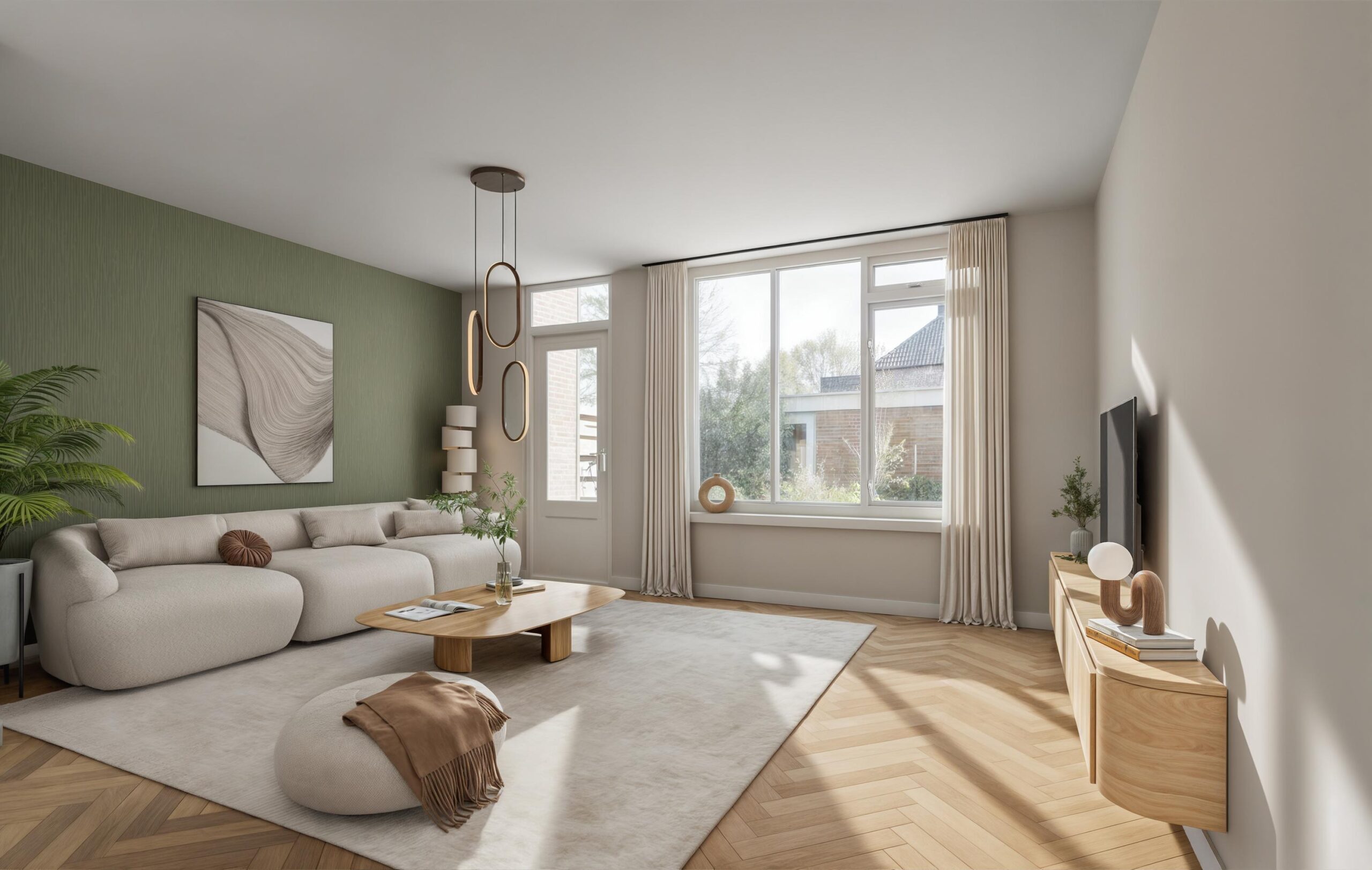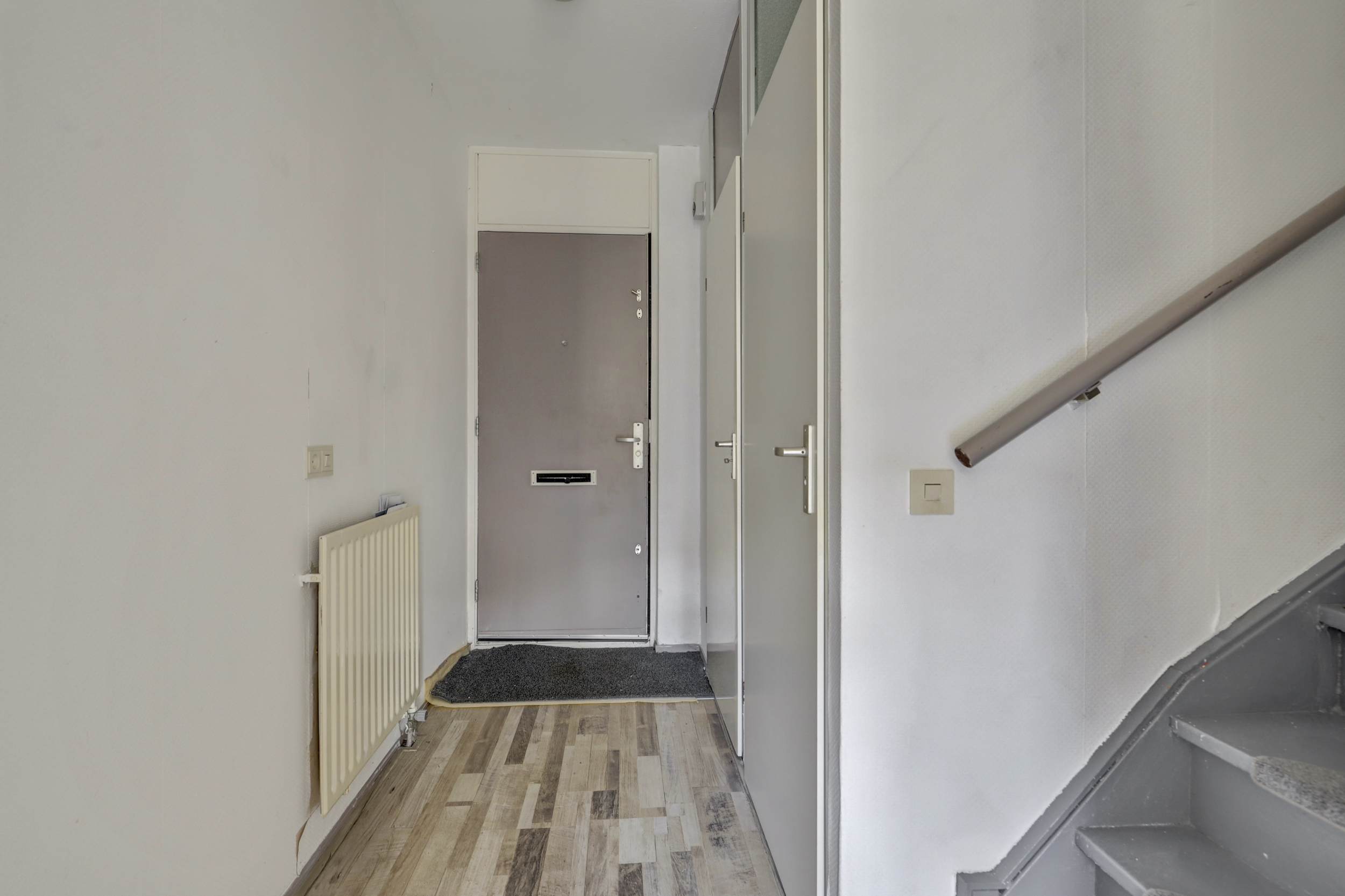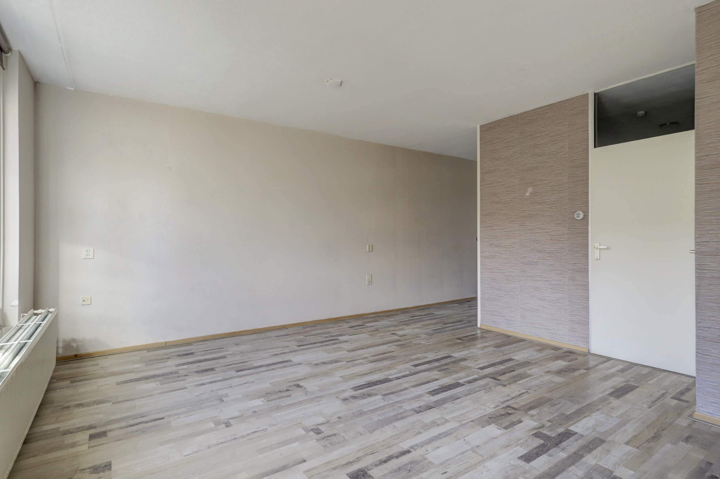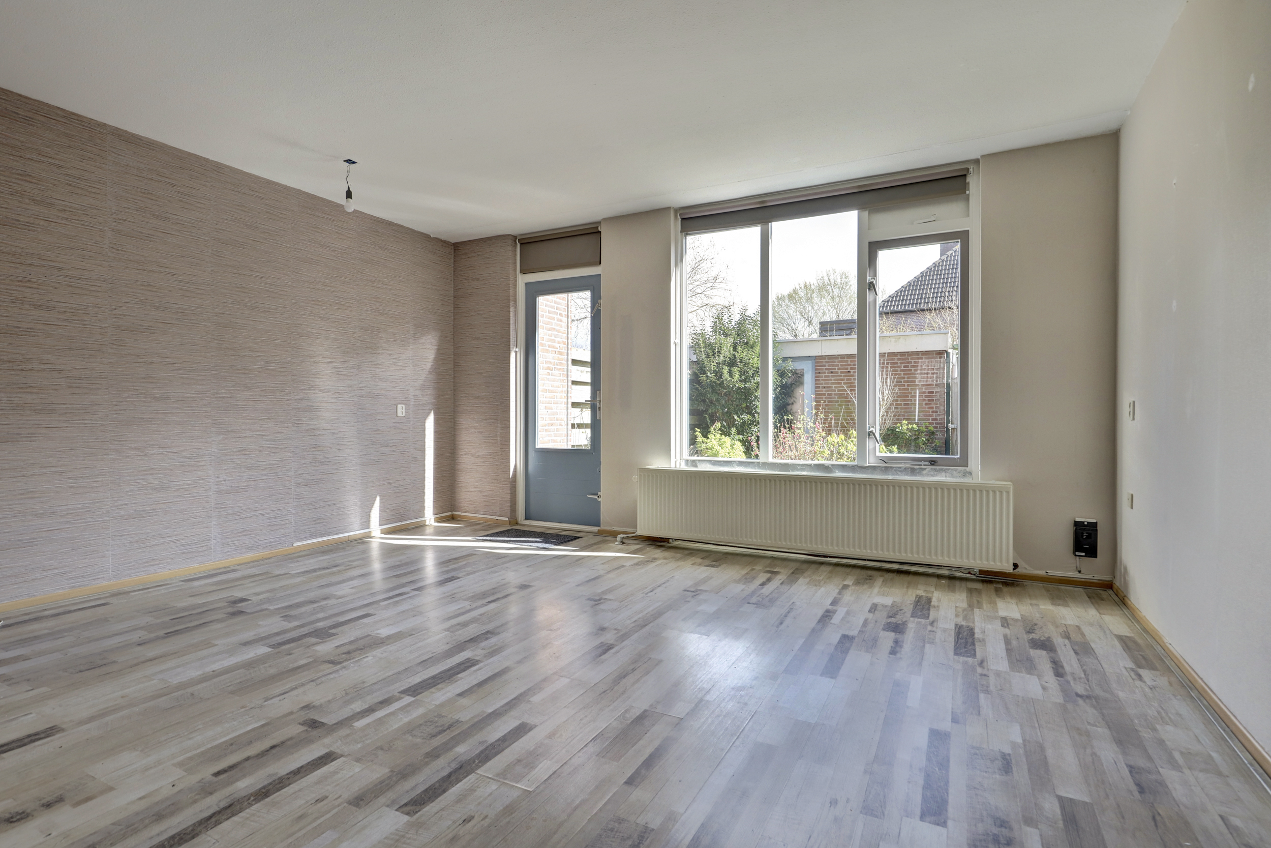Vanuit de hal is het toilet, de trapopgang, de meterkast en de woonkamer te bereiken. De woonkamer bevindt zich aan de achterzijde van de woonlaag en biedt fraai uitzicht op de achtertuin. De keuken is aan de voorzijde gesitueerd en biedt zicht op het plantsoen. De keuken is eenvoudig qua uitvoering.