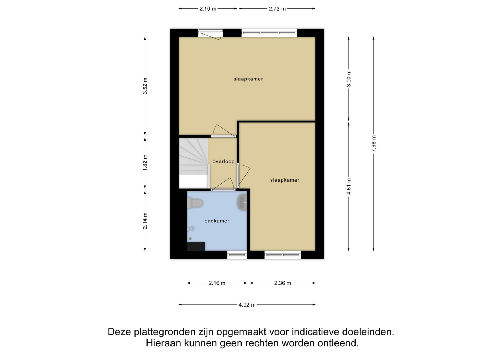 Vanaf de overloop zijn de twee slaapkamers en de badkamer te bereiken. De badkamer is zeer eenvoudig uitgevoerd en beschikt over een toilet, wastafel en douche. De slaapkamers zijn beide van ruim formaat (ca. 12 m2 en 17 m2).