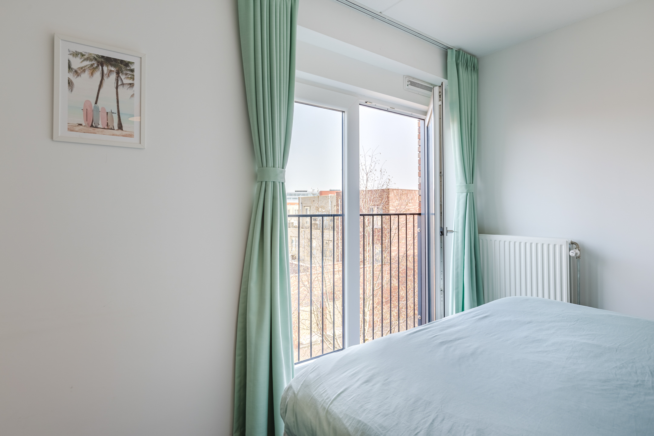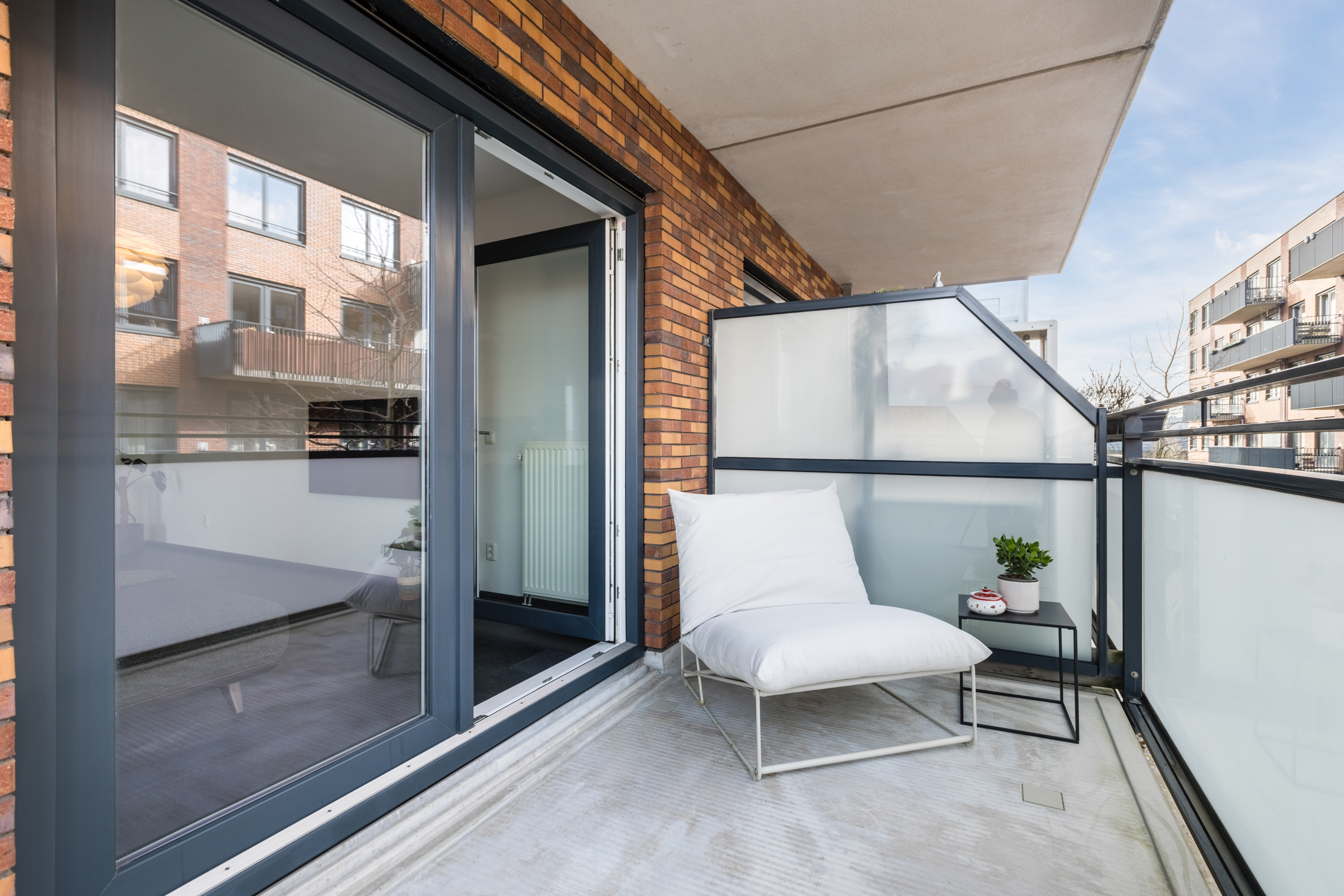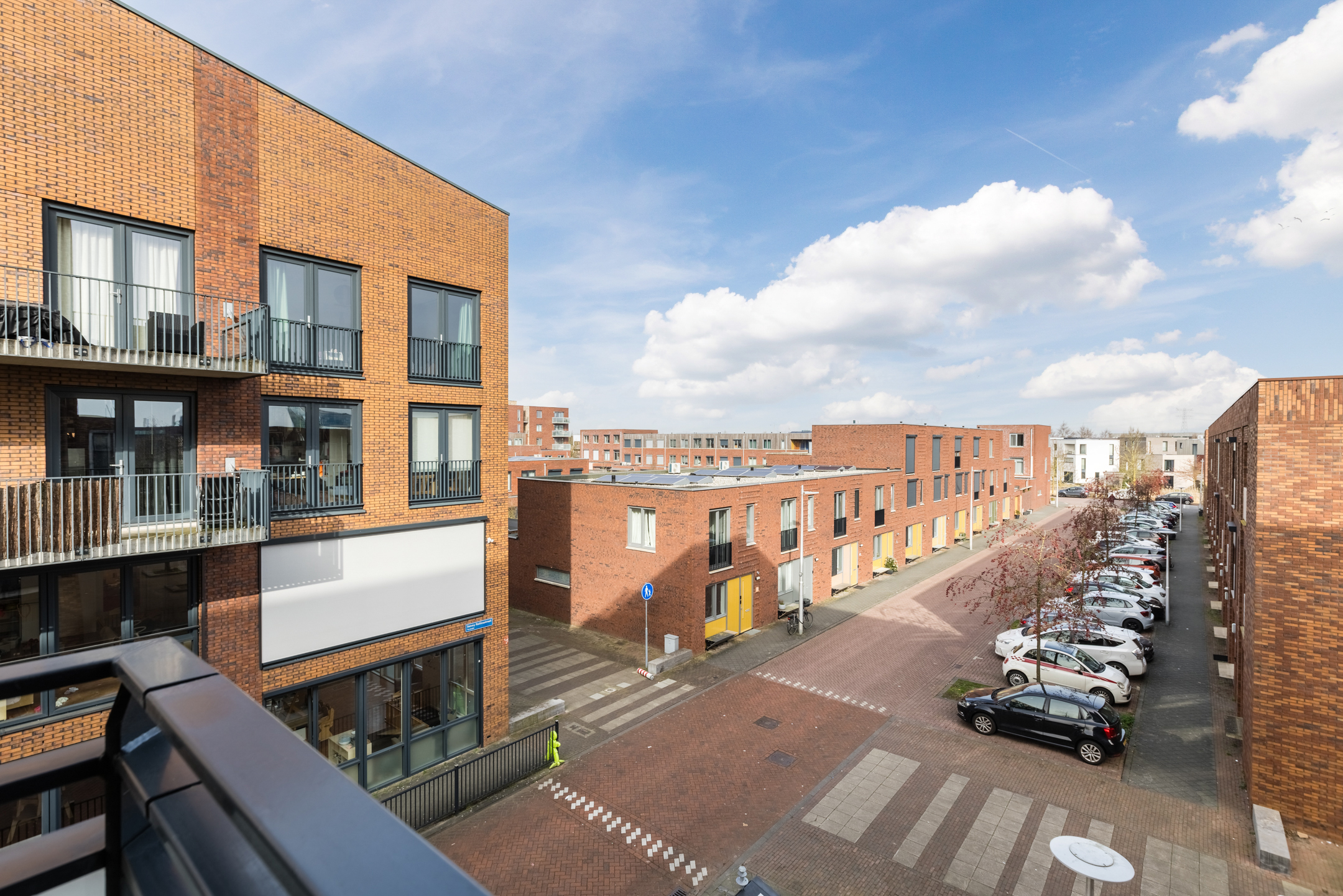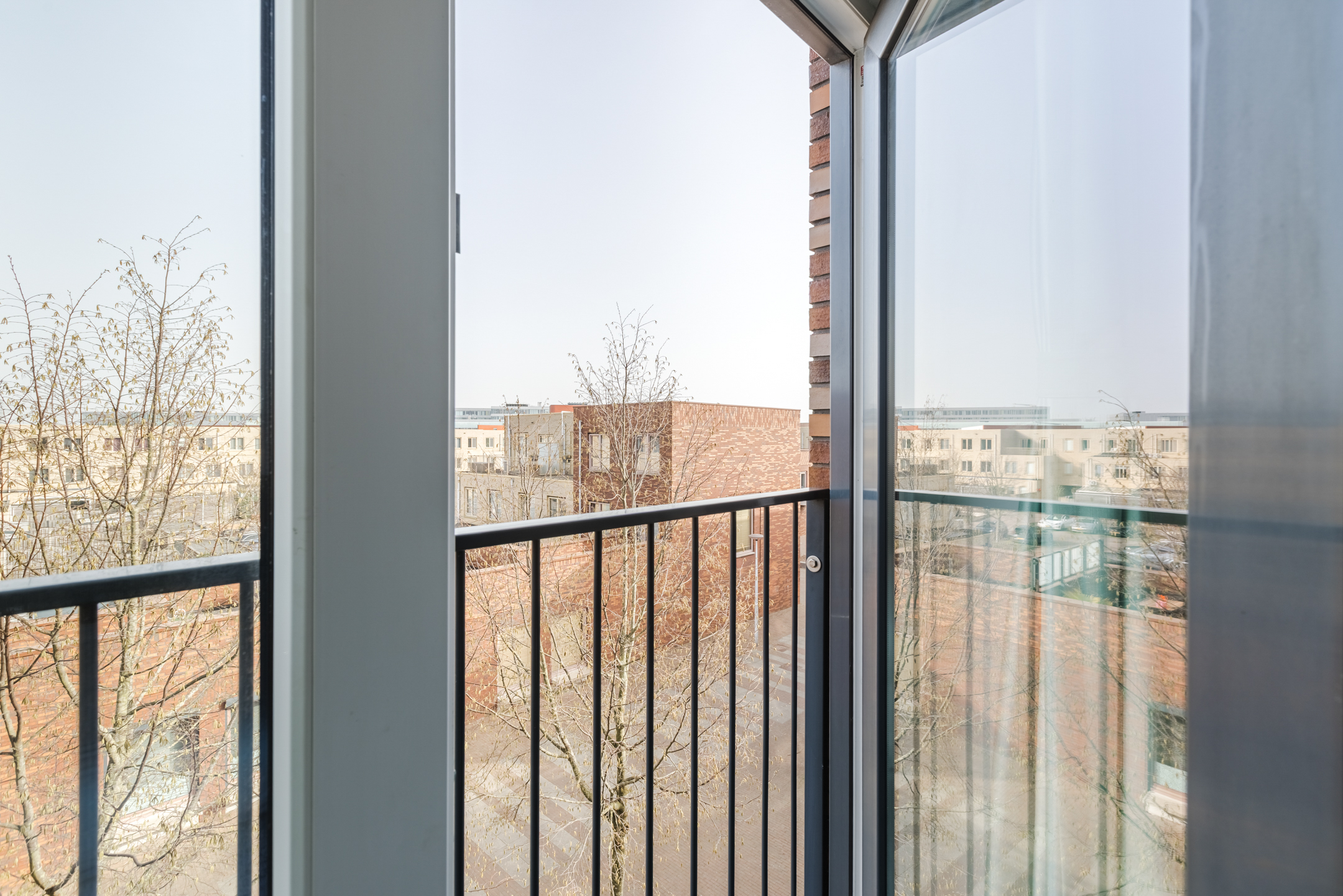 Vanuit de woonkamer is het balkon bereikbaar. Het balkon is gelegen op het westen en biedt dankzij de ligging aan de zijkant van het complex een prettig vrij uitzicht en een fijne plek om in de middag en avond van de zon te genieten.