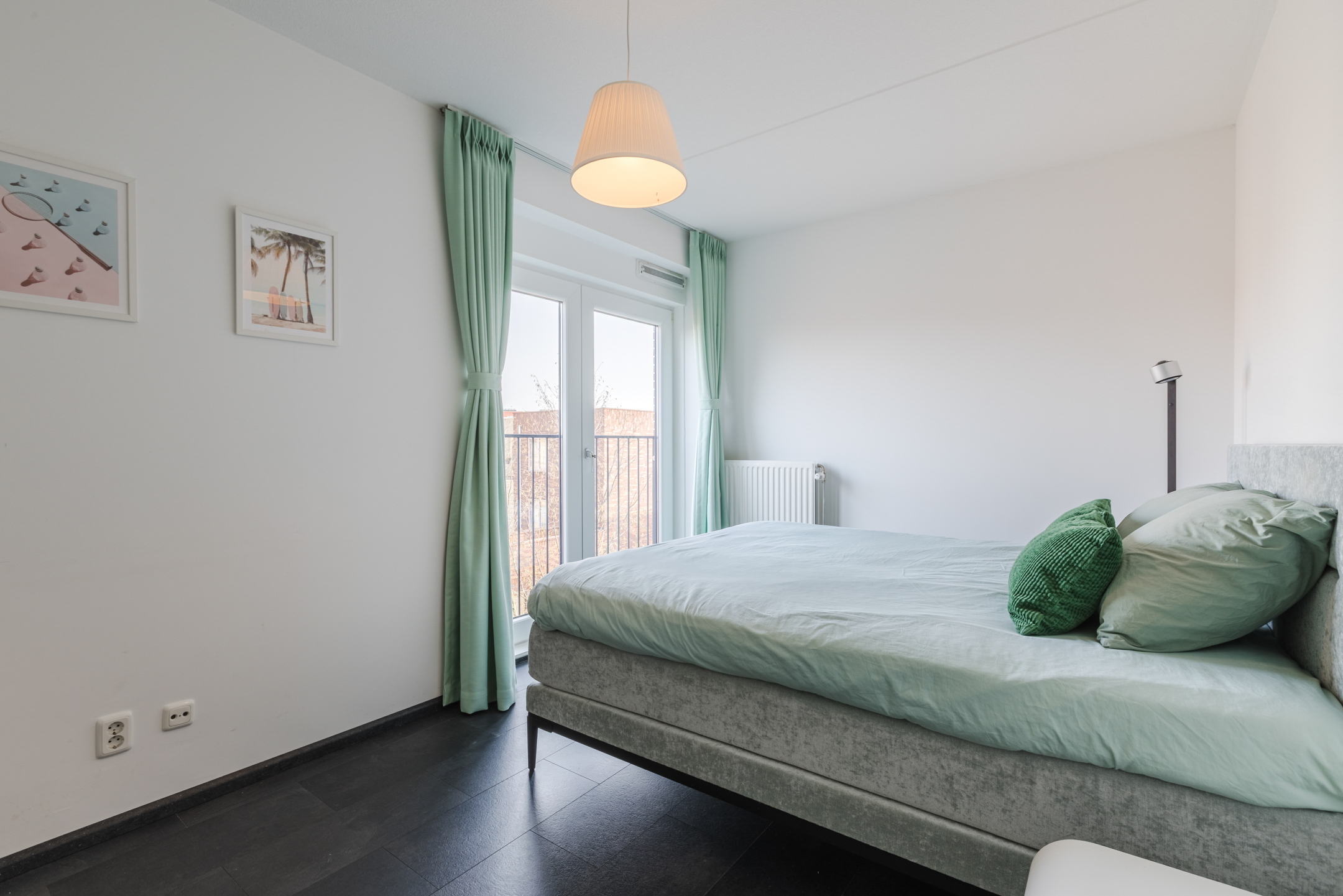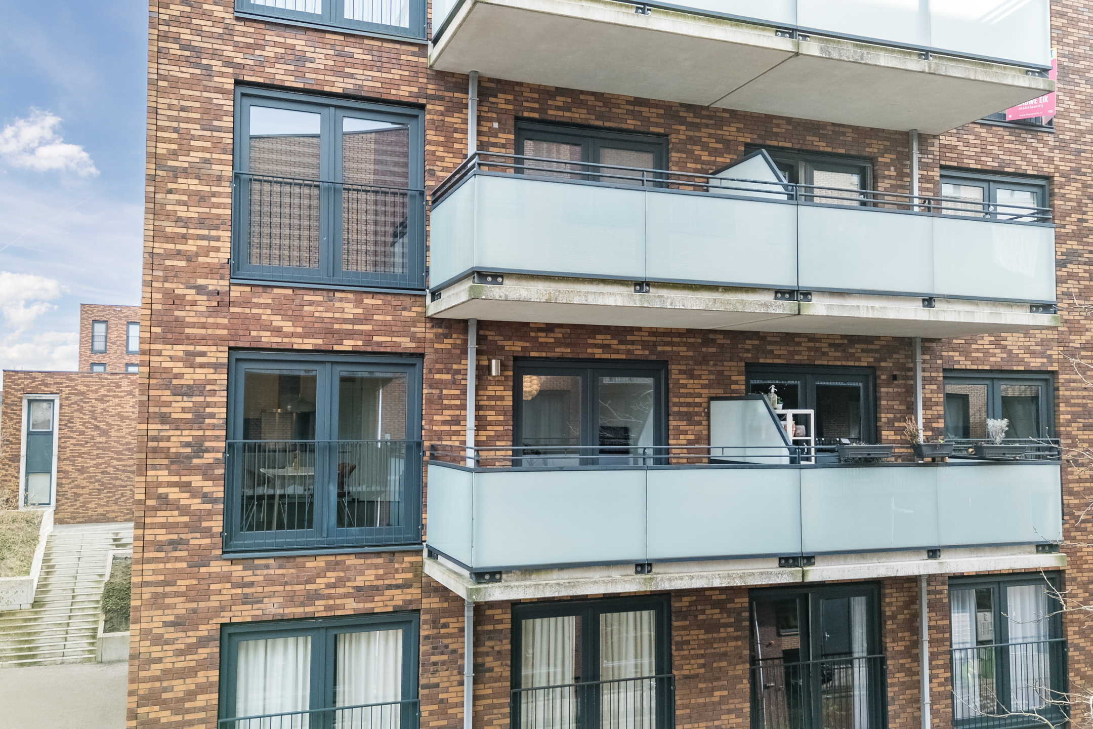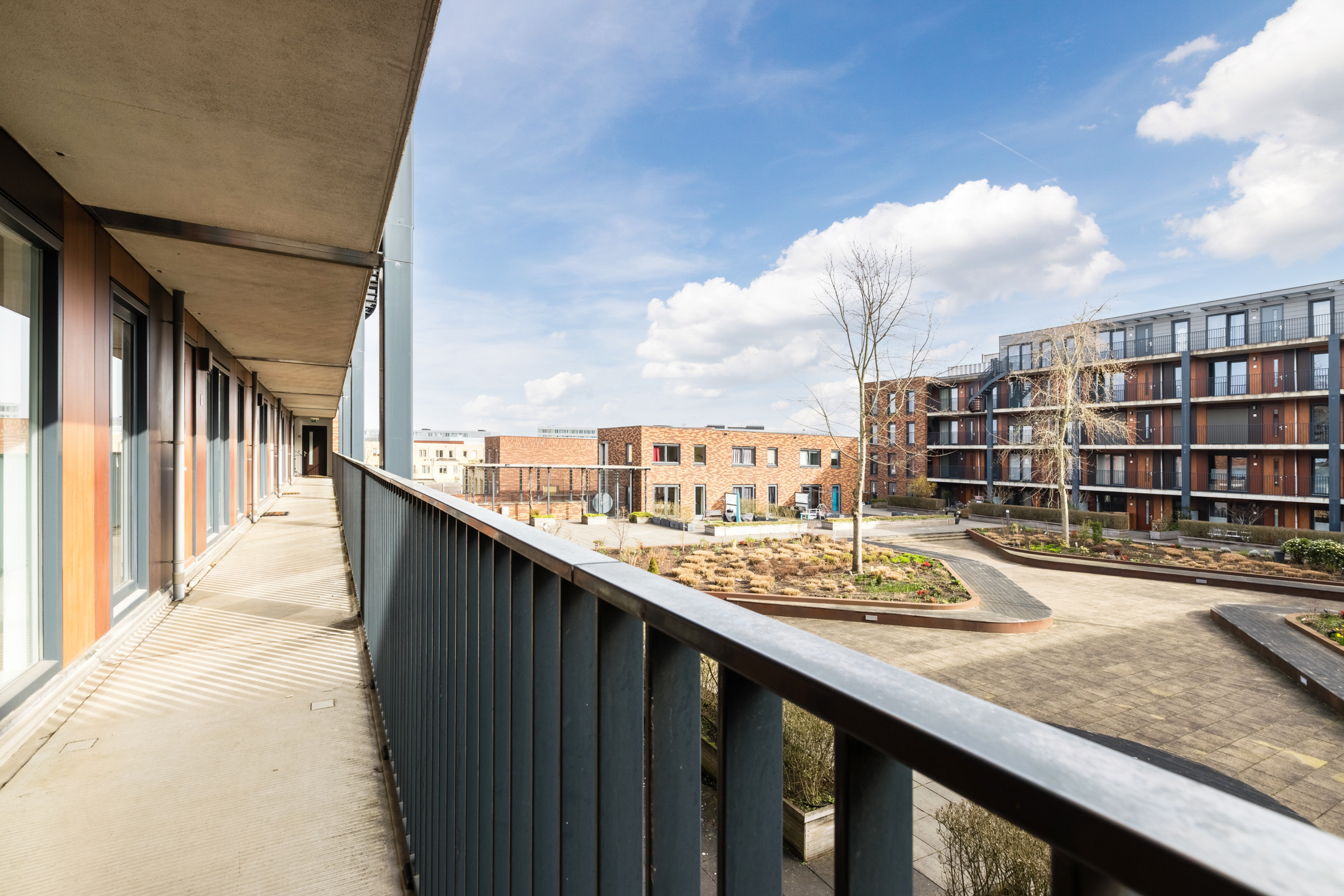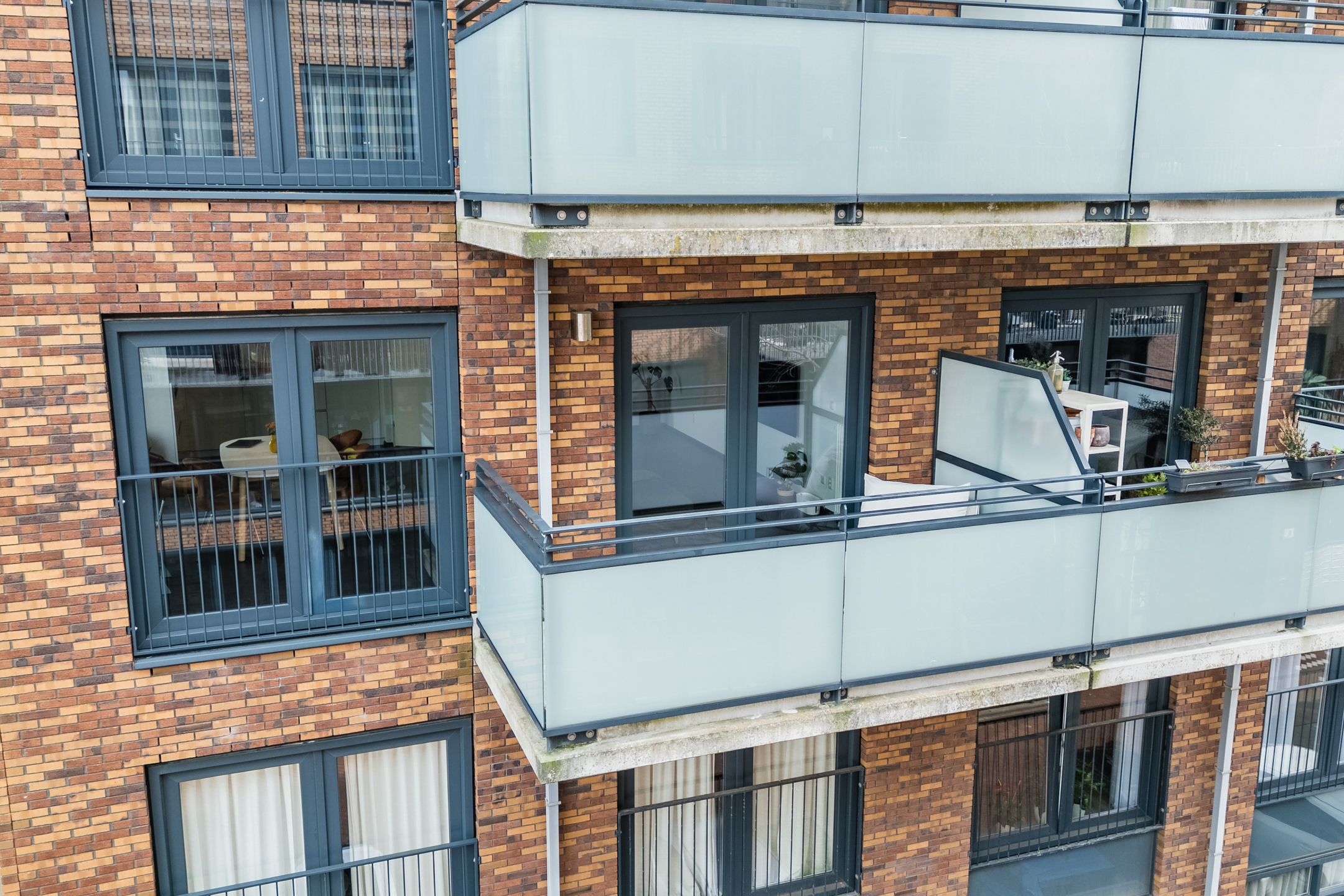 Vanuit de woonkamer is het balkon bereikbaar. Het balkon is gelegen op het westen en biedt dankzij de ligging aan de zijkant van het complex een prettig vrij uitzicht en een fijne plek om in de middag en avond van de zon te genieten.
