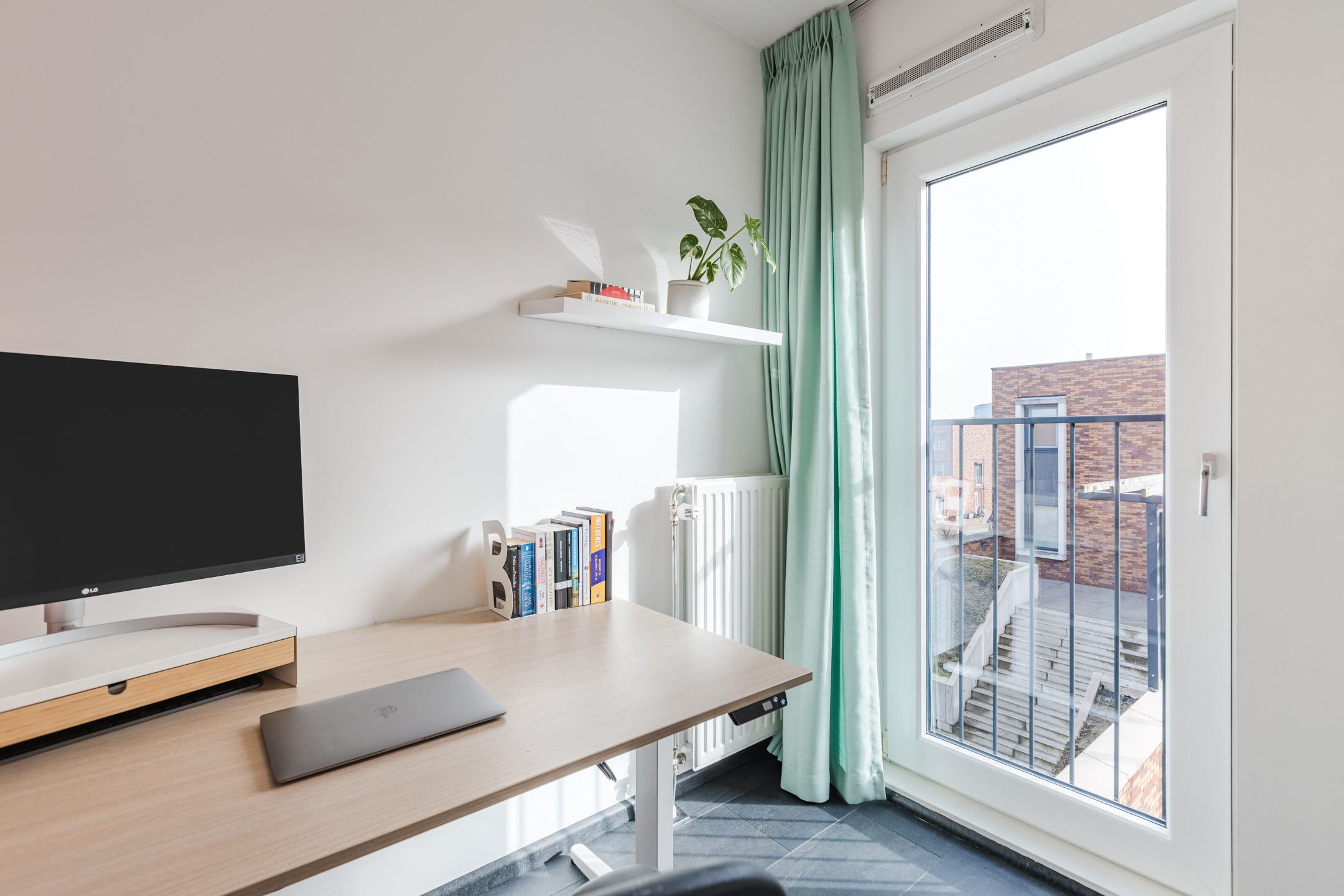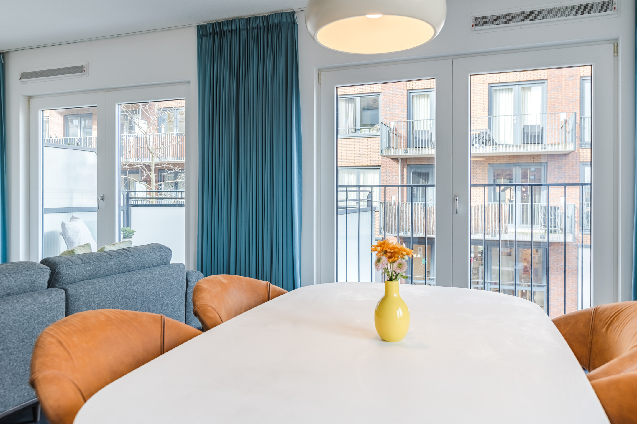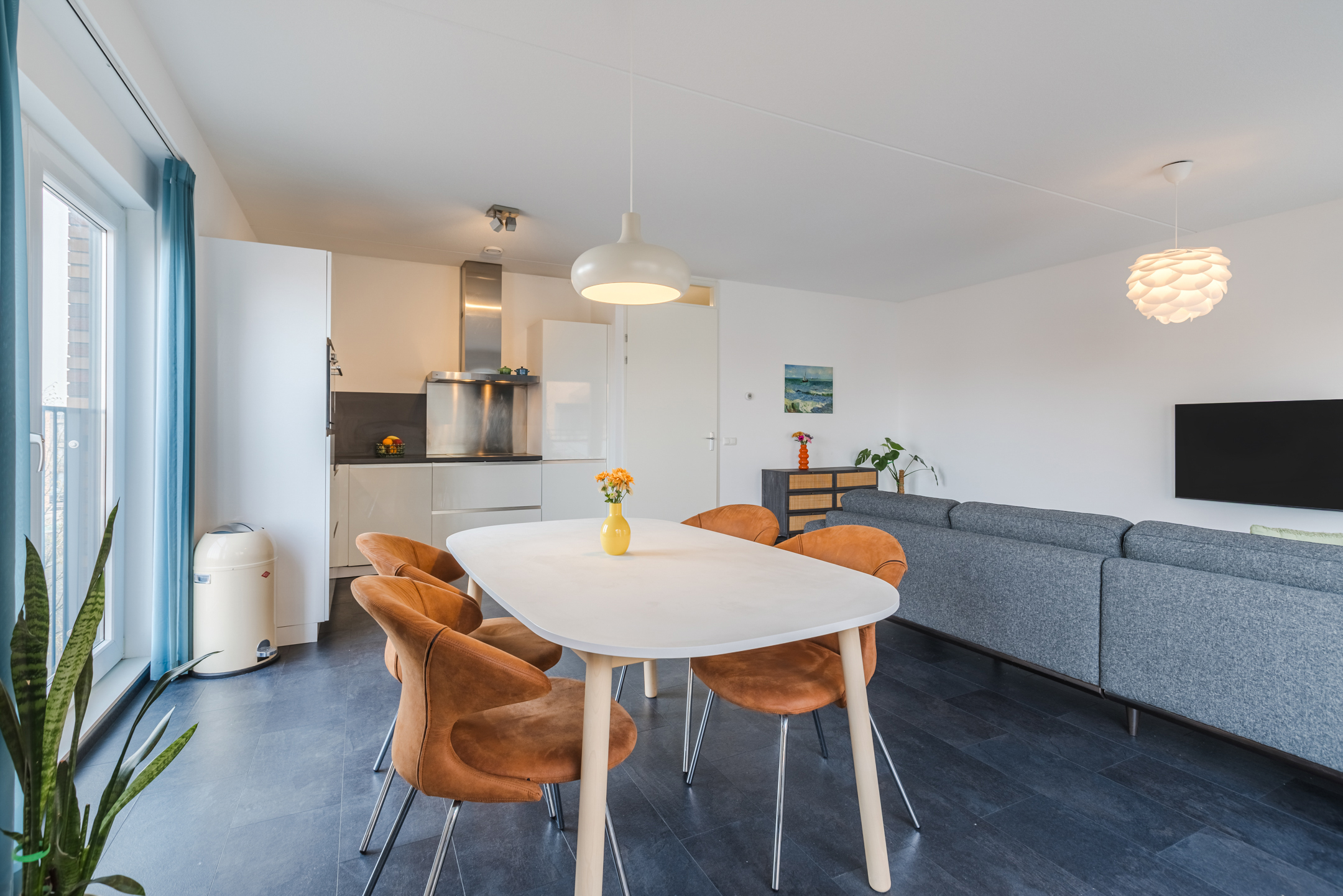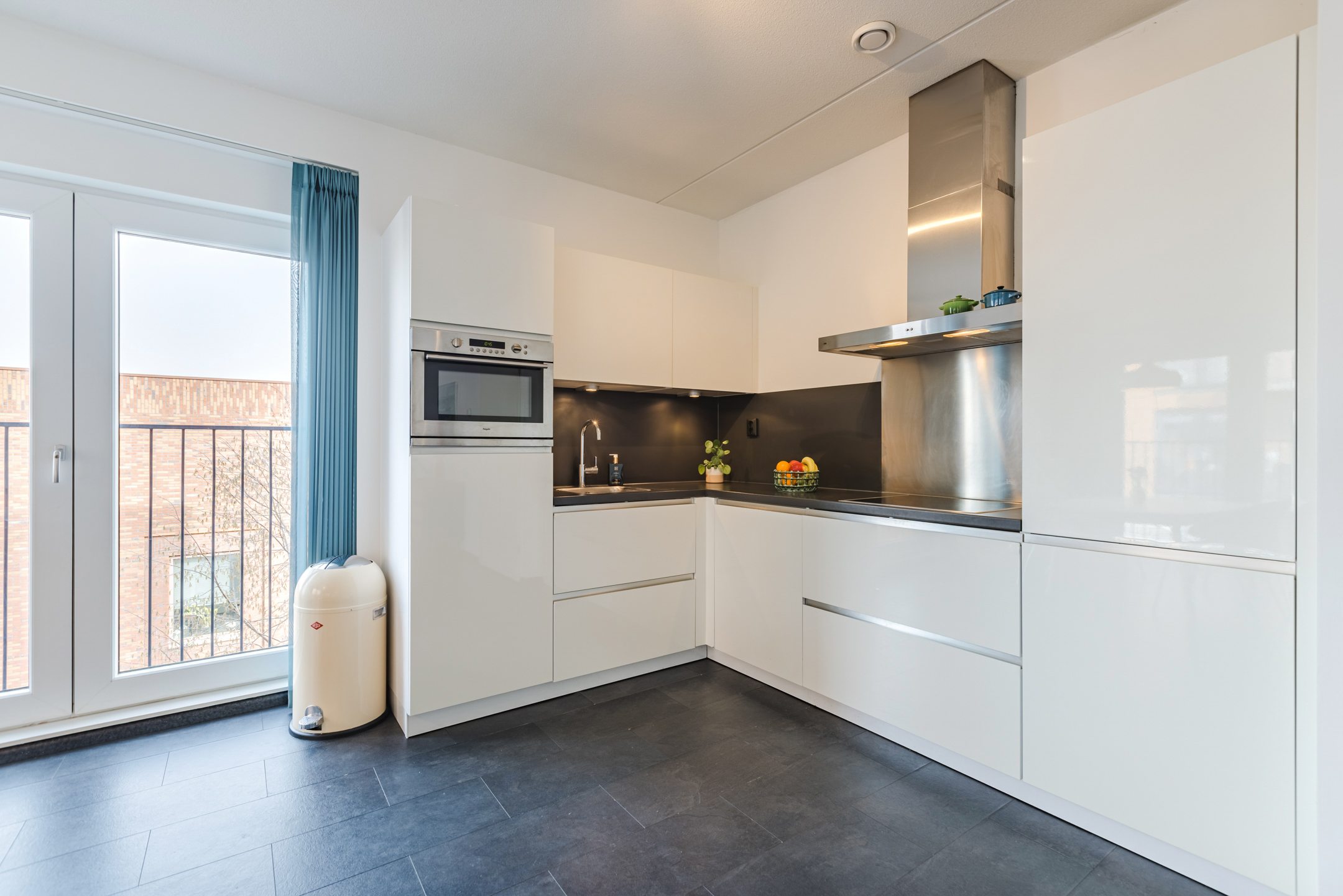 De woonkamer bevindt zich aan de achterzijde van de woning. Dankzij de ligging op de hoek van het complex en de grote raampartijen komt hier veel natuurlijk licht binnen, wat zorgt voor een open en aangename woonbeleving. De ramen kunnen volledig worden geopend waardoor binnen en buiten prettig met elkaar in verbinding staan.