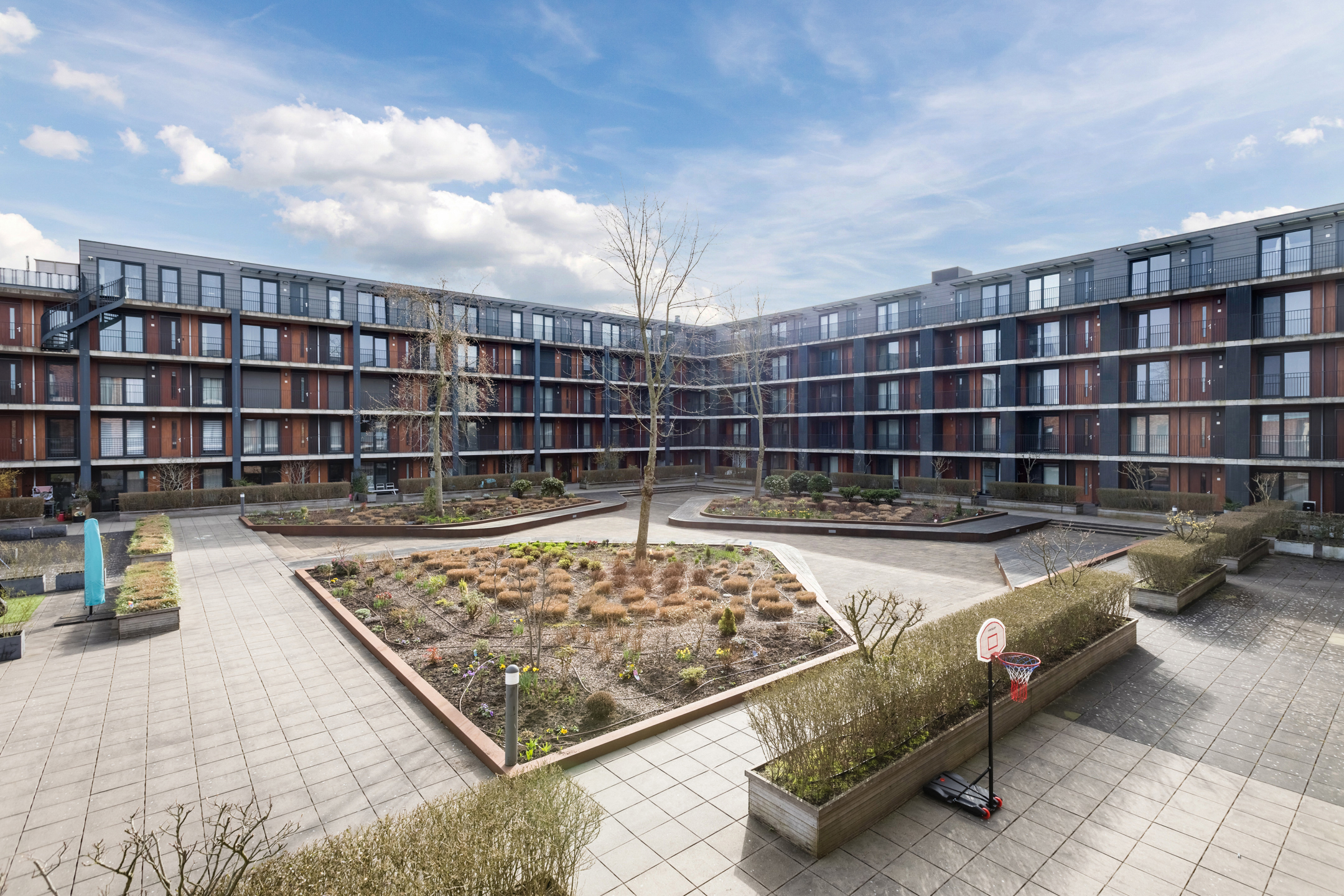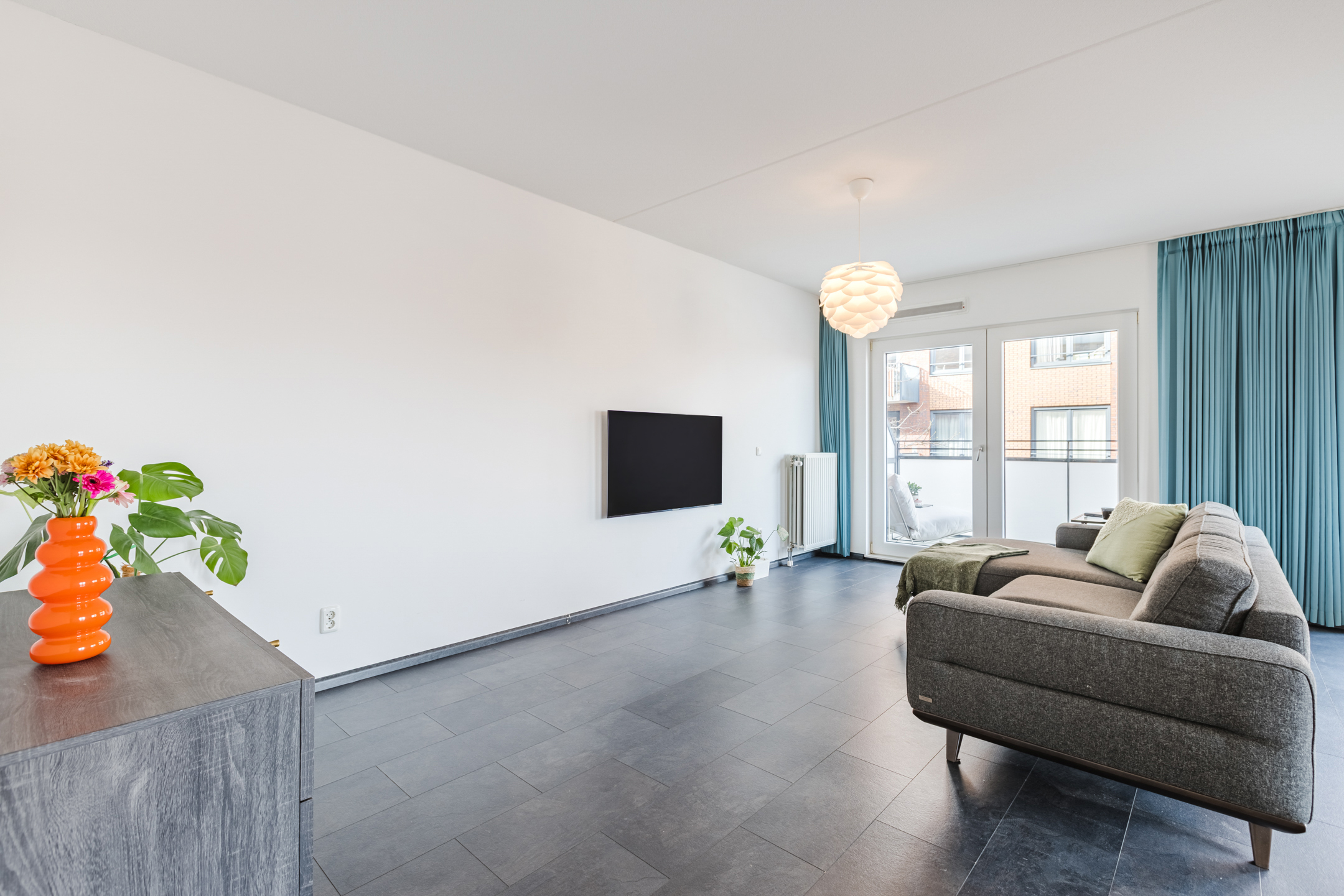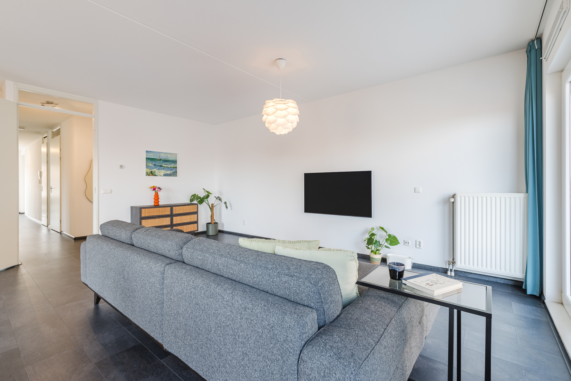 De woonkamer bevindt zich aan de achterzijde van de woning. Dankzij de ligging op de hoek van het complex en de grote raampartijen komt hier veel natuurlijk licht binnen, wat zorgt voor een open en aangename woonbeleving. De ramen kunnen volledig worden geopend waardoor binnen en buiten prettig met elkaar in verbinding staan.