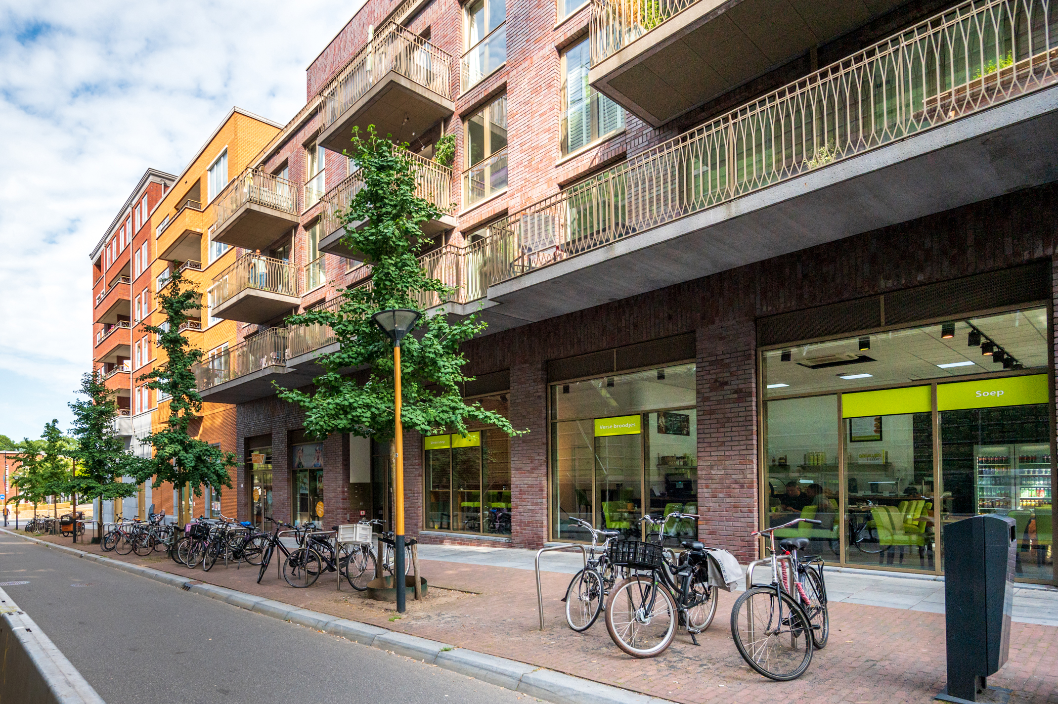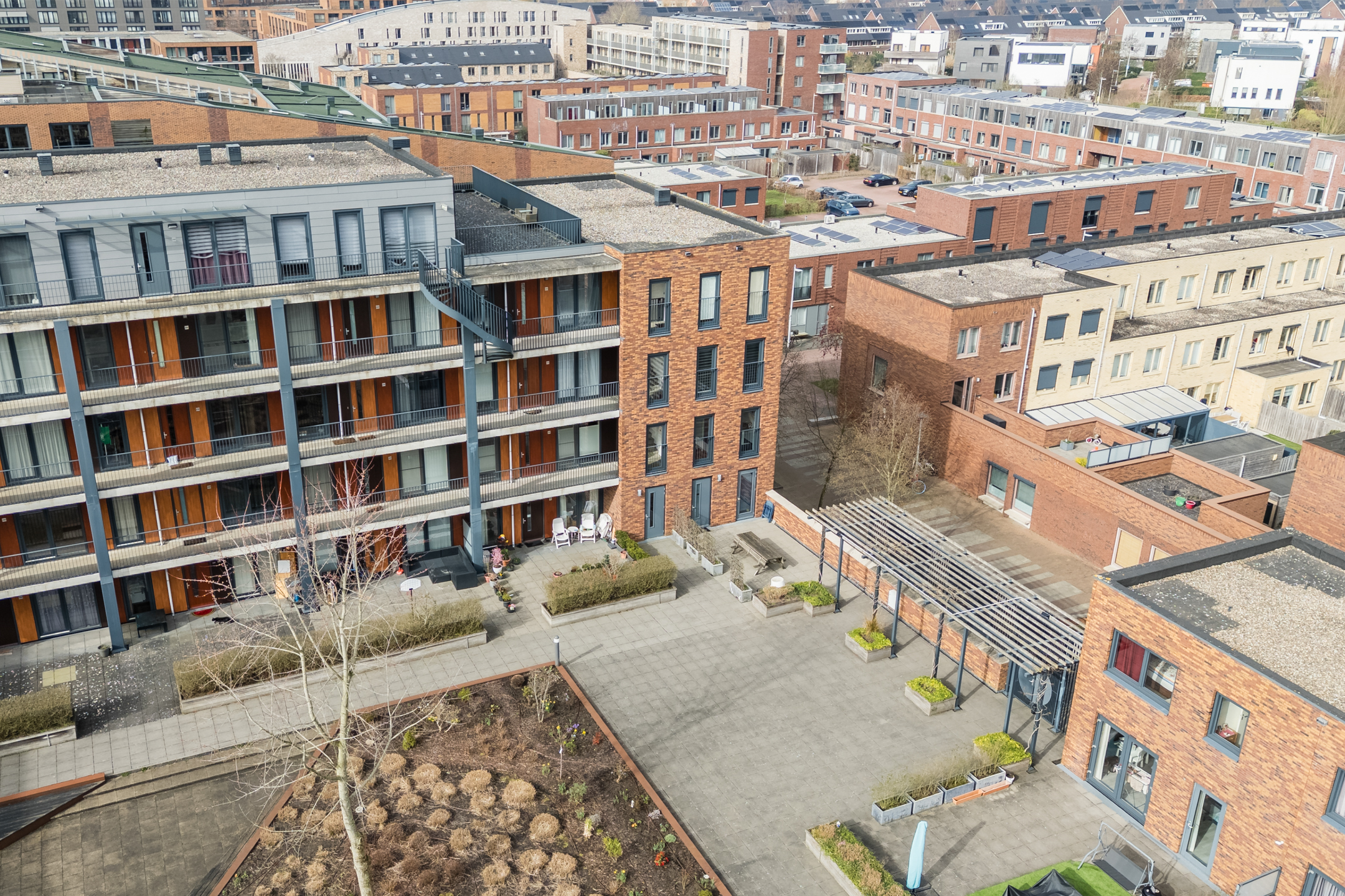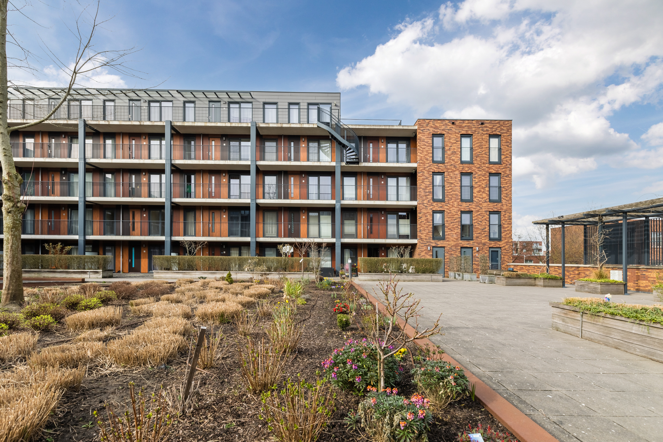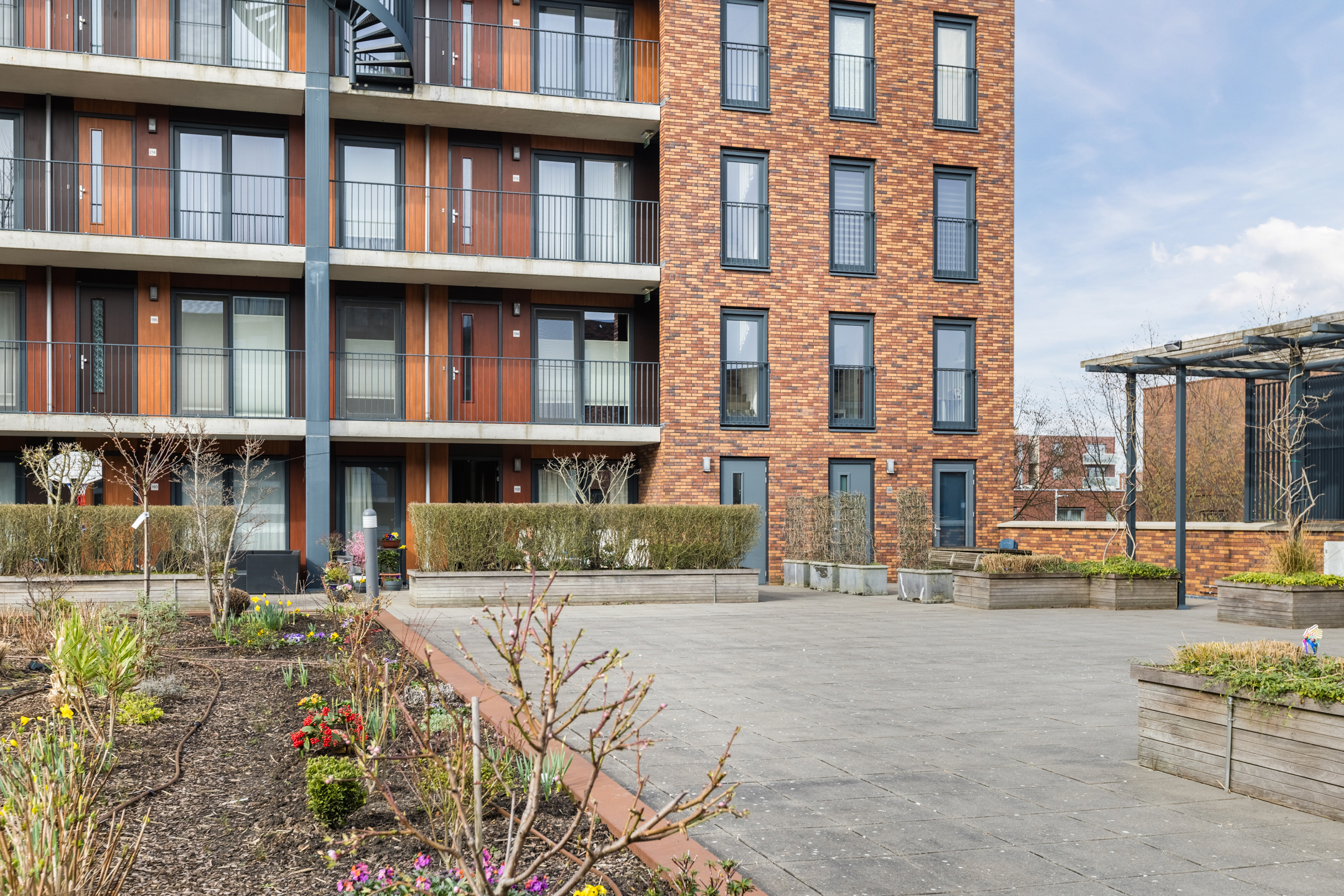 De woonkamer bevindt zich aan de achterzijde van de woning. Dankzij de ligging op de hoek van het complex en de grote raampartijen komt hier veel natuurlijk licht binnen, wat zorgt voor een open en aangename woonbeleving. De ramen kunnen volledig worden geopend waardoor binnen en buiten prettig met elkaar in verbinding staan.