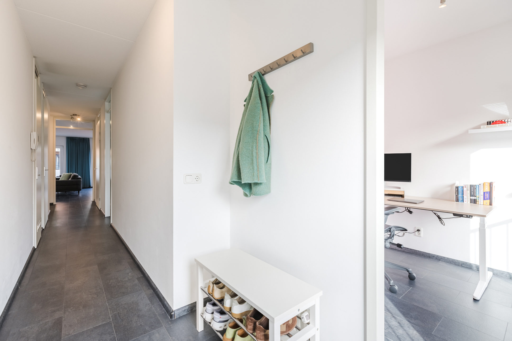 De gehele tweede verdieping is voorzien van een zwarte tegel look vloer en een gestucte wand- en plafondafwerking met spachtelputz.