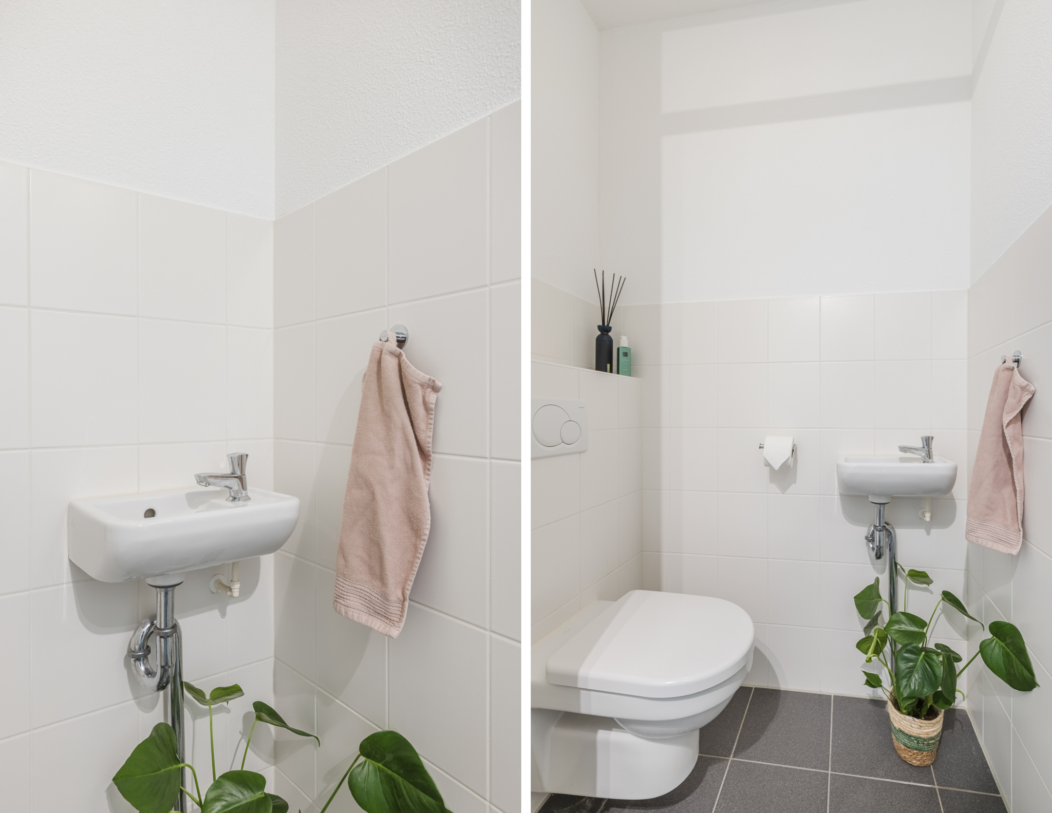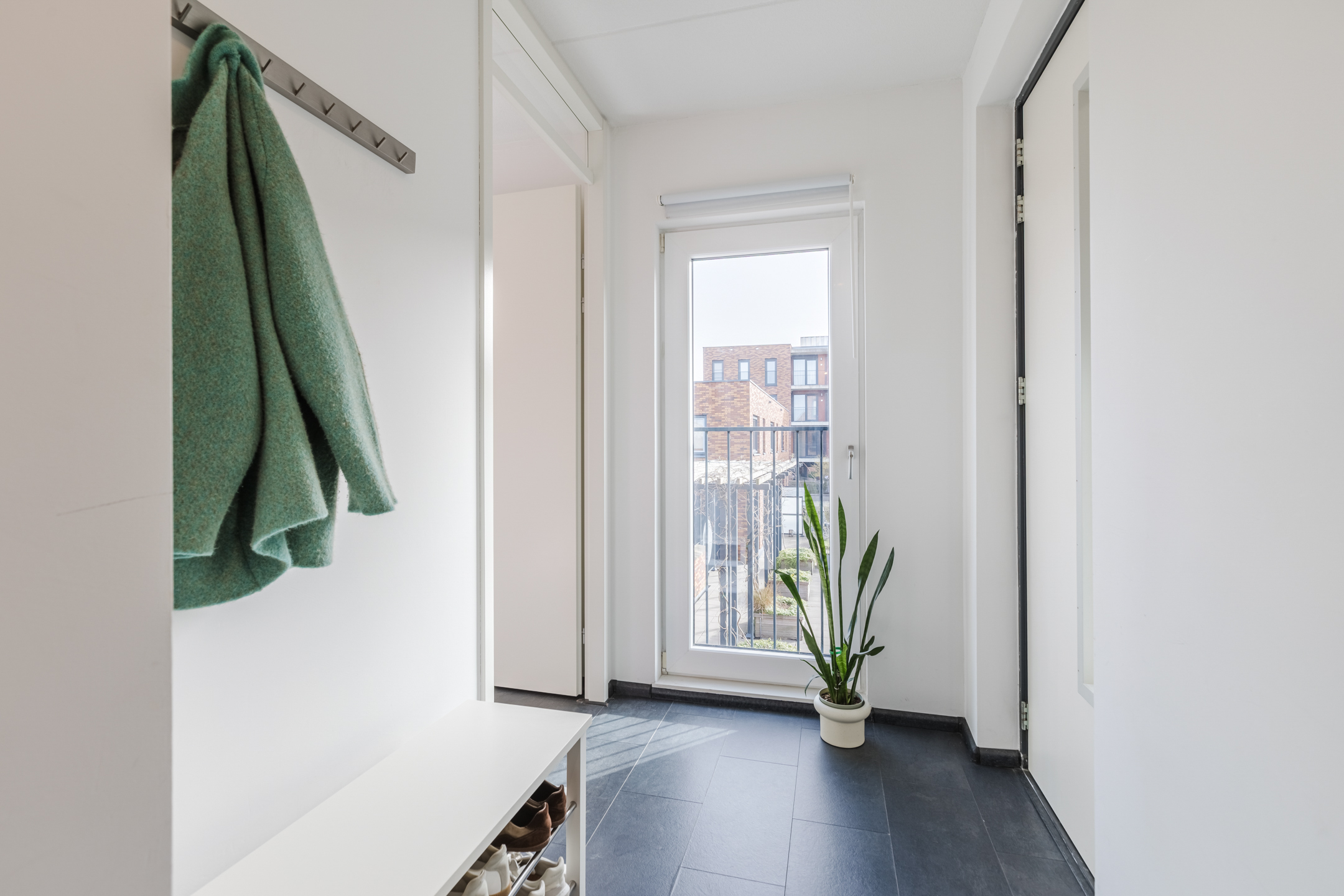 Entree, hal, garderobe, toiletruimte met hangend toilet en fontein. Vanuit de hal heb je toegang tot de slaapkamers, de badkamer, de inpandige berging, het toilet en de woonkamer.