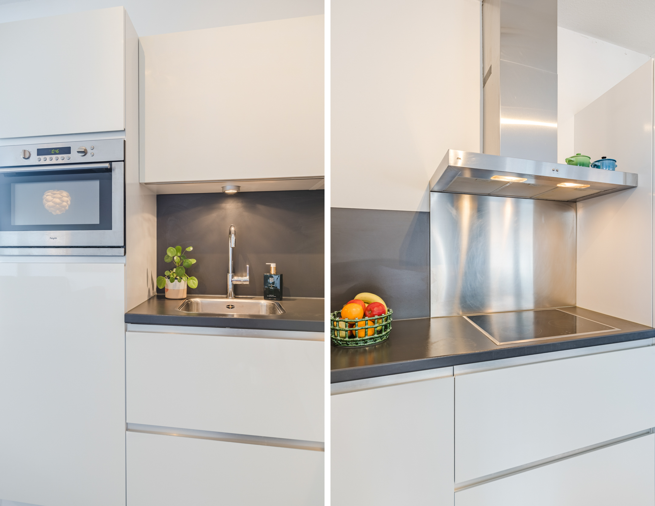 De open keuken is geplaatst in een L opstelling en uitgevoerd in hoogglans witte kastfronten met een zwart aanrechtblad. De keuken beschikt over diverse wenselijke inbouwapparatuur, te weten: een inductiekookplaat, een oven, een koel-/vriescombinatie (Bosch 2025), een vaatwasser (Bosch 2024) en een afzuigkap.