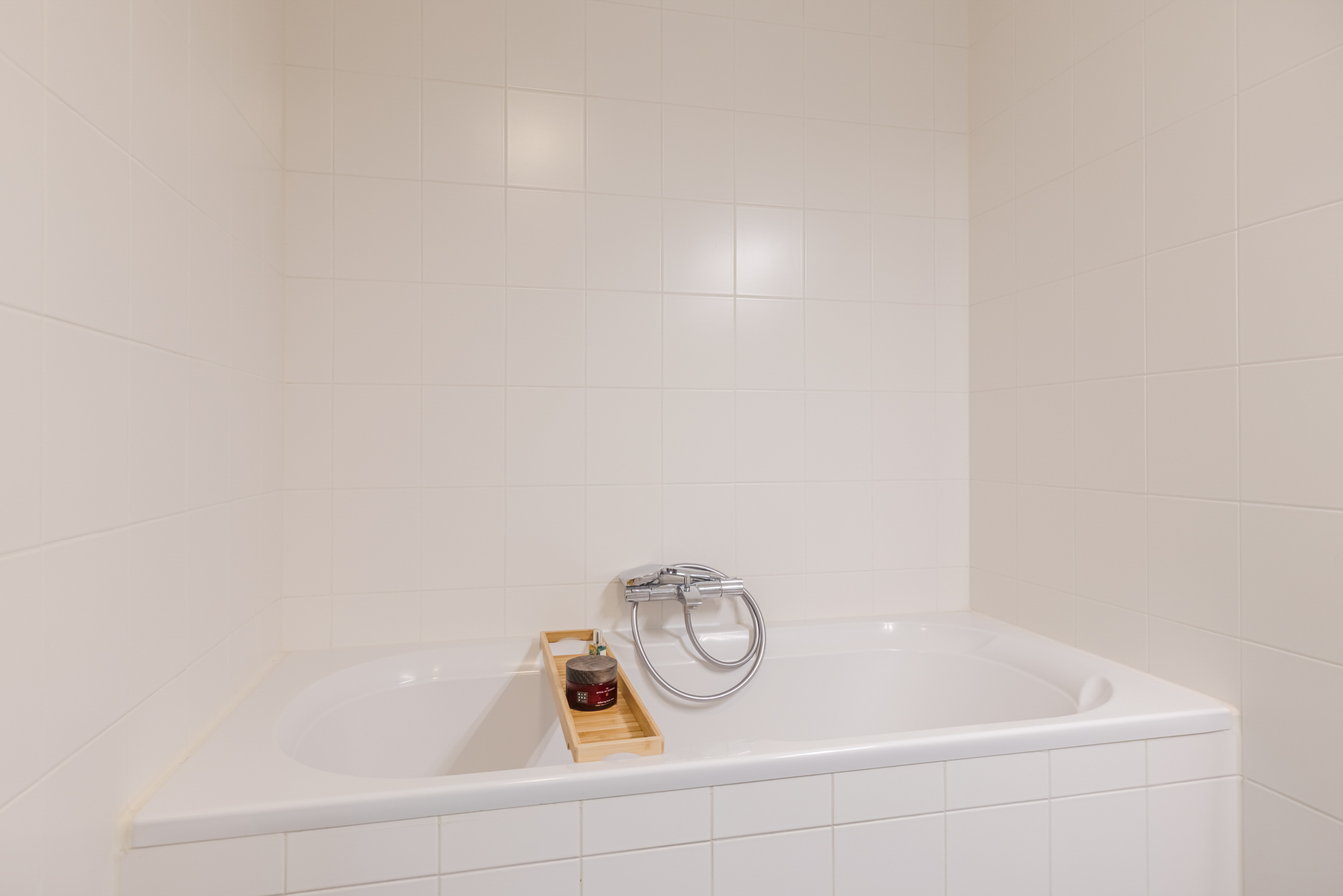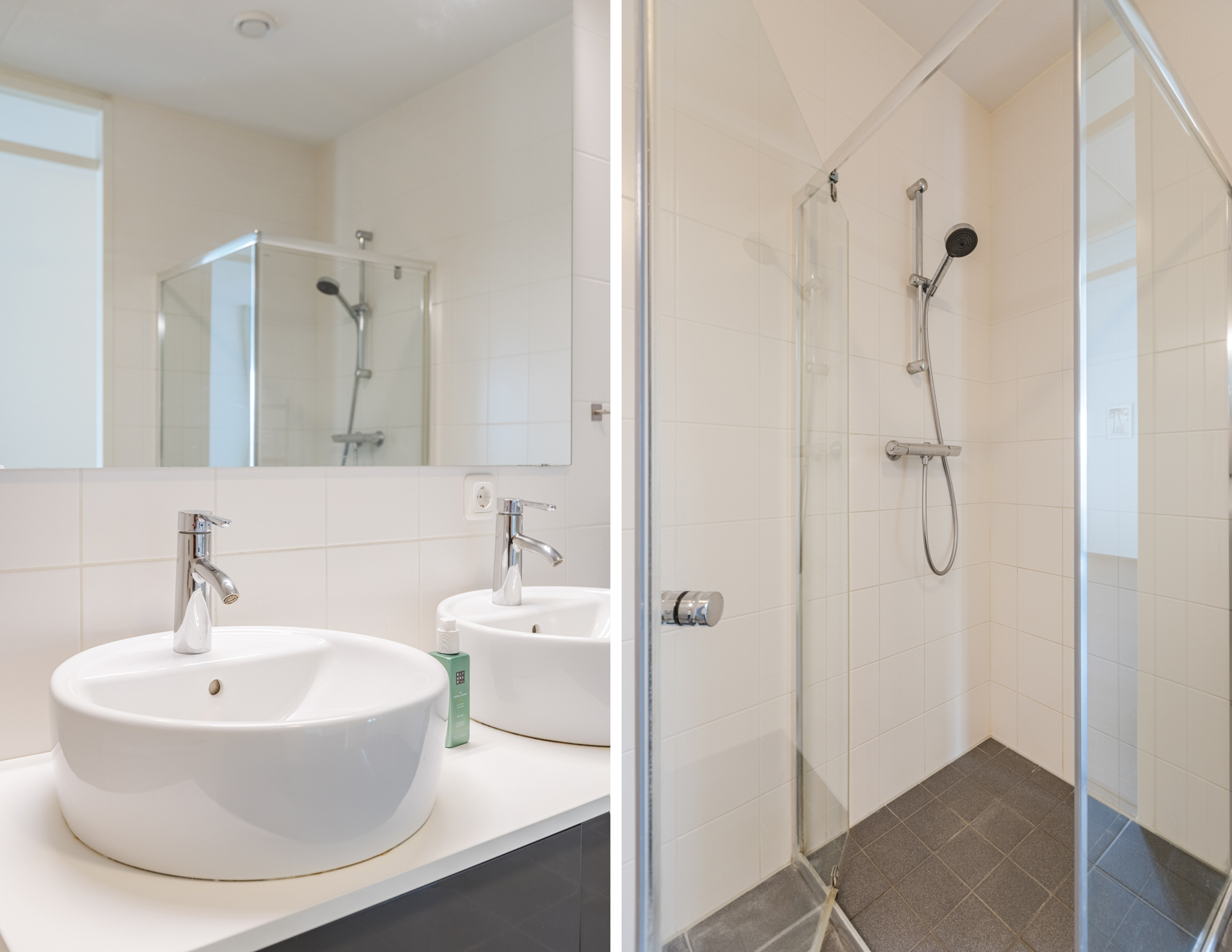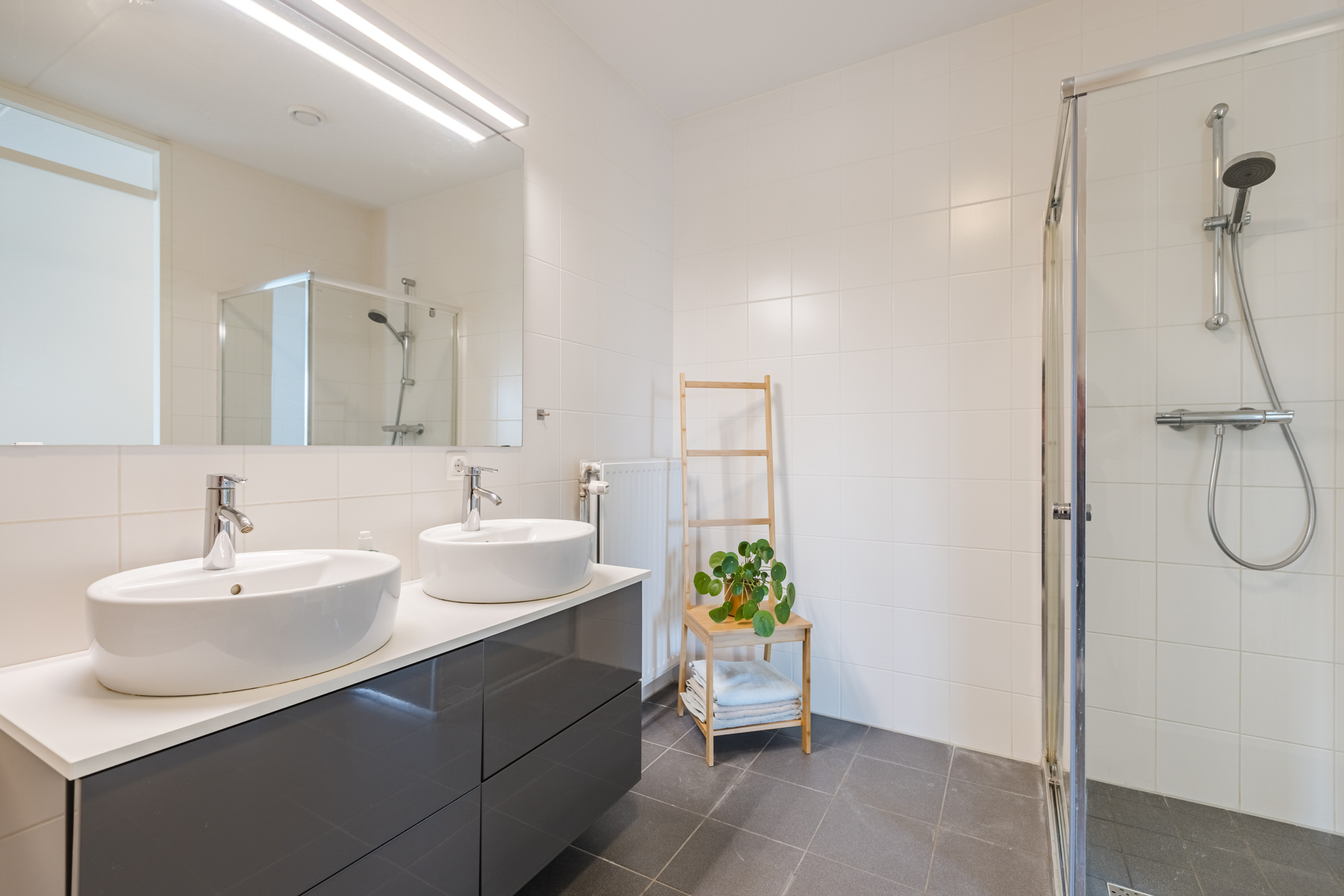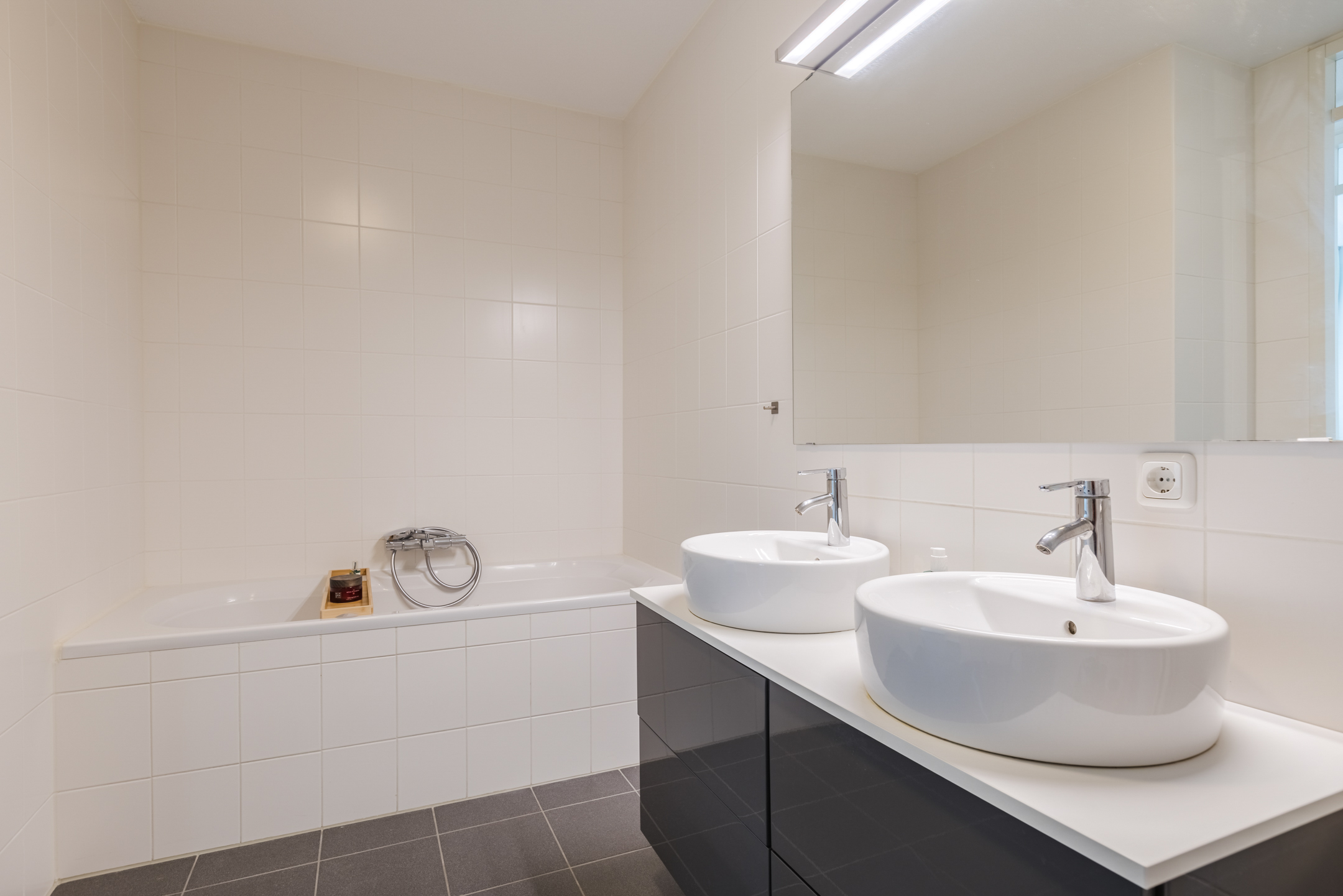 De badkamer is uitgevoerd met zwarte vloertegels en witte wandtegels en beschikt over een douchecabine, een ligbad en een dubbele wastafel met meubel. Daarnaast is de ruimte voorzien van een radiator en mechanische ventilatie.