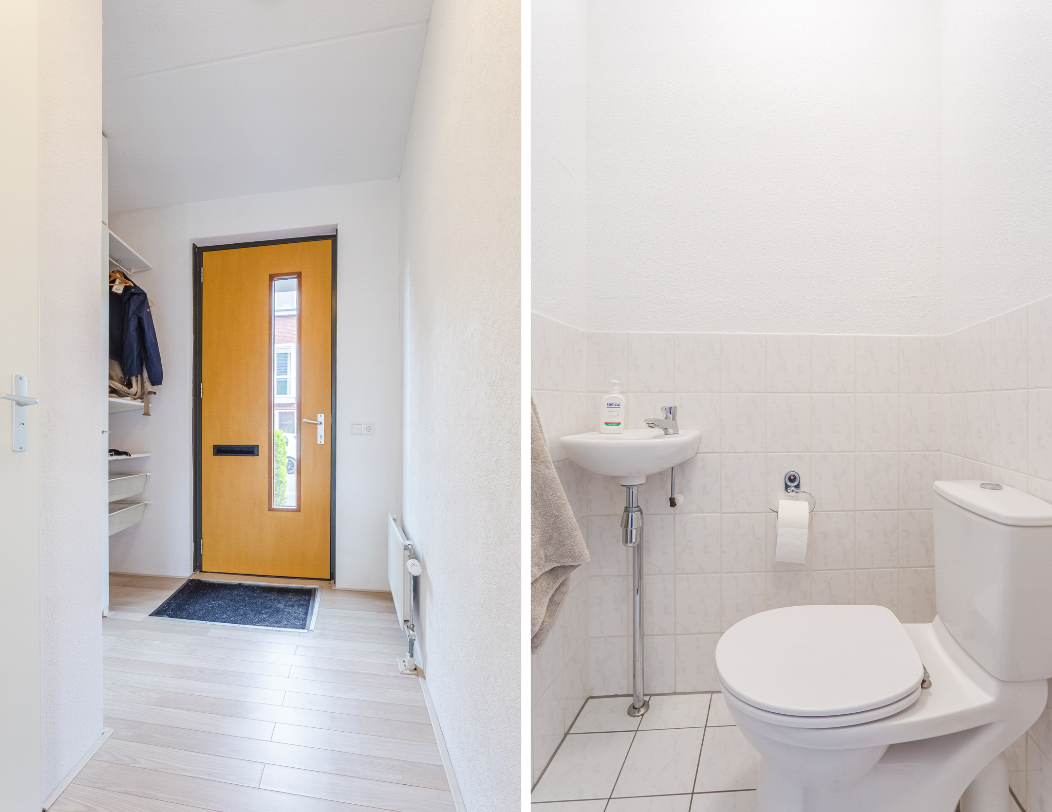 Entree, ruime hal met garderobe, toiletruimte met staand toilet en fontein, meterkast en toegangsdeur naar de woonkamer met open keuken.