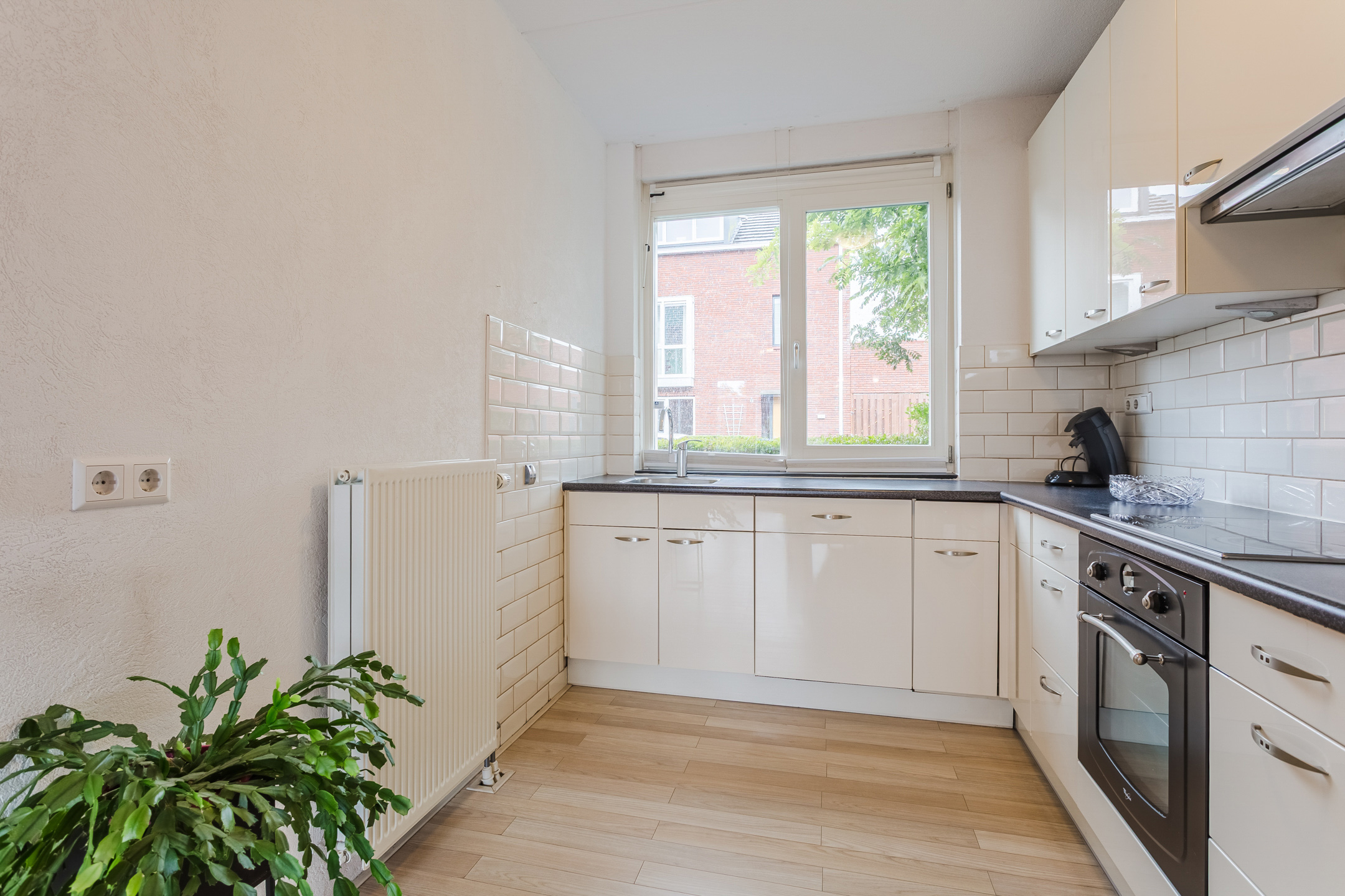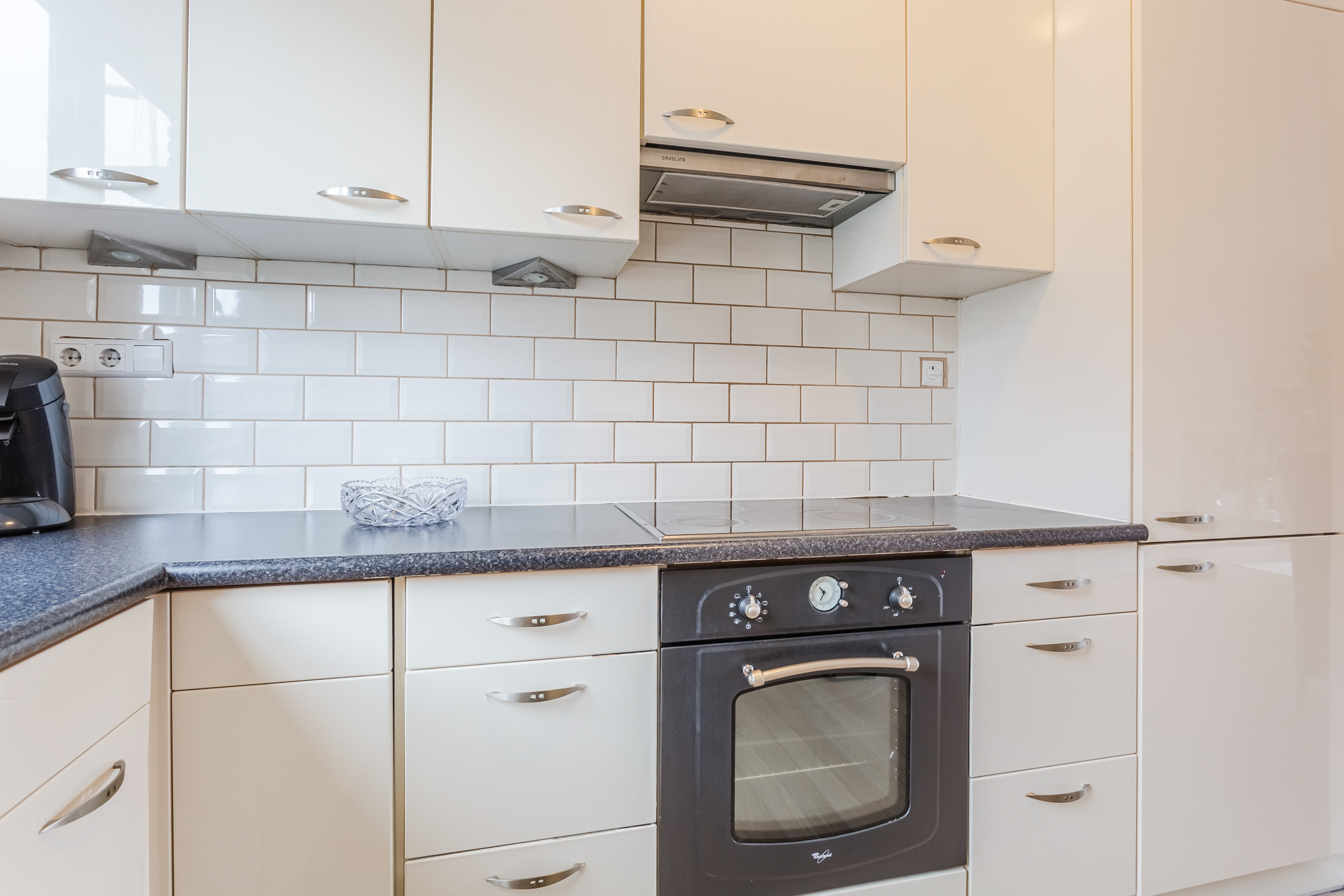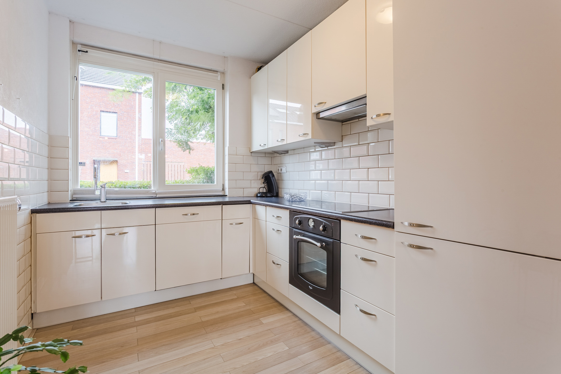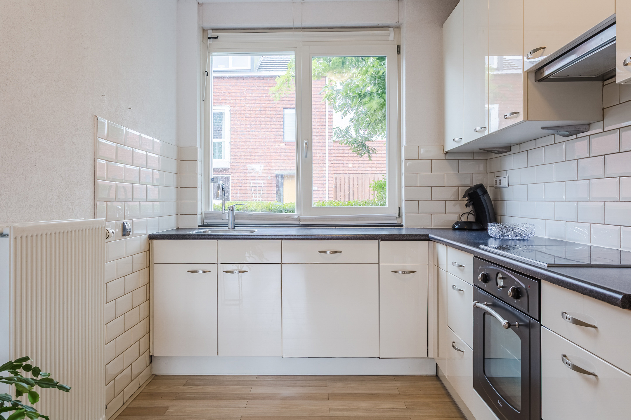 Aan de voorzijde van de woning bevindt zich de moderne open keuken. De keuken, geplaatst in een ruime L-opstelling, is uitgevoerd in een neutrale offwhite kleurstelling en voorzien van diverse inbouwapparatuur, te weten: een 4-pits kookplaat, een oven, een koel-/ vriescombinatie & een vaatwasser. Door de aanwezigheid van een groot draai-/ kiepraam heb je een gezellig uitzicht op de voortuin (zuidwest situering) en Stuytstraat.