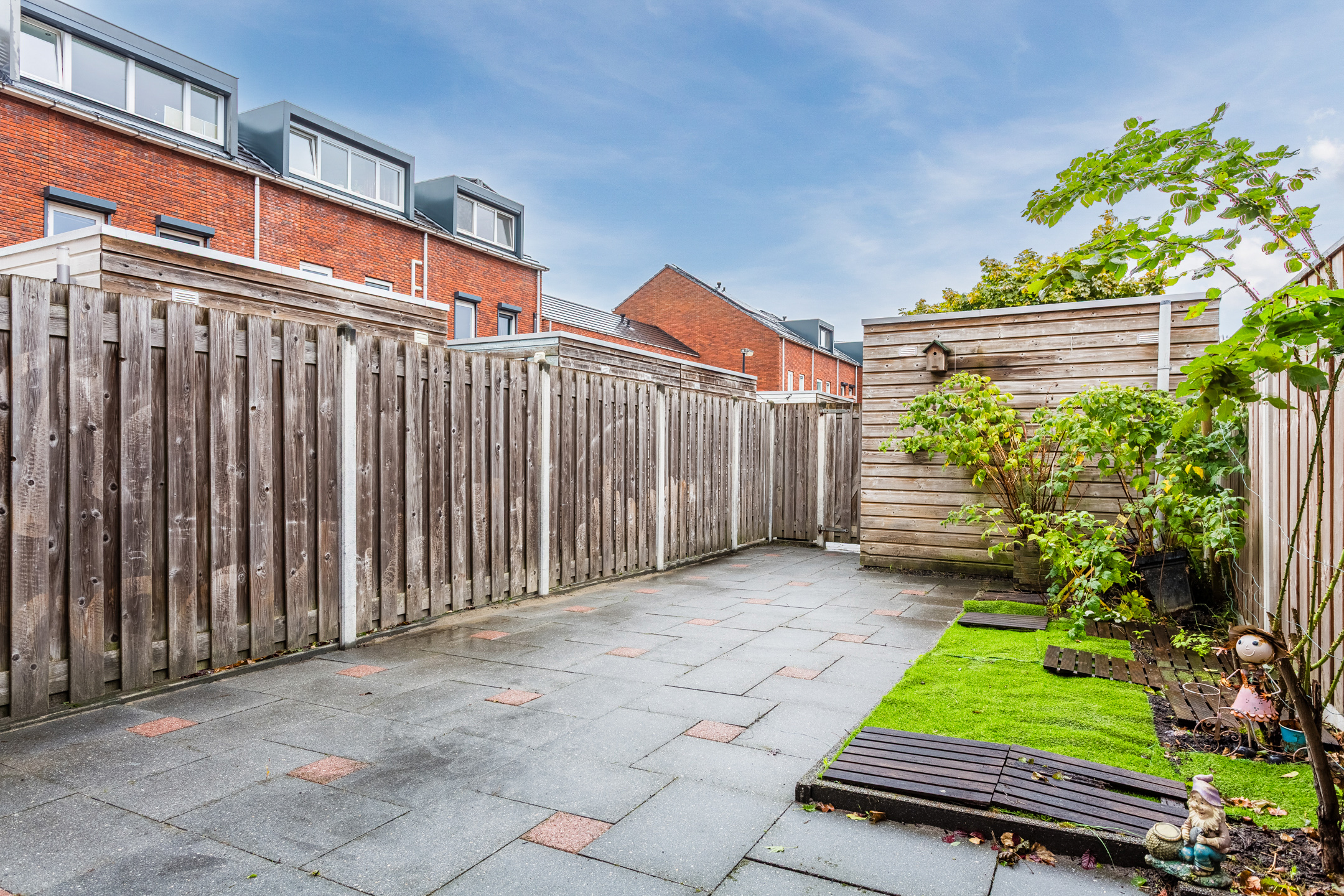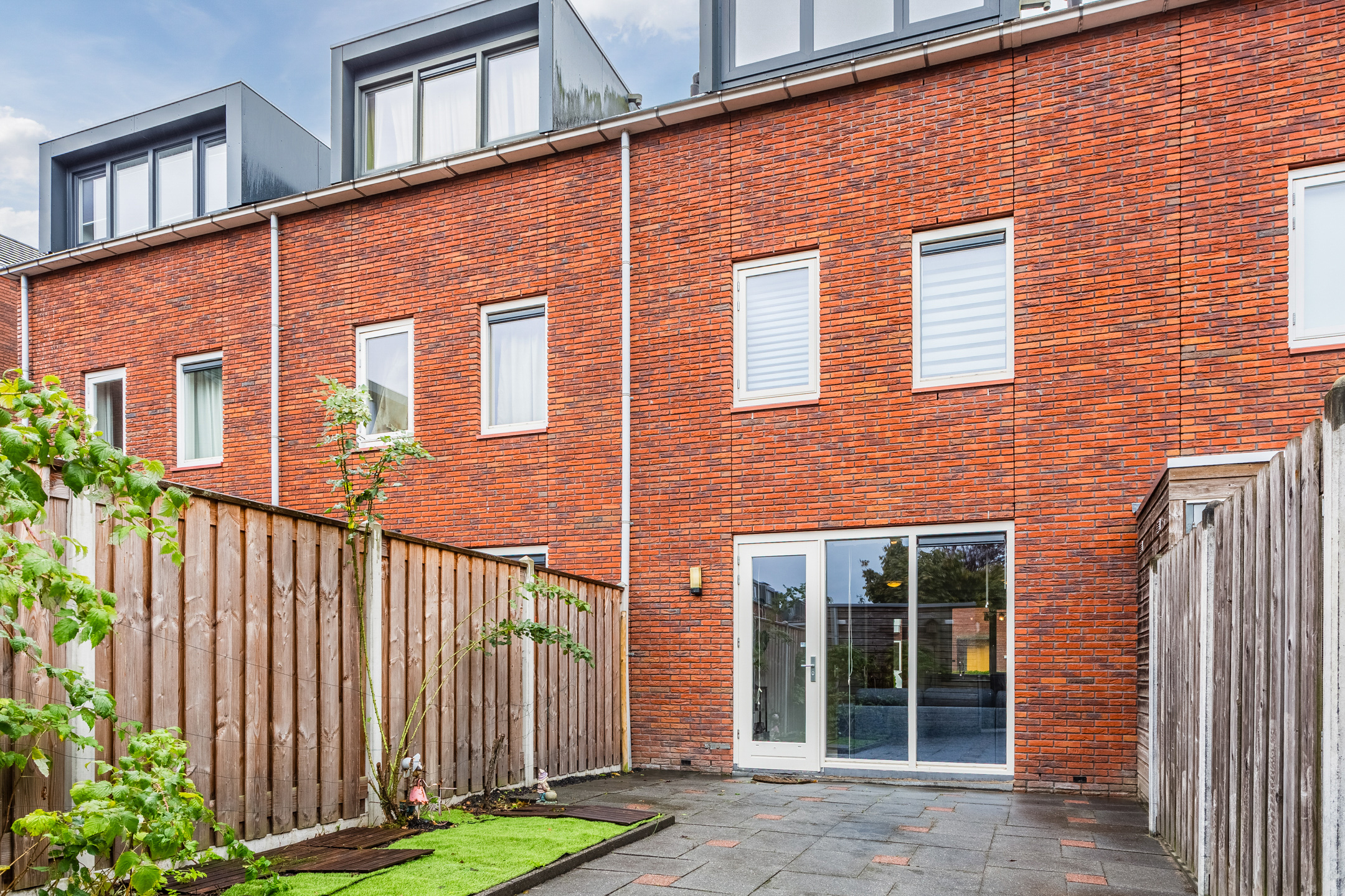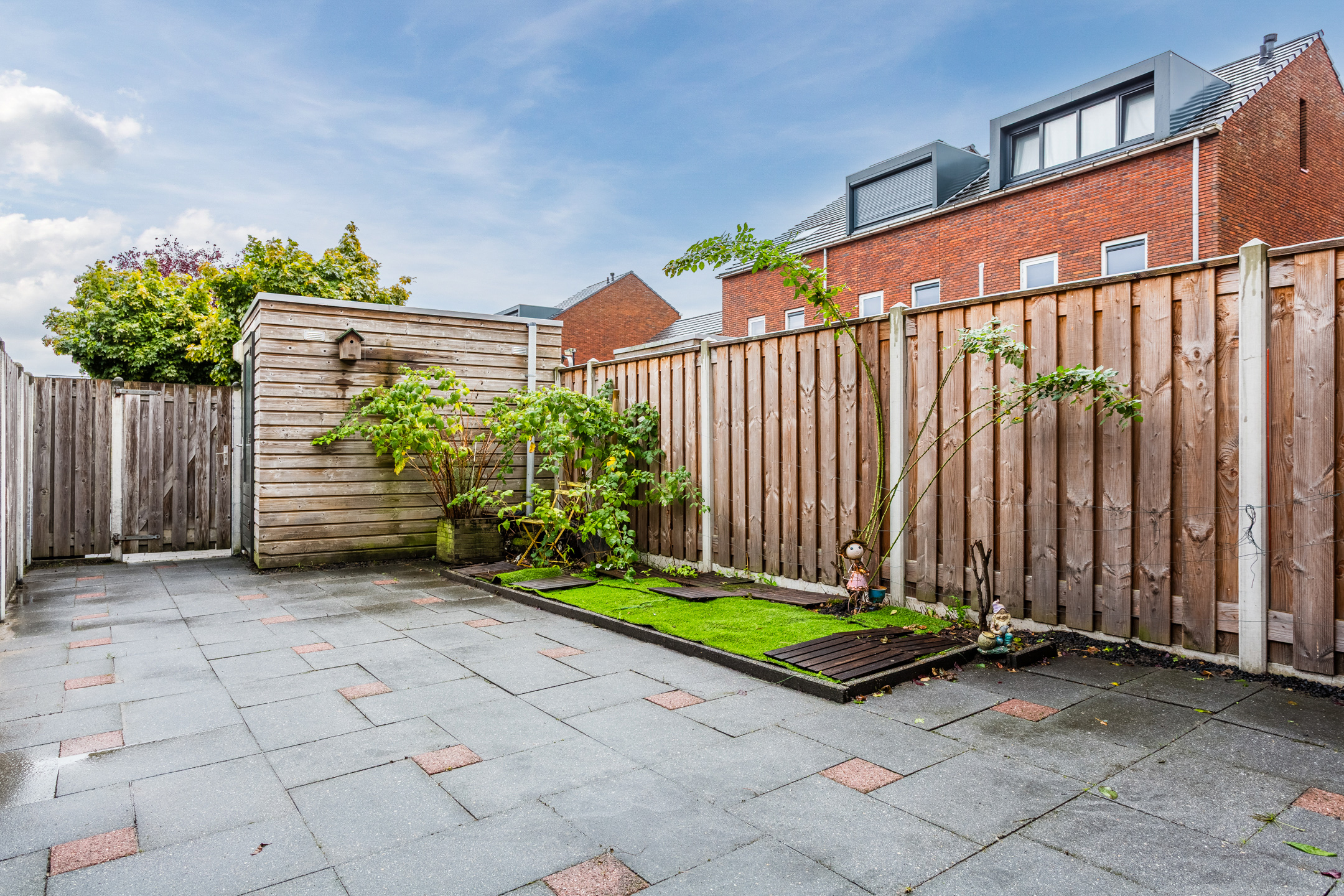 Middels de toegangsdeur bereik je de onderhoudsvriendelijk achtertuin. De achtertuin, gelegen op het noordoosten, is voorzien van bestrating, een houten erfafscheiding, een vrijstaande houten berging (ca. 2,97 x 1,97 m) en een handige achterom.