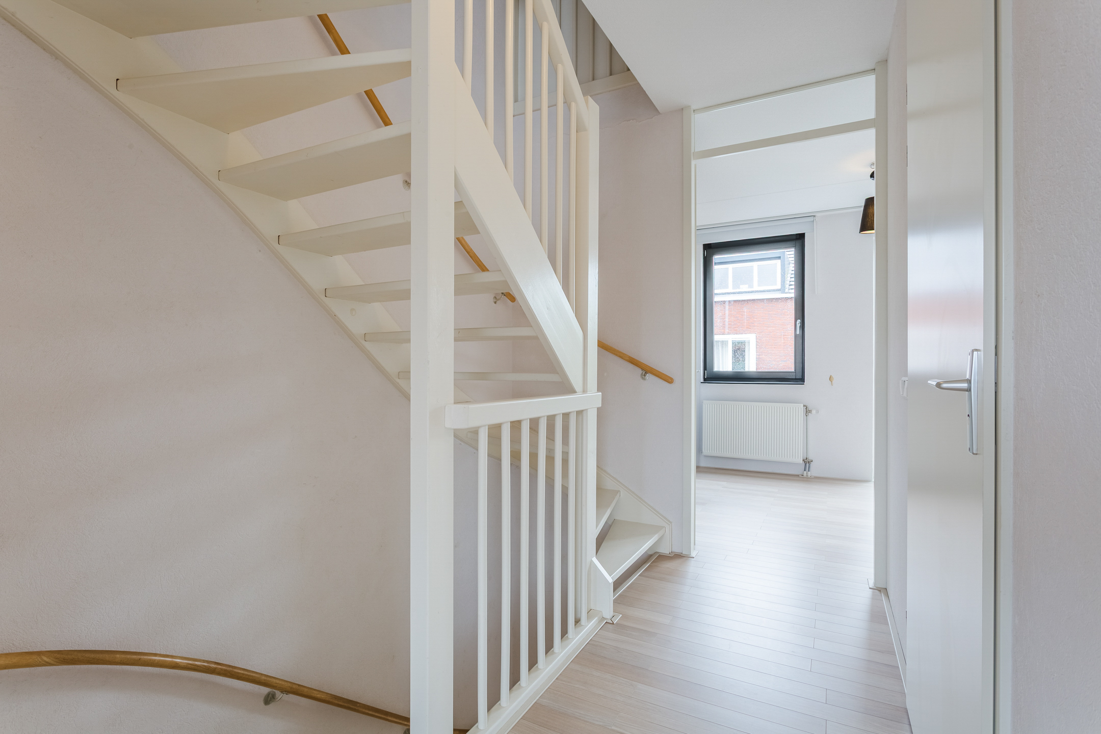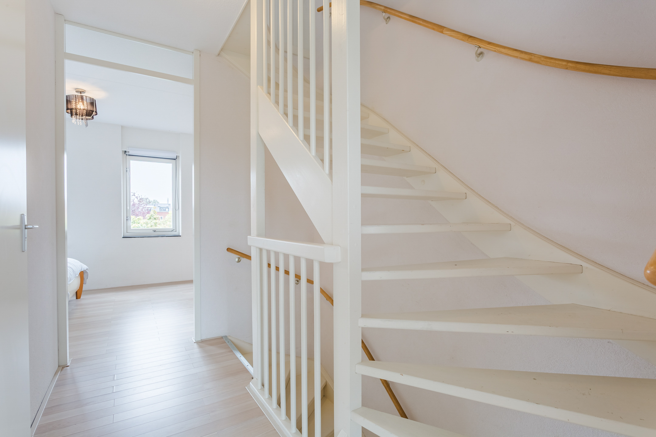 Overloop, trapopgang naar de tweede verdieping. Op deze verdieping tref je twee woningbrede , multifunctionele (slaap)kamers en de inpandige badkamer.