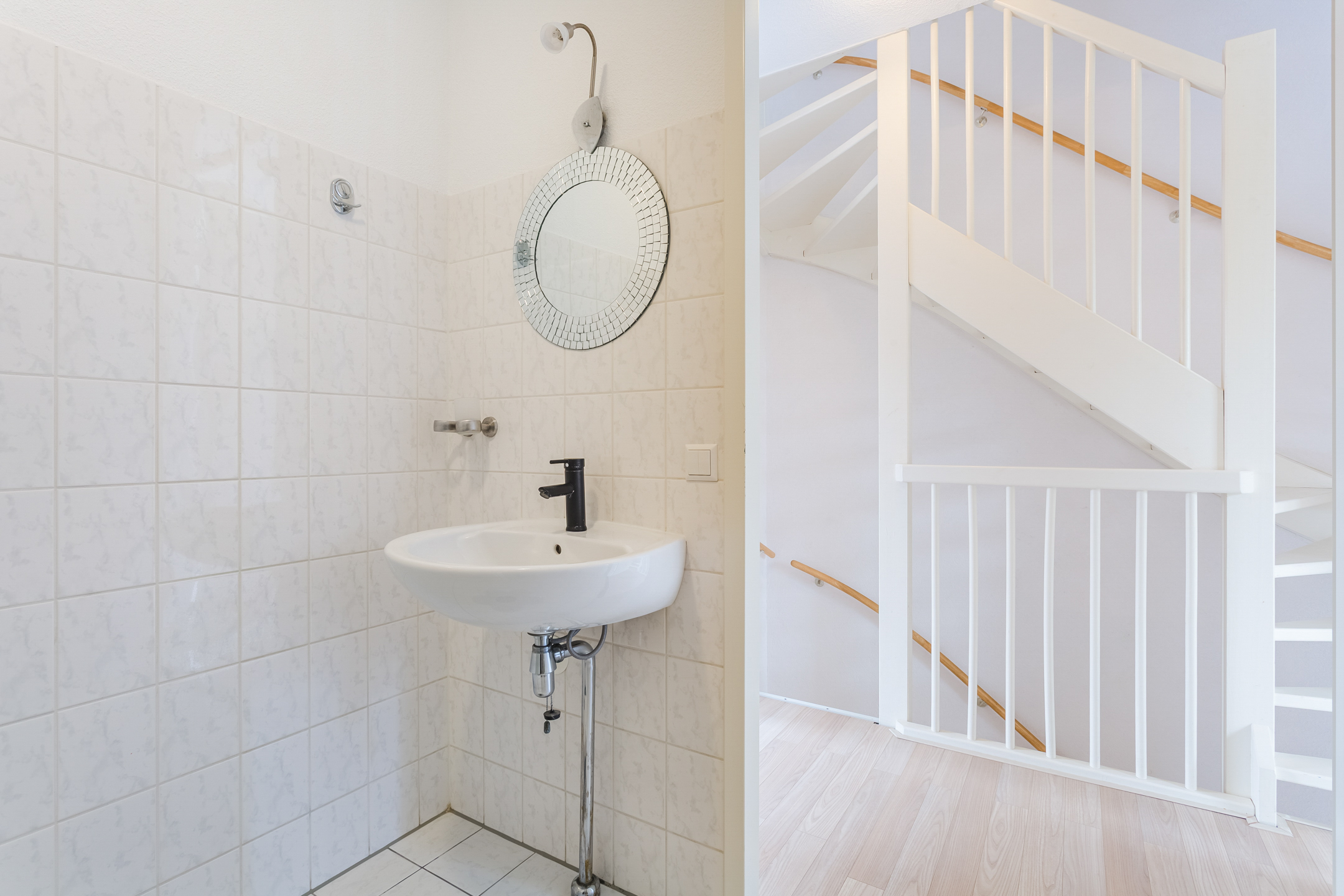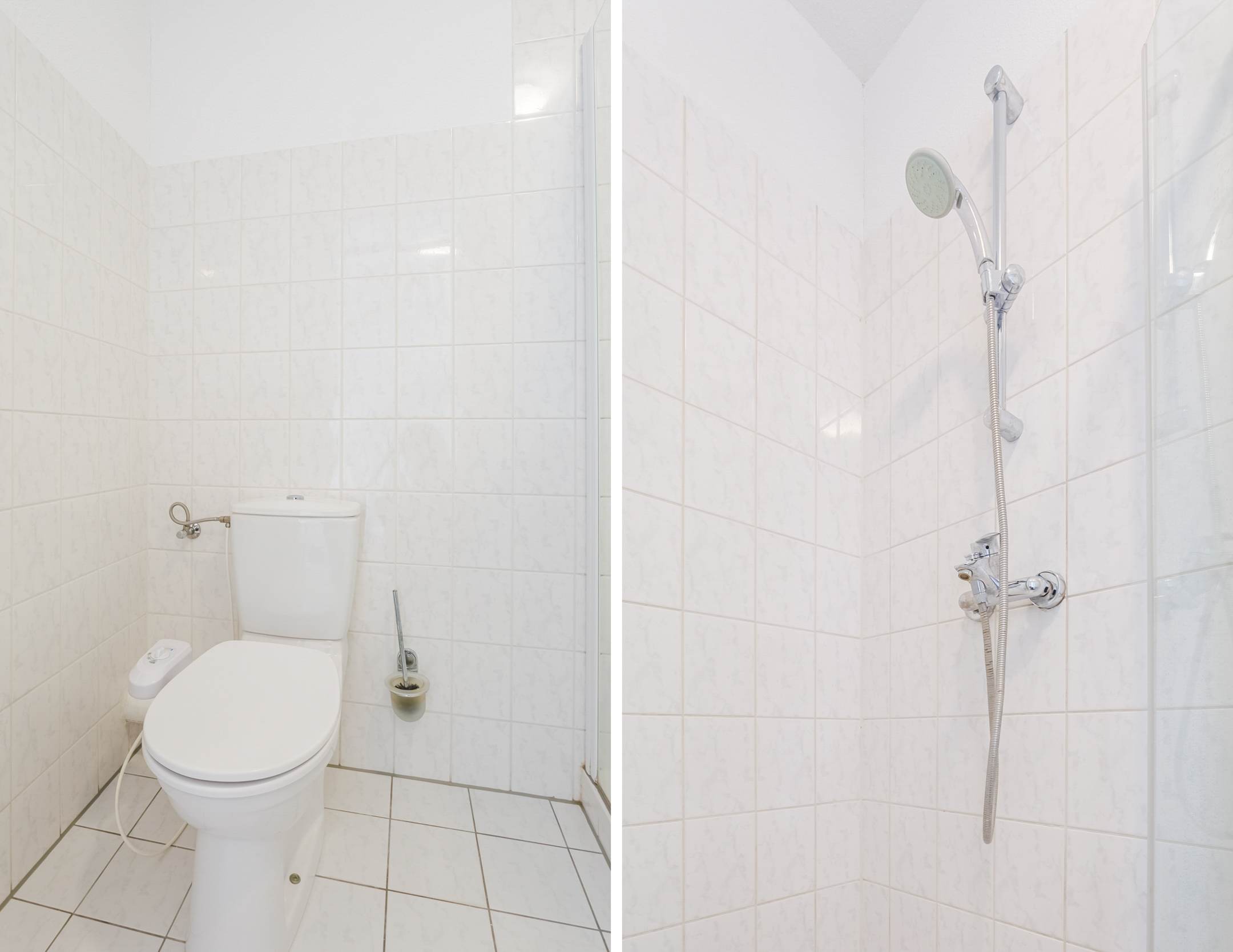 De moderne, inpandige badkamer is eenvoudig qua uitvoering en voorzien van een douchecabine, een wastafel, een tweede toilet met bidet functie en mechanische ventilatie. Indien gewenst kan de badkamer worden vergroot zodat er een ligbad in past.