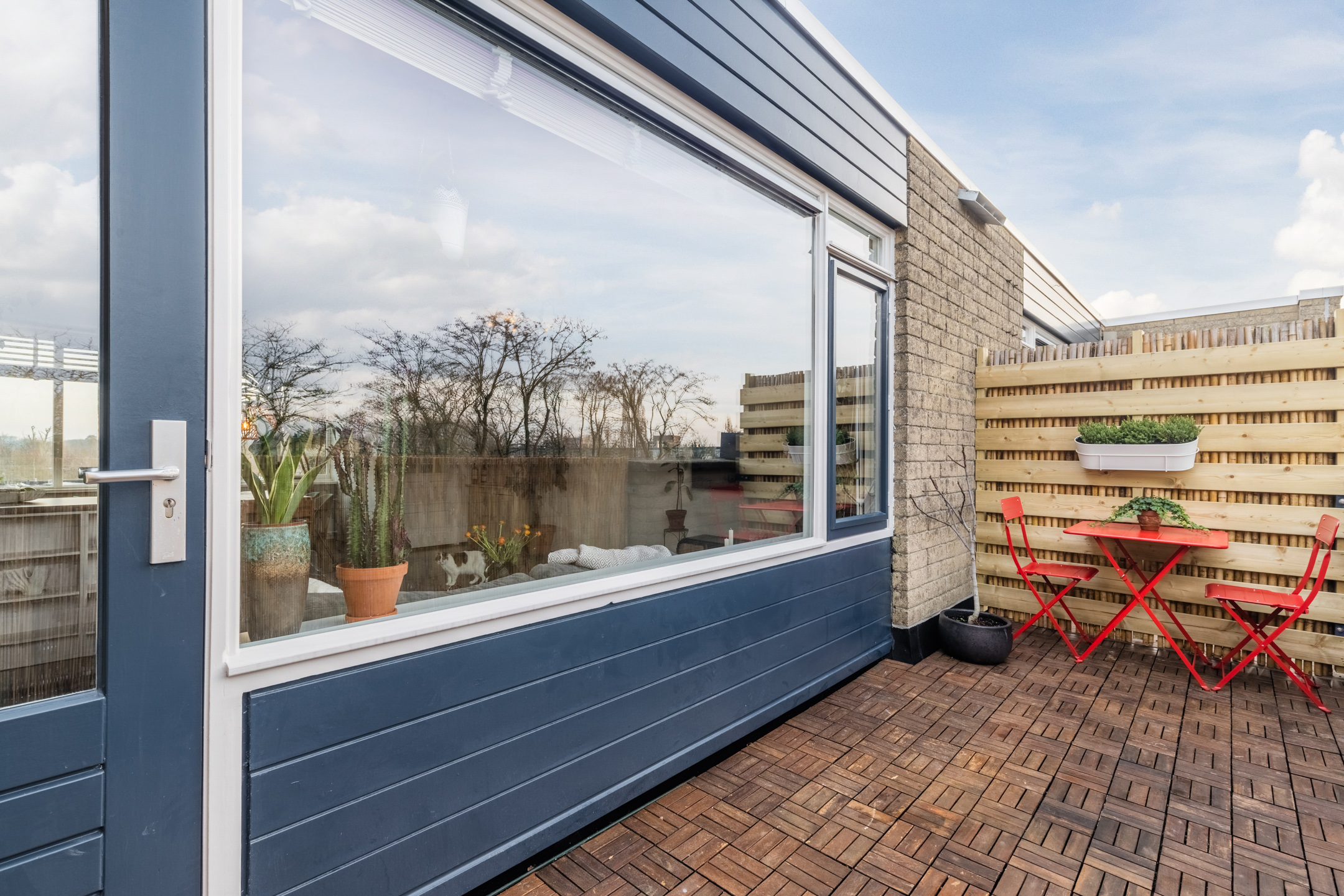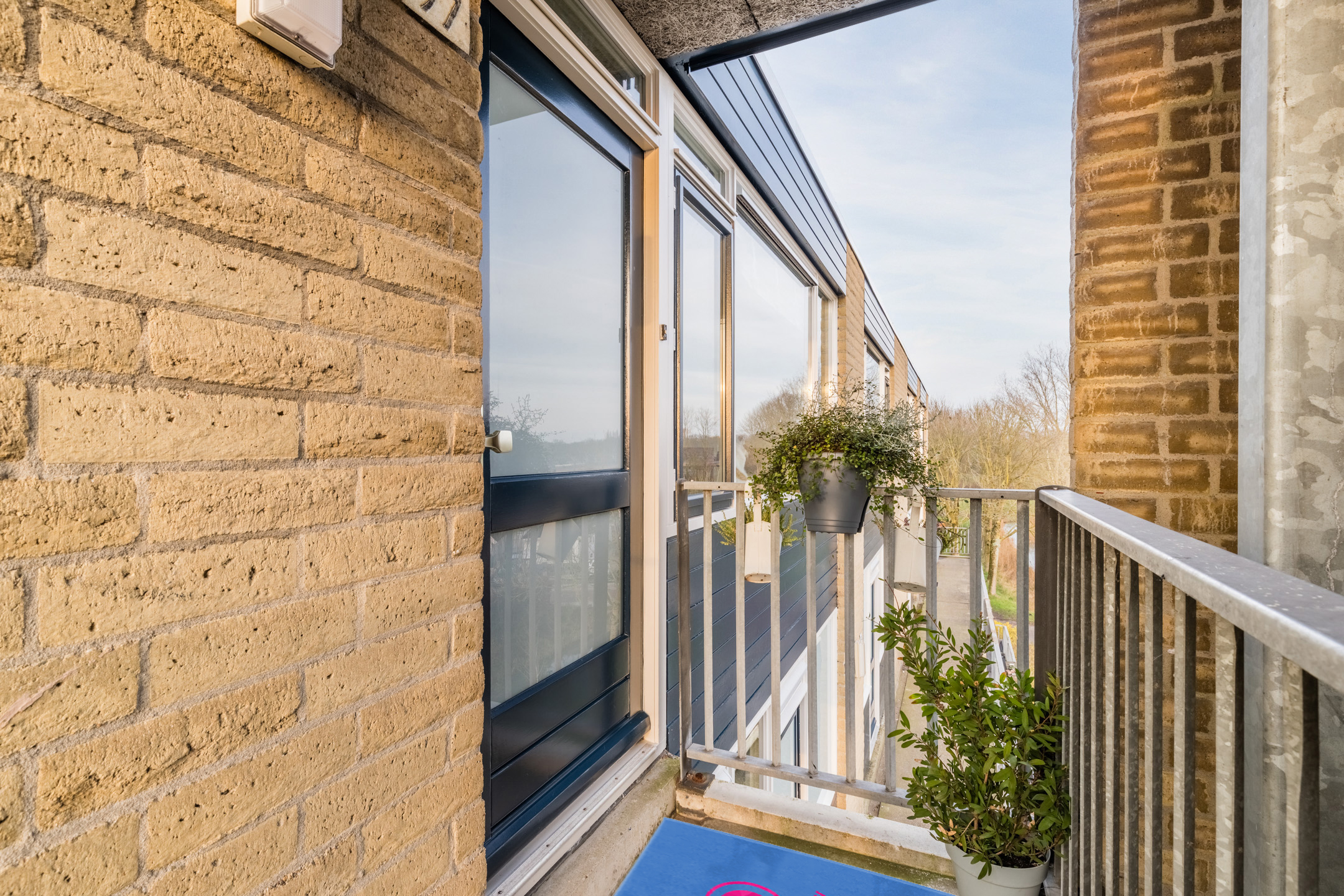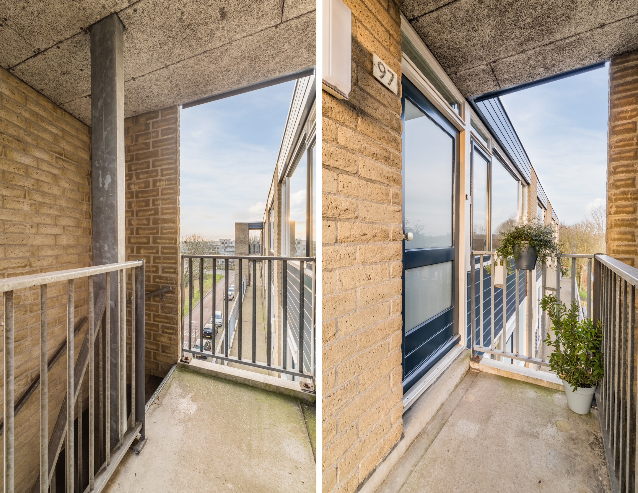Via een deur in de woonkamer bereik je het grote balkon, dat over de volledige breedte van de woonkamer is gesitueerd. Het balkon is gelegen op het zuiden en biedt een fijne plek om buiten te zitten en te genieten van het uitzicht en de rust.